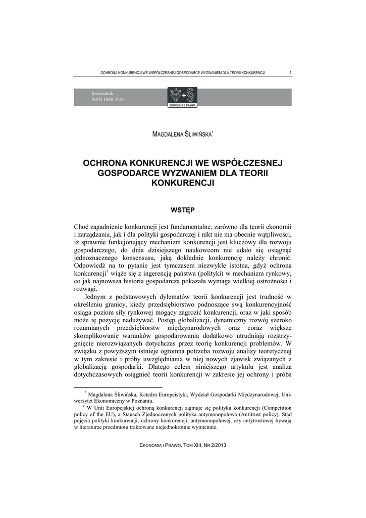 OCHRONA KONKURENCJI WE WSPÓŁCZESNEJ GOSPODARCE WYZWANIEM DLA TEORII KONKURENCJI 1 Kwartalnik ISSN 1898-2255 MAGDALENA ŚLIWIŃSKA* OCHRONA KONKURENCJI WE WSPÓŁCZESNEJ GOSPODARCE WYZWANIEM DLA TEORII KONKURENCJI WSTĘP Choć zagadnienie konkurencji jest fundamentalne, zarówno dla teorii ekonomii i zarządzania, jak i dla polityki gospodarczej i nikt nie ma obecnie wątpliwości, iż sprawnie funkcjonujący mechanizm konkurencji jest kluczowy dla rozwoju gospodarczego, do dnia dzisiejszego naukowcom nie udało się osiągnąć jednoznacznego konsensusu, jaką dokładnie konkurencję należy chronić. Odpowiedź na to pytanie jest tymczasem niezwykle istotna, gdyż ochrona konkurencji1 wiąże się z ingerencją państwa (polityki) w mechanizm rynkowy, co jak najnowsza historia gospodarcza pokazała wymaga wielkiej ostrożności i rozwagi. Jednym z podstawowych dylematów teorii konkurencji jest trudność w określeniu granicy, kiedy przedsiębiorstwo podnoszące swą konkurencyjność osiąga poziom siły rynkowej mogący zagrozić konkurencji, oraz w jaki sposób może tę pozycję nadużywać. Postęp globalizacji, dynamiczny rozwój szeroko rozumianych przedsiębiorstw międzynarodowych oraz coraz większe skomplikowanie warunków gospodarowania dodatkowo utrudniają rozstrzygnięcie nierozwiązanych dotychczas przez teorię konkurencji problemów. W związku z powyższym istnieje ogromna potrzeba rozwoju analizy teoretycznej w tym zakresie i próby uwzględniania w niej nowych zjawisk związanych z globalizacją gospodarki. Dlatego celem niniejszego artykułu jest analiza dotychczasowych osiągnieć teorii konkurencji w zakresie jej ochrony i próba * Magdalena Śliwińska, Katedra Europeistyki, Wydział Gospodarki Międzynarodowej, Uniwersytet Ekonomiczny w Poznaniu. 1 W Unii Europejskiej ochroną konkurencji zajmuje się polityka konkurencji (Competition policy of the EU), a Stanach Zjednoczonych polityka antymonopolowa (Antitrust policy). Stąd pojęcia polityki konkurencji, ochrony konkurencji, antymonopolowej, czy antytrustowej bywają w literaturze przedmiotu traktowane niejednokrotnie wymiennie. EKONOMIA I PRAWO, TOM XIII, NR 2/2013 2 MAGDALENA ŚLIWIŃSKA identyfikacji obszarów i zjawisk stanowiących dla niej obecnie największe wyzwania. 1. ROZWÓJ TEORII KONKURENCJI Zagadnieniem konkurencji zajmowano się od bardzo dawna, przy czym rozwój myśli teoretycznej na ten temat ewaluował od analizy istoty konkurencji i roli w procesie gospodarowania, poprzez rozważania na temat potrzeby jej ochrony po współczesne dylematy związane z istotą procesów konkurencyjnych i możliwościami ograniczania konkurencji w warunkach globalnej gospodarki. 1.1. STAROŻYTNOŚĆ Początki myślenia o konkurencji i władzy gospodarczej można zauważyć u Arystotelesa, który zauważył naturalne predyspozycje człowieka do przejmowania dóbr materialnych. Pochwalał jednak tylko dążenie do takiego bogactwa, które pozwalało na prowadzenie „dobrego życia” w gospodarstwie domowym. Potępiane było natomiast nieograniczone dążenie do powiększania bogactwa, które za cel stawiało sobie tylko akumulację samą w sobie.2 Przeciwko monopolistom prowadzonych było wiele procesów i już w czasach Karola Wielkiego zyski monopolistyczne musiały być zwracane. Monopol uważany był za naruszenie wolności handlowania.3 1.2. NIEWIDZIALNA RĘKA RYNKU I KONKURENCJA DOSKONAŁA „Ojciec współczesnej ekonomii” Adam Smith uważał, że jeżeli zostanie zagwarantowana wolność produkcji i wolność konsumpcji, „niewidzialna ręka rynku” zadba o to, by każdy uczestnik rynku, nawet dbający tylko o własny zysk, przyczyniał się do ogólnego dobrobytu. Za kluczową uznał dużą liczbę konkurentów oraz brak umów między nimi, a do ważniejszych funkcji państwa zaliczył stworzenie ram dla prawidłowego funkcjonowania wolnego rynku i niedopuszczania do jego zaburzeń, bądź ograniczania. Ekonomiści klasyczni zauważyli ogromną praktyczną rolę wolnej konkurencji, za której przeciwieństwo uznali monopol, oraz że pożądana wolna kon2 Starożytni zdawali sobie doskonale sprawę, że osiągnięcie monopolu i wyeliminowanie konkurencji pozwala na szybkie i znaczne wzbogacenie się. Znana jest historia Talesa z Miletu, któremu zarzucano, że jego nauki są do niczego nie przydatne. Wykorzystał on wówczas swą znajomość gwiazd i dowiedziawszy się, że nadchodzi rok wyjątkowo obfitych zbiorów oliwek, wypożyczył wszystkie maszyny do ich wyciskania w dwóch miastach. W okresie zbiorów wydzierżawił je natomiast za bardzo wysokie ceny zbijając w ten sposób fortunę. H.W. de Jong, Dynamische Markttheorie, H. E. Stenfert Kroese B.V., Leiden/Antwerpen 1985, s. 28. 3 Podkreślano również jego kryminalny charakter, ponieważ opierał się na spiskowaniu. Ibidem, s. 27-35. EKONOMIA I PRAWO, TOM XIII, NR 2/2013 OCHRONA KONKURENCJI WE WSPÓŁCZESNEJ GOSPODARCE WYZWANIEM DLA TEORII KONKURENCJI 3 kurencja nie powstaje sama, lecz dla prawidłowego funkcjonowania potrzebuje wsparcia ze strony państwa. Przy braku odpowiedniego nadzoru przedsiębiorcy będą, bowiem, zawsze wystawieni na pokusę ograniczania konkurencji.4 Kontynuację ich poglądów stanowi neoklasyczna analiza konkurencji doskonałej i czystego monopolu z końca XIX wieku, która odegrała ogromną rolę w teorii konkurencji i stanowiła punkt wyjścia dalszych analiz teoretycznych. Oba modele5 są hipotetycznymi sytuacjami skrajnymi, jakie mogłyby zaistnieć na rynku jakiegoś produktu, przy czym model konkurencji doskonałej stanowi ideał, a model czystego monopolu - jego przeciwieństwo. Większość ekonomistów godzi się dzisiaj z tezą, iż zadaniem polityki konkurencji nie jest nawet samo dążenie do stanu konkurencji doskonałej. W rzeczywistości bowiem konkurencja doskonała jest nie tylko niemożliwa do osiągnięcia, ale jej osiągnięcie w praktyce wyeliminowałoby jakąkolwiek konkurencję. St