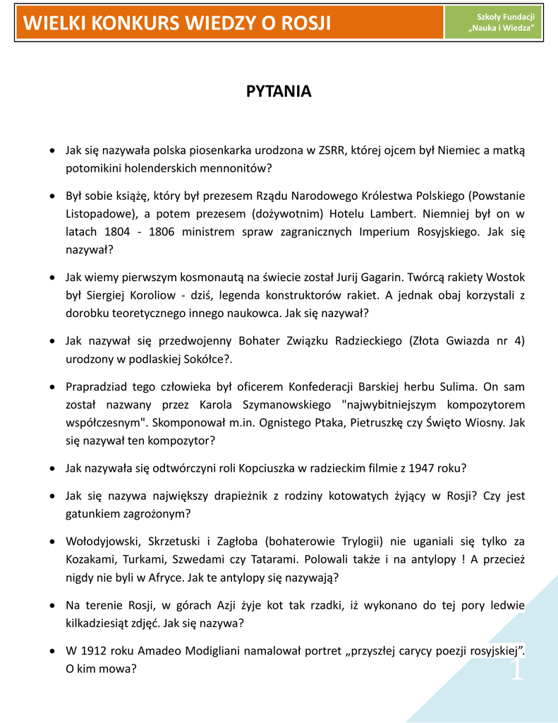 WIELKI KONKURS WIEDZY O ROSJI Szkoły Fundacji „Nauka i Wiedza” PYTANIA Jak się nazywała polska piosenkarka urodzona w ZSRR, której ojcem był Niemiec a matką potomikini holenderskich mennonitów? Był sobie książę, który był prezesem Rządu Narodowego Królestwa Polskiego (Powstanie Listopadowe), a potem prezesem (dożywotnim) Hotelu Lambert. Niemniej był on w latach 1804 - 1806 ministrem spraw zagranicznych Imperium Rosyjskiego. Jak się nazywał? Jak wiemy pierwszym kosmonautą na świecie został Jurij Gagarin. Twórcą rakiety Wostok był Siergiej Koroliow - dziś, legenda konstruktorów rakiet. A jednak obaj korzystali z dorobku teoretycznego innego naukowca. Jak się nazywał? Jak nazywał się przedwojenny Bohater Związku Radzieckiego (Złota Gwiazda nr 4) urodzony w podlaskiej Sokółce?. Prapradziad tego człowieka był oficerem Konfederacji Barskiej herbu Sulima. On sam został nazwany przez Karola Szymanowskiego "najwybitniejszym kompozytorem współczesnym". Skomponował m.in. Ognistego Ptaka, Pietruszkę czy Święto Wiosny. Jak się nazywał ten kompozytor? Jak nazywała się odtwórczyni roli Kopciuszka w radzieckim filmie z 1947 roku? Jak się nazywa największy drapieżnik z rodziny kotowatych żyjący w Rosji? Czy jest gatunkiem zagrożonym? Wołodyjowski, Skrzetuski i Zagłoba (bohaterowie Trylogii) nie uganiali się tylko za Kozakami, Turkami, Szwedami czy Tatarami. Polowali także i na antylopy ! A przecież nigdy nie byli w Afryce. Jak te antylopy się nazywają? Na terenie Rosji, w górach Azji żyje kot tak rzadki, iż wykonano do tej pory ledwie kilkadziesiąt zdjęć. Jak się nazywa? W 1912 roku Amadeo Modigliani namalował portret „przyszłej carycy poezji rosyjskiej”. O kim mowa? 1 WIELKI KONKURS WIEDZY O ROSJI Szkoły Fundacji „Nauka i Wiedza” Co to takiego „Ruska Prawda”? Z jakim mieście urodziła się Katarzyna Wielka? Dlaczego Anglicy nazywają czapkę – kominiarkę „balaclava”? Biełucha (4506 m) nad poziomem morza jest najwyższym szczytem jakich rosyjskich gór? W jakim jeziorze na terenie Rosji – oprócz Bajkalskiego – można spotkać słodkowodną fokę? Który rosyjski car ożenił się z Martą Skowrońską? Gdzie w Rosji znajduje się prawdziwy „biegun zimna” i mieszkają tam ludzie? Jaka jest różnica temperatur pomiędzy latem a zimą w Jakucji? Ilu mieszkańców liczy aglomeracja moskiewska? Jak głęboko sięga najgłębsza stacja moskiewskiego metra? Z kim wygrał bitwę w 1242 roku Aleksander Newski? Czy Rosja jest największym krajem świata? Ile mórz obmywa brzegi Rosji? Jak nazywał się sowiecki i polski marszałek w latach 1949 – 1956 dowódca Wojska Polskiego (urodził się w Warszawie)? Jaki znany poeta i prozaik rosyjski pochodzenia żydowskiego epoki ZSRR urodzony w Warszawie w 1891 roku, został zgładzony w 1938 roku nie za pamflet wykpiwający Stalina, lecz za „Odę do Stalina”? Co to jest Ałmaz? „Jeden dzień Iwana Denisowicza”, „Oddział chorych na raka” należą do pióra jakiego pisarza? Jaki rosyjski noblista w dziedzinie literatury otrzymał w 1993 roku tytuł doktora honoris causa Śląskiego Uniwersytetu w Katowicach? W jakim mieście stoi sobór Wasyla Błogosławionego? 2 WIELKI KONKURS WIEDZY O ROSJI Szkoły Fundacji „Nauka i Wiedza” W jakim mieście występują „Białe noce”? Jacy to notable z przedrewolucyjnej Rosji zamawiali (jako prezenty Wielkanocne) jajka Faberge? 3