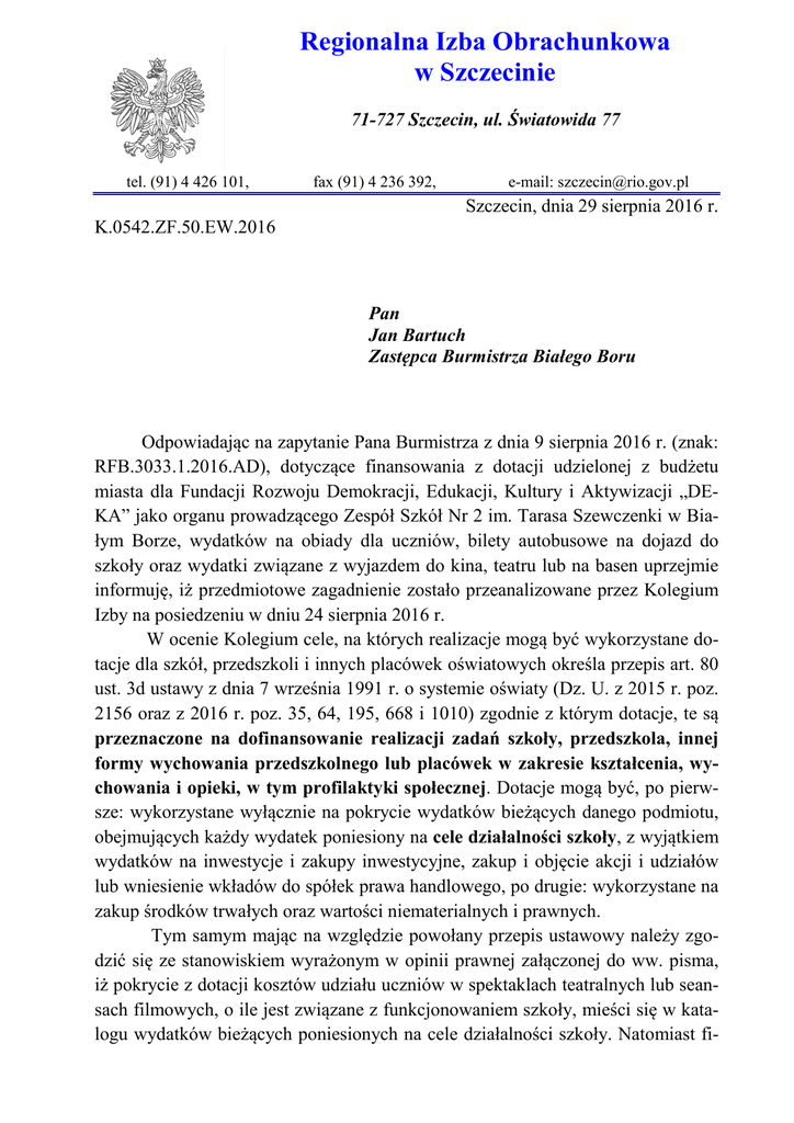 Regionalna Izba Obrachunkowa w Szczecinie 71-727 Szczecin, ul. Światowida 77 tel. (91) 4 426 101, fax (91) 4 236 392, e-mail: [email protected] Szczecin, dnia 29 sierpnia 2016 r. K.0542.ZF.50.EW.2016 Pan Jan Bartuch Zastępca Burmistrza Białego Boru Odpowiadając na zapytanie Pana Burmistrza z dnia 9 sierpnia 2016 r. (znak: RFB.3033.1.2016.AD), dotyczące finansowania z dotacji udzielonej z budżetu miasta dla Fundacji Rozwoju Demokracji, Edukacji, Kultury i Aktywizacji „DEKA” jako organu prowadzącego Zespół Szkół Nr 2 im. Tarasa Szewczenki w Białym Borze, wydatków na obiady dla uczniów, bilety autobusowe na dojazd do szkoły oraz wydatki związane z wyjazdem do kina, teatru lub na basen uprzejmie informuję, iż przedmiotowe zagadnienie zostało przeanalizowane przez Kolegium Izby na posiedzeniu w dniu 24 sierpnia 2016 r. W ocenie Kolegium cele, na których realizacje mogą być wykorzystane dotacje dla szkół, przedszkoli i innych placówek oświatowych określa przepis art. 80 ust. 3d ustawy z dnia 7 września 1991 r. o systemie oświaty (Dz. U. z 2015 r. poz. 2156 oraz z 2016 r. poz. 35, 64, 195, 668 i 1010) zgodnie z którym dotacje, te są przeznaczone na dofinansowanie realizacji zadań szkoły, przedszkola, innej formy wychowania przedszkolnego lub placówek w zakresie kształcenia, wychowania i opieki, w tym profilaktyki społecznej. Dotacje mogą być, po pierwsze: wykorzystane wyłącznie na pokrycie wydatków bieżących danego podmiotu, obejmujących każdy wydatek poniesiony na cele działalności szkoły, z wyjątkiem wydatków na inwestycje i zakupy inwestycyjne, zakup i objęcie akcji i udziałów lub wniesienie wkładów do spółek prawa handlowego, po drugie: wykorzystane na zakup środków trwałych oraz wartości niematerialnych i prawnych. Tym samym mając na względzie powołany przepis ustawowy należy zgodzić się ze stanowiskiem wyrażonym w opinii prawnej załączonej do ww. pisma, iż pokrycie z dotacji kosztów udziału uczniów w spektaklach teatralnych lub seansach filmowych, o ile jest związane z funkcjonowaniem szkoły, mieści się w katalogu wydatków bieżących poniesionych na cele działalności szkoły. Natomiast fi- 2 nansowanie z dotacji obiadów dla uczniów nie mieści się we wskazanym powyżej katalogu wydatków możliwych do pokrycia z dotacji. Jednocześnie wyjaśniam, że powyższe stanowisko nie jest wiążącą wykładnią prawa lecz prezentuje pogląd na problemy przedstawione w Pana piśmie.