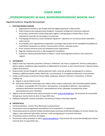 DZIEŃ ZIEMI „RÓŻNORODNOŚĆ W NAS, BIORÓŻNORODNOŚĆ WOKÓŁ NAS”. Regulamin konkursu- fotografia lub prezentacja I. POSTANOWIENIA OGÓLNE 1. Organizatorem konkursu jest Zespół Szkół Ponadgimnazjalnych w Kleszczowie 2. Celem konkursu jest popularyzacja fotografii, rozwijanie umiejętności tworzenia własnych prezentacji, poszerzanie wiedzy dotyczącej regionu i występującej w okolicy flory i fauny, wzbudzanie szacunku do otaczającej nas przyrody 3. Przystępując do konkursu uczeo akceptuje regulamin i zapewnia, że nie narusza praw autorskich osób trzecich 4. W przypadku prac nagrodzonych organizator zastrzega sobie prawo do ich nieodpłatnej publikacji w materiałach związanych ze szkołą z zaznaczeniem imienia i nazwiska autora 5. Prace zostaną ocenione przez jury powołane przez organizatora 6. Nagrody zostaną przyznane w obu kategoriach niezależnie 7. Uczestnicy zostaną powiadomieniu o miejscu i czasie rozstrzygnięcia konkursu oraz wręczeniu nagród. II. FOTOGRAFIA 1. Zdjęcie może byd wykonana aparatem cyfrowym, telefonem lub innym urządzeniem. Komisja zadecyduje o jakości zdjęcia, możliwości jego wywołania w odpowiednim formacie, co jest równoznaczne z dopuszczeniem zdjęcia do konkursu. 2. Dopuszczalne tematy fotografii: wybrany gatunek roślin, zwierząt, grzybów występujących w okolicy,, krajobraz najbliższej okolicy szkoły: Kleszczów, Łuszczanowice, w szczególności Rezerwat Łuszczanowice 3. Osoba uczestnicząca w konkursie tworzy folder podpisany własnym imieniem i nazwiskiem, w którym znajduje się: a) Zdjęcie w wersji elektronicznej b) Dokument tekstowy zawierający opis zdjęcia: data i miejsce wykonania, opis (charakterystyka) obiektu na zdjęciu; w przypadku flory lub fauny- opis gatunku, w przypadku krajobrazu- typ krajobrazu, wskazanie elementów naturalnych i wprowadzonych przez człowieka, konsekwencje zmian wprowadzonych przez człowieka 4. Zdjęcie w formie elektronicznej należy przesyład na adres [email protected] lub przynosid do nauczyciela biologii pani Joanny Durki do dnia 13 maja 2010 roku. 5. Najlepsze fotografie zostaną wywołane; trzy pierwsze miejsca otrzymają nagrody. III. 1. 2. 3. PREZENTACJA Temat prezentacji „Fauna i flora Rezerwatu Łuszczanowice” Prezentacje można przygotowad samodzielnie lub w zespołach 2- 3 osobowych. Prezentacja powinna zawierad krótką charakterystykę rezerwatu (materiały dostępne na stronie szkoły) oraz zdjęcia i opis wybranych gatunków zwierząt i roślin występujących na terenie rezerwatu 4. Prezentacja zawiera minimum 20 slajdów 5. Prezentacje należy przesyład na adres [email protected] lub przynosid do nauczyciela biologii pani Joanny Durki do dnia 13 maja 2010 roku.