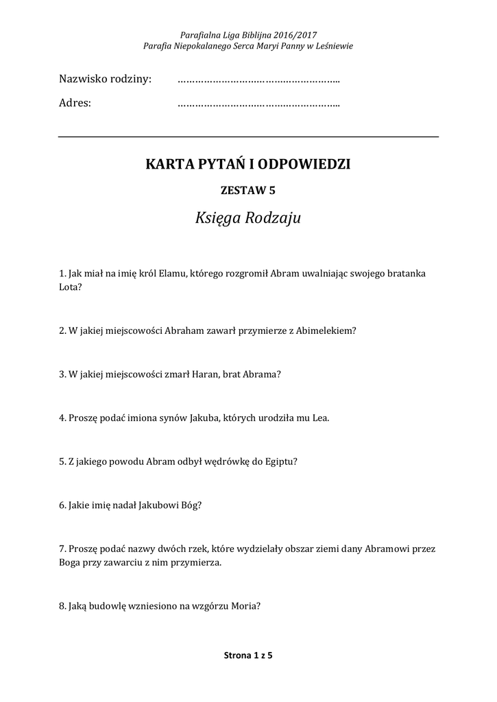 Parafialna Liga Biblijna 2016/2017 Parafia Niepokalanego Serca Maryi Panny w Leśniewie Nazwisko rodziny: ……………………………………………….. Adres: ……………………………………………….. KARTA PYTAŃ I ODPOWIEDZI ZESTAW 5 Księga Rodzaju 1. Jak miał na imię król Elamu, którego rozgromił Abram uwalniając swojego bratanka Lota? 2. W jakiej miejscowości Abraham zawarł przymierze z Abimelekiem? 3. W jakiej miejscowości zmarł Haran, brat Abrama? 4. Proszę podać imiona synów Jakuba, których urodziła mu Lea. 5. Z jakiego powodu Abram odbył wędrówkę do Egiptu? 6. Jakie imię nadał Jakubowi Bóg? 7. Proszę podać nazwy dwóch rzek, które wydzielały obszar ziemi dany Abramowi przez Boga przy zawarciu z nim przymierza. 8. Jaką budowlę wzniesiono na wzgórzu Moria? Strona 1 z 5 Parafialna Liga Biblijna 2016/2017 Parafia Niepokalanego Serca Maryi Panny w Leśniewie 9. Do jakiego kraju został sprzedany przez swoich braci Józef? 10. Proszę podać imię syna Abrama zrodzonego z niewolnicy Hagar. 11. Ile dni trwało balsamowanie ciała Izraela? 12. Proszę podać grecki odpowiednik hebrajskiego słowa „toledot”. 13. Proszę podać imię pierwszego syna Jakuba i Racheli. 14. Za jaką wartość Abraham kupił miejsce, w którym pochował swoją żonę Sarę? 15. Co zerwała Ewa w rajskim ogrodzie? 16. Co miało pozostawać znakiem przymierza zawartego przez Boga z Abramem? 17. Przez ile dni mieszkańcy Egiptu opłakiwali śmierć Jakuba? 18. Proszę podać imiona synów Adama i Ewy wymienione w Księdze Rodzaju. 19. O ocalenie jakiego miasta targował się z Bogiem Abraham? 20. Co miało być pokarmem dla zwierząt polnych oraz ptactwa zgodnie z poleceniem Boga? 21. Skórami jakich zwierząt był okryty Jakub, by oszukać swego ojca i uzyskać błogosławieństwo? Strona 2 z 5 Parafialna Liga Biblijna 2016/2017 Parafia Niepokalanego Serca Maryi Panny w Leśniewie 22. Co Rachela ukradła Labanowi? 23. Proszę podać nazwę linii rodowej, z której wywodził się Abraham. 24. Jaką nazwę nadano miastu, w którym schronił się Lot uchodząc z Sodomy i Gomory? 25. O ile lat syn niewolnicy Hagar był starszy od pierwszego syna Sary, żony Abrahama? 26. Jaka część ciała Jakuba doznała urazu podczas walki w Penuel? 27. Dzięki czemu człowiek, z natury śmiertelny, stał się nieśmiertelny zgodnie z opisem Księgi Rodzaju? 28. Jak miał na imię urzędnik faraona, któremu sprzedany został Józef, syn Jakuba? 29. Na jakim polu znajdowała się pieczara, w której został pochowany Jakub? 30. Jak miała na imię córka Jakuba? 31. Które drzewo rosło pośrodku rajskiego ogrodu? 32. Kim dla Tamar był Juda? 33. Ile łokci wysokości miała mierzyć arka, którą polecił zbudować Noemu Bóg? Strona 3 z 5 Parafialna Liga Biblijna 2016/2017 Parafia Niepokalanego Serca Maryi Panny w Leśniewie 34. Co miały symbolizować trzy gałązki we śnie, który przyśnił się w więzieniu głównemu podczaszemu? 35. Którego dnia zostało stworzone Słońce zgodnie z opisem zawartym w Księdze Rodzaju? 36. Co symbolizowało siedem pięknych krów we śnie faraona? 37. Czyją żoną była Silla? 38. Jak miał na imię ojciec Noego? 39. W jakim wieku umarł Józef, syn Jakuba? 40. Z jakiego drzewa w rajskim ogrodzie Bóg zakazał spożywać człowiekowi? 41. Ile dni Noe przebywał w arce? 42. Ilu braci Józefa przybyło za pierwszym razem do Egiptu, by zaopatrzyć się w żywność? 43. Proszę podać imiona dwóch postaci biblijnych, którzy otrzymali od Boga przywilej wyłączenia spod naturalnego prawa śmierci? 44. Co znaczy mezopotamskie słowo, od którego nazwę bierze rajski ogród? 45. Ile lat miał Ezaw, gdy wziął sobie za żonę Jehudit? Strona 4 z 5 Parafialna Liga Biblijna 2016/2017 Parafia Niepokalanego Serca Maryi Panny w Leśniewie 46. Jak miał na imię najsławniejszy na ziemi myśliwy wspomniany w Księdze Rodzaju? 47. Jak nazywała się ziemia, w której osiadła rodzina Józefa przybyła do Egiptu? 48. Ile opisów stworzenia człowieka odnaleźć można w Księdze Rodzaju? 49. Którzy z dwunastu synów Jakuba nie byli jego biologicznymi synami? 50. Co miało pozostać znakiem zawartego przymierza noachickiego? 51. Z jakiego miasta pochodziła Rebeka, żona Izaaka? 52. Proszę podać nazwę rzeki z rajskiego ogrodu, która okrąża cały kraj Kusz. 53. Jak miał na imię syn Jakuba, a brat Józefa pochodzący od tej samej matki? 54. Z czego Adam i Ewa zrobili sobie przepaski, gdy dostrzegli, że są nadzy? 55. Proszę podać imiona dwóch synów Izaaka. KARTĘ Z NANIESIONYMI ODPOWIEDZIAMI NALEŻY DOSTARCZYĆ W NIEDZIELĘ, 5 LUTEGO, DO ZAKRYSTII I ODEBRAĆ KOLEJNY ZESTAW Strona 5 z 5