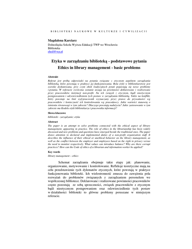 BIBLIOTEKI NAUKOWE W KULTURZE I CYWILIZACJI Magdalena Karciarz Dolno l ska Szkoła Wy sza Edukacji TWP we Wrocławiu Biblioteka [email protected] Etyka w zarz dzaniu bibliotek - podstawowe pytania Ethics in library management - basic problems Abstrakt Referat jest prób odpowiedzi na pytania zwi zane z etycznym aspektem zarz dzania bibliotek , które powstaj w praktyce jej funkcjonowania. Rola etyki w bibliotekarstwie jest szeroko dyskutowana, przy czym obok tradycyjnych pyta pojawiaj si nowe problemy i pytania. W referacie zwrócona zostanie uwaga na powinno ci deklarowane i realizowane przez pracowników instytucji non-profit. Na ich zwi zek z etycznym, b d nieetycznym post powaniem i odzwierciedleniem tych postaw w zarz dzaniu bibliotek . Tak e na konflikt, który powstaje na linii szef-pracownik wyznaczany przez prawo do prywatno ci wg pracowników i konieczno ich kontrolowania wg pracodawcy. Jakie warto ci stanowi o istnieniu równowagi w tym zakresie? Dlaczego powstaj nadu ycia? Jakie zastosowanie w tym zakresie ma Kodeks etyki bibliotekarza i pracownika informacji? Słowa kluczowe biblioteki - zarz dzanie; etyka Abstract The paper is an attempt to solve problems connected with the ethical aspect of library management, appearing in practice. The role of ethics in the librarianship has been widely discussed and new problems and questions have emerged beside the traditional ones. The paper draws attention to declared and implemented duties of a non-profit organization staff. It describes the influence of their ethical or unethical behavior on the library management, as well as the conflict between the employer and employees based on the right to privacy versus the need to monitor respectively. What values can introduce balance? Why are there corrupt practices? How can the Code of ethics of a librarian and information worker be applied? Key words library management – ethics Schemat zarz dzania obejmuje takie etapy jak: planowanie, organizowanie, motywowanie i kontrolowanie. Refleksje teoretyczne maj na celu przedstawienie tych dylematów etycznych, które powstaj w praktyce funkcjonowania biblioteki. Ich wielostronno zmusza do zaw enia pola rozwa a do problemów zwi zanych z zarz dzaniem personelem we współczesnej bibliotece. Deklarowane i realizowane powinno ci pracowników cz sto pozostaj ze sob sprzeczno ci, zwi zek pracowników z etycznym b d nieetycznym post powaniem oraz odzwierciedlenie tych postaw w działalno ci biblioteki to główne problemy poruszane w niniejszym referacie. Etyka w zarz dzaniu bibliotek – podstawowe pytania 319 Nazw „etyka” oznacza si : 1. teori powinno ci moralnej; 2. teori faktycznie uznawanych w okre lonym rodowisku społecznym (etos), a cz sto tak e praktykowanych w nim norm moralnych post powania (moralno ); 3. prze wiadczenia i praktyki moralne danej społeczno ci i jej poszczególnych przedstawicieli1. Etyka zawodowa natomiast okre la zespół norm wyznaczaj cych okre lone obowi zki moralne zwi zane z wykonywanym zawodem i społecznymi stosunkami zawodowymi2. Nikogo ju nie dziwi wprowadzanie do ró nego typu instytucji programów etycznych. Biblioteki reaguj c na zmiany zachodz ce w zarz dzaniu, równie realizuj projekty maj ce na celu kodyfikacj norm etycznych niezb dnych w ich działalno ci. Programy etyczne maj na celu ujednolicenie zasad moralnych wyznawanych przez poszczególnych pracowników zatrudnionych w danej placówce. Zasady te kształtuj si w procesie do wiadcze ludzi wykonuj cych powierzone im obowi zki lub s wynikiem polityki opracowanej przez dan instytucj . Na program etyczny składa si : 1. sformalizowany kodeks zawieraj cy standardy etyczne; 2. szkolenia, na których ze standardami tymi zapoznawani s wszyscy pracownicy; 3. komórka etyczna, której zadaniem jest monitoring przestrzegania zasad etycznych i ich ci głe doskonalenie3. Tak skonstruowane programy etyczne pełni funkcj zewn trzn i wewn trzn . Ich funkcja zewn trzna polega na budowaniu i podtrzymywaniu dobrego wizerunku organizacji wraz z rosn c samo wiadomo ci wpływu oceny publicznej na działalno instytucji. Funkcja wewn trzna natomiast systematyzuje etyczny wymiar obowi zków zawodowych, misji organizacji, oraz u wiadamia, e subiektywna ocena post powania nie stanowi o profesjonalizmie gdy „etyczne post powanie jest nie tylko kwesti wra liwo ci moralnej , ale tak e wiedzy”4. Ogólnym celem programu etycznego jest: niedopuszczenie do nieetycznych zachowa , ich wykrywanie, ujawnianie oraz korygowanie zgodnie z obowi zuj cymi przepisami. Prace zwi zane z projektem Kodeksu etyki bibliotekarza i pracownika informacji wyznaczaj kierunek działa osób wykonuj cych ten zawód. Według wskaza fundament warto ci moralnych okre laj cych współczesn misj zawodu stanowi : − ochrona warto ci intelektualnej; − prawo do swobodnego wyra ania my li; 1 Powszechna encyklopedia filozofii, t. 3. Lublin 2002, s. 269. Filozofia: leksykon PWN. Warszawa 2000, s. 121. Lewicka-Strzałecka A.: Etyczne standardy firm i pracowników. Warszawa 1999, s. 66. 4 Tam e, s. 68. 2 3 Magdalena Karciarz 320 − − prawo do swobodnego dost pu do wiedzy, informacji i kultury; przestrzeganie zasad neutralno ci w sprawach ideologii, ycia politycznego i religii5. Istotn rol w tym procesie stanowi osoba zarz dzaj ca bibliotek . Zarz dzanie, kierowanie, kontrolowanie oraz ocenianie nale y do typowych działa zawodowych mened era. Dlatego te mened er powinien by liderem działa zgodnych z warto ciami etycznymi i prawnymi obowi zuj cymi w danej organizacji. Osobowo osoby zarz dzaj cej bibliotek (lub inn organizacj ) tworz elementy składowe, ukształtowane w procesie edukacyjnym oraz poprzez zdobywane do wiadczenie zawodowe. W programach uczelni kształc cych przyszłych adeptów zawodu bibliotekarza i pracownika informacji naukowej pojawiaj si przedmioty obejmuj ce etyczne zagadnienia dotycz ce zarz dzania bibliotek . Rosn ca wiadomo nowych pokole oraz zmiany, które zachodz w postrzeganiu bibli