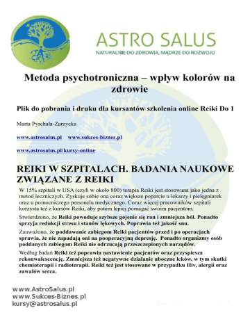 Metoda psychotroniczna – wpływ kolorów na zdrowie Plik do pobrania i druku dla kursantów szkolenia online Reiki Do 1 Marta Pyrchała-Zarzycka www.astrosalus.pl www.sukces-biznes.pl www.astrosalus.pl/kursy-online REIKI W SZPITALACH. BADANIA NAUKOWE ZWIĄZANE Z REIKI W 15% szpitali w USA (czyli w około 800) terapia Reiki jest stosowana jako jedna z metod leczniczych. Zyskuje sobie ona coraz większe poparcie u lekarzy i pielęgniarek oraz u pomocniczego personelu medycznego. Coraz więcej pracowników szpitali korzysta też z kursów Reiki, aby potem lepiej pomagać swoim pacjentom. Stwierdzono, że Reiki powoduje szybsze gojenie się ran i zmniejsza ból. Ponadto sprzyja redukcji stresu i stanów lękowych. Poprawia też jakość snu. Zauważono, że poddawanie zabiegom Reiki pacjentów przed i po operacjach sprawia, że nie zapadają oni na pooperacyjną depresję. Ponadto organizmy osób poddanych zabiegom Reiki nie odrzucają przeszczepionych narządów. Według badań Reiki też poprawia nastawienie pacjentów oraz przyspiesza rekonwalescencję. Zmniejsza też negatywne działanie uboczne leków, w tym skutki chemioterapii i radioterapii. Reiki też jest stosowane w przypadku Hiv, alergii oraz zawałów serca. Lekarze amerykańscy również są na "tak" wobec terapii Reiki. Na przykład dr Cantwell stwierdza: "Stwierdziłem, że Reiki może być przydatne w leczeniu ostrych schorzeń, takich jak uszkodzenia narządu, ból głowy, ostre infekcje oraz astma. Reiki jest również przydatna dla pacjentów z chorobami przewlekłymi, zwłaszcza tych związanych z przewlekłym bólem. ". Dokonano wielu badań związanych z leczeniem chorób za pomocą Reiki. Na przykład: Badanie naukowe w Hartford Hospital w Hartford, Connecticut wskazują, że: Reiki poprawia jakość snu pacjenta o 86 procent, zmniejsza ból o 78 procent, zmniejsza nudności o 80 procent i lęk w czasie ciąży o 94 proc. Oto wykresy obrazujące wyniki tych badań: Według badań Karin Olson i John Hanson (1997) "Korzystanie z Reiki do zarządzania bólem. Profilaktyka i kontrola nowotworów," nad zastosowaniem Reiki w przewlekłym bólu zaś Reiki może mieć duże znaczenie w redukcji bólu, w tym w przypadku nowotworów. Badaniu poddało się 20 osób w wieku od 23 do 62 lat. Skalę bólu badano za pomocą metody VAS i Likerta. Po jednym zabiegu Reiki ulgę odczuło 17 uczestników w skali VAS i 18 uczestników w skali Likerta. Poniżej wyniki badań i ich źródło: http://www.statsci.org/data/general/reiki.txt VAS.before VAS.after 6 3 2 1 2 1 2 1 2 0 3 0 9 1 3 1 3 0 2 0 3 2 2 2 4 1 2 1 5 2 3 1 2 2 2 1 3 0 2 0 5 1 3 1 1 0 1.5 0 6 4 2 1 6 1 2 2 4 4 2 1 4 1 2 1 7 6 4 3 2 1 2 1 4 3 2 1.5 8 8 3.5 3 Zarządzający szpitalami chętnie wprowadzają Reiki do swoich usług, gdyż dzięki tej prostej terapii obniżają koszty związane ze stosowaniem drogich leków i technik, a leczenie jest skuteczne.