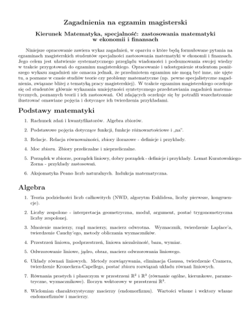 Zagadnienia na egzamin magisterski Kierunek Matematyka, specjalność: zastosowania matematyki w ekonomii i finansach Niniejsze opracowanie zawiera wykaz zagadnień, w oparciu o które będą formułowane pytania na egzaminach magisterskich studentów specjalności zastosowania matematyki w ekonomii i finansach. Jego celem jest ułatwienie systematycznego przeglądu wiadomości i podsumowania swojej wiedzy w trakcie przygotowań do egzaminu magisterskiego. Opracowanie i udostępnienie studentom poniższego wykazu zagadnień nie oznacza jednak, że przedmiotem egzaminu nie mogą być inne, nie ujęte tu, a poznane w czasie studiów teorie czy problemy matematyczne (np. pewne specjalistyczne zagadnienia, związane bliżej z tematyką pracy magisterskiej). W trakcie egzaminu magisterskiego oczekuje się od studentów głównie wykazania umiejętności syntetycznego przedstawiania zagadnień matematycznych, poznanych teorii i ich zastosowań. Od zdających oczekuje się by potrafili wszechstronnie ilustrować omawiane pojęcia i dotyczące ich twierdzenia przykładami. Podstawy matematyki 1. Rachunek zdań i kwantyfikatorów. Algebra zbiorów. 2. Podstawowe pojęcia dotyczące funkcji, funkcje różnowartościowe i „na”. 3. Relacje. Relacja równoważności, zbiory ilorazowe - definicje i przykłady. 4. Moc zbioru. Zbiory przeliczalne i nieprzeliczalne. 5. Porządek w zbiorze, porządek liniowy, dobry porządek - definicje i przykłady. Lemat KuratowskiegoZorna - przykłady zastosowań. 6. Aksjomatyka Peano liczb naturalnych. Indukcja matematyczna. Algebra 1. Teoria podzielności liczb całkowitych (NWD, algorytm Euklidesa, liczby pierwsze, kongruencje). 2. Liczby zespolone - interpretacja geometryczna, moduł, argument, postać trygonometryczna liczby zespolonej. 3. Mnożenie macierzy, rząd macierzy, macierz odwrotna. Wyznacznik, twierdzenie Laplace’a, twierdzenie Cauchy’ego, metody obliczania wyznaczników. 4. Przestrzeń liniowa, podprzestrzeń, liniowa niezależność, baza, wymiar. 5. Odwzorowanie liniowe, jądro, obraz, macierz odwzorowania liniowego. 6. Układy równań liniowych. Metody rozwiązywania, eliminacja Gaussa, twierdzenie Cramera, twierdzenie Kroneckera-Capellego, postać zbioru rozwiązań układu równań liniowych. 7. Równania prostych i płaszczyzn w przestrzeni R2 i R3 (równanie ogólne, kierunkowe, parametryczne, wyznacznikowe). Iloczyn wektorowy w przestrzeni R3 . 8. Wielomian charakterystyczny macierzy (endomorfizmu). Wartości własne i wektory własne endomorfizmów i macierzy. 9. Funkcjonały dwuliniowe - istnienie bazy ortogonalnej, funkcjonały dodatnio określone, kryterium Sylvestera, ortogonalizacja Schmidta, iloczyn skalarny, nierówność Schwarza. 10. Grupy - definicja i podstawowe przykłady (grupa addytywna liczb całkowitych i jej podgrupy, grupy permutacji i ich generatory, grupy reszt modulo n). Homomorfizmy i izomorfizmy grup. Podgrupy, dzielniki normalne, grupy ilorazowe. 11. Pierścienie - definicja i podstawowe przykłady (pierścień liczb całkowitych, pierścienie wielomianów, pierścienie macierzy kwadratowych nad danym ciałem, pierścienie reszt modulo n). Ideały, ideały pierwsze i maksymalne, pierścienie ilorazowe. 12. Ciała - definicja i podstawowe przykłady (ciała liczb rzeczywistych i zespolonych, ciała skończone Fp ). Ciała algebraicznie domknięte. Zasadnicze twierdzenie algebry. Analiza matematyczna 1. Definicja aksjomatyczna zbioru liczb rzeczywistych. Kresy zbiorów. Zasada Archimedesa, część całkowita liczby rzeczywistej. 2. Pojęcie ciągu liczbowego i jego granicy. Podstawowe twierdzenia dotyczące granic ciągów. Podciągi i punkty skupienia. Twierdzenie Bolzano-Weierstrassa. Zasada zupełności Cauchy’ego. 3. Pojęcie szeregu liczbowego. Podstawowe kryteria zbieżności szeregów liczbowych. 4. Granica i ciągłość funkcji. Podstawowe własności funkcji ciągłych, w tym na przestrzeniach zwartych i spójnych. 5. Pochodna funkcji jednej zmiennej. Interpretacja geometryczna pochodnej. Zastosowanie rachunku różniczkowego do badania przebiegu zmienności funkcji jednej zmiennej (przedziały monotoniczności, ekstrema lokalne, wypukłość i punkty przegięcia). 6. Twierdzenia Rolle’a i Lagrange’a. Wzór Taylora dla funkcji jednej zmiennej. Zastosowania do obliczania przybliżeń funkcji. 7. Zbieżność punktowa i jednostajna ciągu i szeregu funkcyjnego. Szereg potęgowy. Rozwijanie funkcji w szereg potęgowy. 8. Pojęcie funkcji pierwotnej i podstawowe metody całkowania. 9. Całka Riemanna (definicja, podstawowe własności, zastosowania). Podstawowe twierdzenie rachunku różniczkowego i całkowego, wzór Newtona-Leibniza. 10. Różniczkowanie odwzorowań przestrzeni euklidesowych, pochodne: cząstkowe, słaba, mocna. Podstawowe twierdzenia dotyczące pochodnych odwzorowań. Ekstrema lokalne. 11. Twierdzenie o funkcji uwikłanej oraz o lokalnym odwracaniu odwzorowań. Ekstrema związane (warunkowe). 12. Całkowanie funkcji wielu zmiennych - całki iterowane, zamiana zmiennych (współrzędne biegunowe, sferyczne i walcowe). 13. Miara Lebesgue’a. Całka Lebesgue’a i jej związek z całką Riemanna. 14. Całki krzywoliniowe i powierzchniowe. Topologia i elementy przestrzeni metrycznych 1. Pojęcie metryki oraz przestrzeni metrycznej. Przykłady przestrzeni metrycznych. 2. Zbieżność w przestrzeni metrycznej. Pojęcie zbioru otwartego i domkniętego w przestrzeni metrycznej. Pojęcie ciągłości odwzorowań przestrzeni metrycznych. 3. Pojęcie przestrzeni metrycznej spójnej, zwartej oraz zupełnej i ich własności. Charakteryzacja zbioru zwartego w przestrzeni Rn . Zasada Banacha o punkcie stałym dla kontrakcji. 4. Przestrzenie topologiczne i przekształcenia ciągłe. 5. Operacje na przestrzeniach topologicznych: podprzestrzenie, produkt, przestrzeń ilorazowa. 6. Aksjomaty oddzielania. 7. Przestrzenie topologiczne zwarte, przestrzenie topologiczne spójne. Analiza zespolona 1. Fu