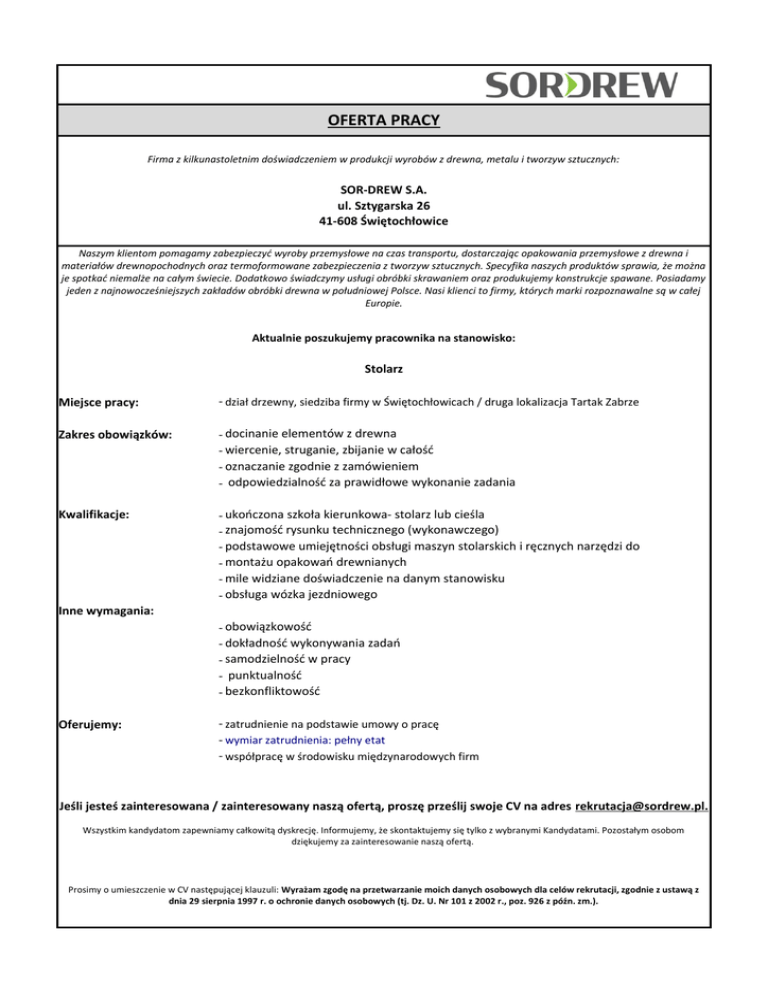 OFERTA PRACY Firma z kilkunastoletnim doświadczeniem w produkcji wyrobów z drewna, metalu i tworzyw sztucznych: SOR-DREW S.A. ul. Sztygarska 26 41-608 Świętochłowice Naszym klientom pomagamy zabezpieczyć wyroby przemysłowe na czas transportu, dostarczając opakowania przemysłowe z drewna i materiałów drewnopochodnych oraz termoformowane zabezpieczenia z tworzyw sztucznych. Specyfika naszych produktów sprawia, że można je spotkać niemalże na całym świecie. Dodatkowo świadczymy usługi obróbki skrawaniem oraz produkujemy konstrukcje spawane. Posiadamy jeden z najnowocześniejszych zakładów obróbki drewna w południowej Polsce. Nasi klienci to firmy, których marki rozpoznawalne są w całej Europie. Aktualnie poszukujemy pracownika na stanowisko: Stolarz Miejsce pracy: - dział drzewny, siedziba firmy w Świętochłowicach / druga lokalizacja Tartak Zabrze Zakres obowiązków: - docinanie elementów z drewna - wiercenie, struganie, zbijanie w całość - oznaczanie zgodnie z zamówieniem - odpowiedzialność za prawidłowe wykonanie zadania Kwalifikacje: - ukończona szkoła kierunkowa- stolarz lub cieśla - znajomość rysunku technicznego (wykonawczego) - podstawowe umiejętności obsługi maszyn stolarskich i ręcznych narzędzi do - montażu opakowań drewnianych - mile widziane doświadczenie na danym stanowisku - obsługa wózka jezdniowego Inne wymagania: - obowiązkowość - dokładność wykonywania zadań - samodzielność w pracy - punktualność - bezkonfliktowość Oferujemy: - zatrudnienie na podstawie umowy o pracę - wymiar zatrudnienia: pełny etat - współpracę w środowisku międzynarodowych firm Jeśli jesteś zainteresowana / zainteresowany naszą ofertą, proszę prześlij swoje CV na adres [email protected]. Wszystkim kandydatom zapewniamy całkowitą dyskrecję. Informujemy, że skontaktujemy się tylko z wybranymi Kandydatami. Pozostałym osobom dziękujemy za zainteresowanie naszą ofertą. Prosimy o umieszczenie w CV następującej klauzuli: Wyrażam zgodę na przetwarzanie moich danych osobowych dla celów rekrutacji, zgodnie z ustawą z dnia 29 sierpnia 1997 r. o ochronie danych osobowych (tj. Dz. U. Nr 101 z 2002 r., poz. 926 z późn. zm.).