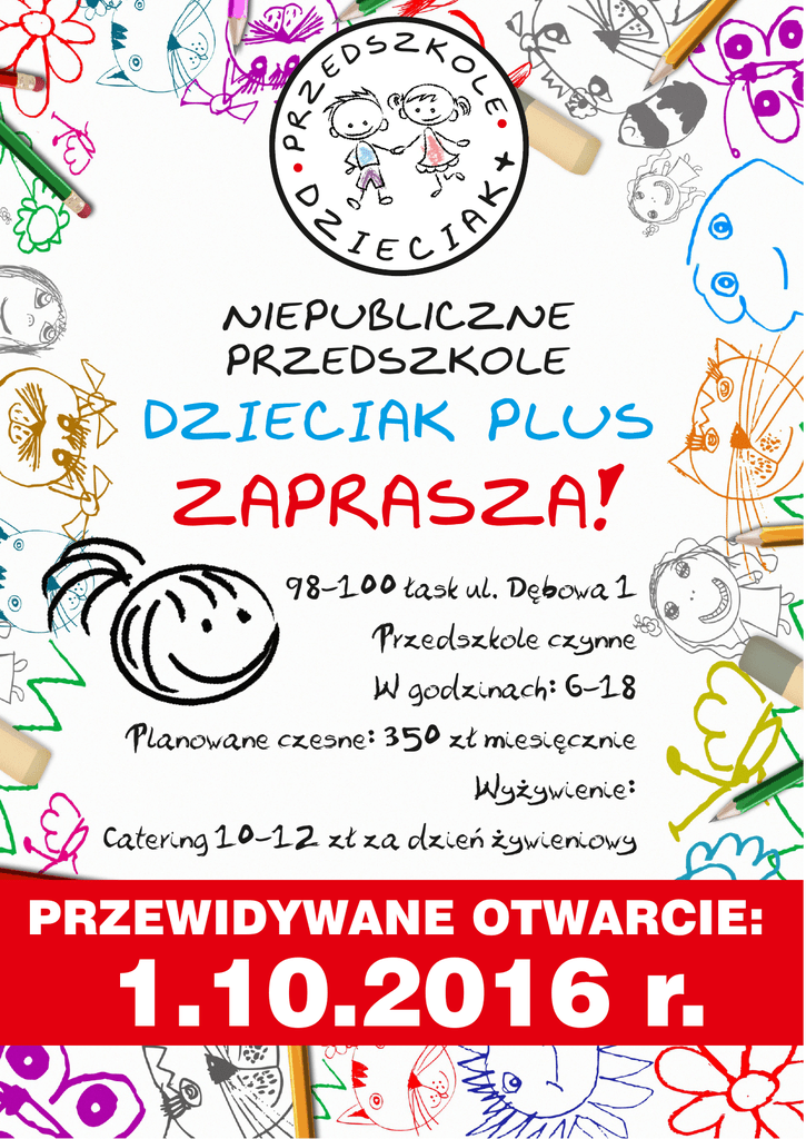 + PRZ LE SZKO D E Niepubliczne przedszkole DZIECIAK PLUS zaprasza! 98-100 łask ul. Dębowa 1 Przedszkole czynne W godzinach: 6-18 Planowane czesne: 350 zł miesięcznie Wyżywienie: Catering 10-12 zł za dzień żywieniowy PRZEWIDYWANE OTWARCIE: 1.10.2016 r. Będziemy realizować podstawę programową wychowania przedszkolnego. Zapewniamy zajęcia dodatkowe: KIDS TALK - j. angielski KLUB NAUKOWCA - doświadczenia i zabawy badawcze ŚPIEWOGRANIE - zajęcia rytmiczno-muzyczne SZTUKA ŚWIATA - warsztaty plastyczne z edukacją międzykulturową MATPLANETA - edukacja matematyczna AKTYWATOR - zajęcia sportowe ZDROWIE OD KUCHNI - gotowanie z dziećmi HIP-HOP-SA-SA - zajęcia taneczne NEMO* - zajęcia basenowe AKADEMIA MAŁYCH BALETNIC* - balet ALE CYRK* - warsztaty cyrkowo-teatralne KARATE KID* - karate KLIK* - zajęcia komputerowe KINDER LIEDER* - j. niemiecki KONTAKT: ALEKSANDRA OWCZAREK 608-44-91-19 [email protected] *zajęcia uzależnione od liczby chętnych