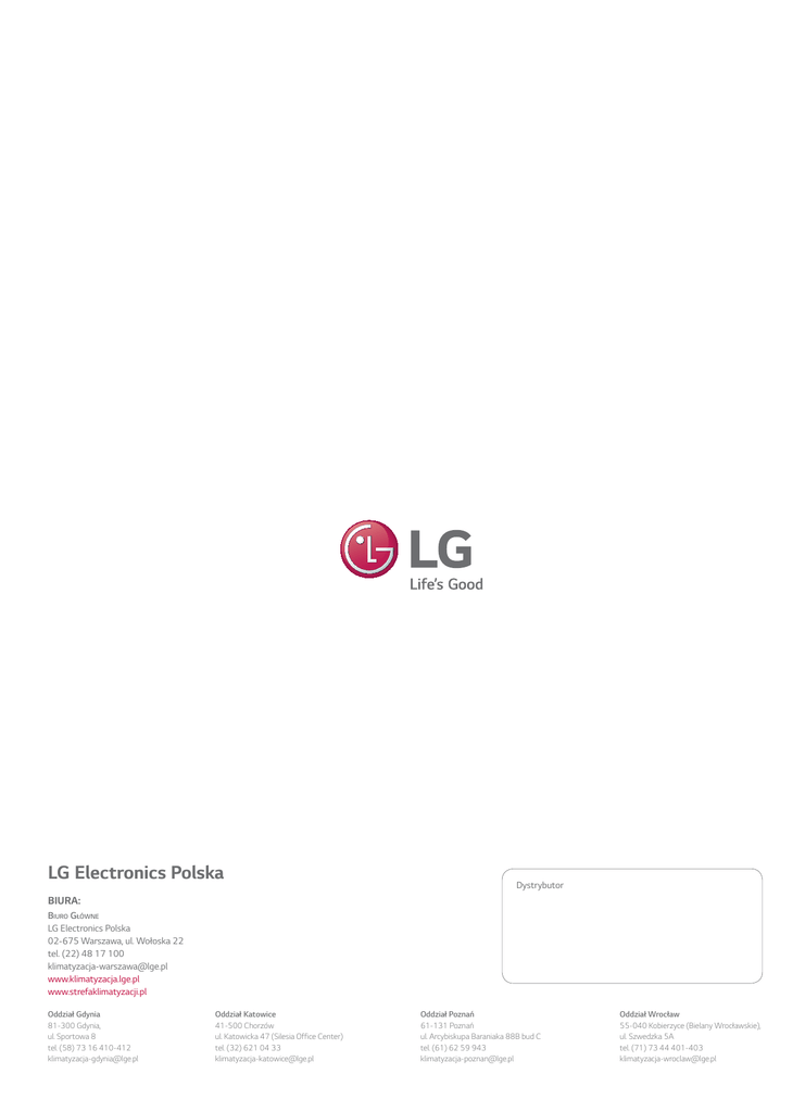 LG Electronics Polska Dystrybutor BIURA: BIURO GŁÓWNE LG Electronics Polska 02-675 Warszawa, ul. Wołoska 22 tel. (22) 48 17 100 [email protected] www.klimatyzacja.lge.pl www.strefaklimatyzacji.pl Oddział Gdynia 81-300 Gdynia, ul. Sportowa 8 tel. (58) 73 16 410-412 [email protected] Oddział Katowice 41-500 Chorzów ul. Katowicka 47 (Silesia Office Center) tel. (32) 621 04 33 [email protected] Oddział Poznań 61-131 Poznań ul. Arcybiskupa Baraniaka 88B bud C tel. (61) 62 59 943 [email protected] Oddział Wrocław 55-040 Kobierzyce (Bielany Wrocławskie), ul. Szwedzka 5A tel. (71) 73 44 401-403 [email protected] Kompletne rozwiązania klimatyzacji 2 0 1 5 C E N N I K www.klimatyzacja.lge.pl K L I M A T o b o w i ą z u j e Y o d Z A T O R Y 01 l u t e g o L G 2 015 Spis treści 4 8 Pokojowe Komercyjne 15 16 Synchro Multi 24 26 Rekuperatory ecoV Akcesoria 31 Opis ikon ARTCOOL Stylist nadaje styl i unikalny charakter w każdym wnętrzu 4 Element wystroju wnętrza ARTCOOL Stylist wypełni Twoją przestrzeń stylem, nadając mu niepowtarzalny charakter. 3-kierunkowy delikatny nawiew Funkcja delikatnego nawiewu zapewnia naturalną, delikatną cyrkulację powietrza w całym pomieszczeniu. Podświetlenie LED Szeroki wybór koloru czy intensywności podświetlenia umożliwiający wyrażenie praktycznie każdego nastroju. 5 Klimatyzator y LG • POKOJOWE • Model Wydajność chłodnicza / grzewcza (kW) Klasa sezonowej wydajności energetycznej chłodzenie / grzanie G09WL 2,5 / 3,0 A+ / A G12WL 3,5 / 3,5 A+ / A Cena jednostki netto (PLN) G09WL.NS3 2 400 G09WL.UL2 2 900 G12WL.NS3 2 800 G12WL.UL2 3 600 Jednostka wewn. Jednostka zewn. Cena jednostki netto (PLN) H09AL.NSM 1 900 H09AL.UE1 2 600 Cena kompletu netto (PLN) 5 300 6 400 Wi-Fi G09WL G09 WL / G12W G G12WL 12WLL Model Wydajność chłodnicza / grzewcza (kW) Klasa sezonowej wydajności energetycznej chłodzenie / grzanie H09AL 2,5 / 3,2 A+++ / A+++ H12AL 3,5 / 4,0 A+++ / A+++ Cena kompletu netto (PLN) ! E Y W ETR NOAM R PA Jednostka wewn. Jednostka zewn. H12AL.NSM 2 000 H12AL.UE1 2 900 4 500 4 900 17dB Wi-Fi H09AL / H12AL Model Wydajność chłodnicza / grzewcza (kW) Klasa sezonowej wydajności energetycznej chłodzenie / grzanie A09LL 2,5 / 3,2 A++ / A+ A12LL 3,5 / 4,0 A++ / A+ Jednostka wewn. Jednostka zewn. Cena jednostki netto (PLN) A09LL.NSN 1 900 A09LL.UL2 2 600 A12LL.NSN 2 000 A12LL.UL2 2 900 Cena kompletu netto (PLN) 4 500 4 900 19dB Wi-Fi A09LL / A12L A09LL A A12LL 12LL 2LL Model Wydajność chłodnicza / grzewcza (kW) Klasa sezonowej wydajności energetycznej chłodzenie / grzanie A18RL 5,2 / 6,3 A++ / A Jednostka wewn. Jednostka zewn. Cena jednostki netto (PLN) A18RL.NSC 2 900 A18RL.UUE 3 000 Cena kompletu netto (PLN) 5 900 19dB A1 RLL A18RL A18 6 Wi-Fi Uwaga: klasa wydajności energetycznej mierzona: w trybie chłodzenia współczynnikiem SEER, w trybie grzania współczynnikiem SCOP. Urządzenia zawierają fluorowane gazy cieplarniane. K l i m a t y z a t o r y LG D12CM 3,5 / 4,0 A++ / A++ D18CM 5,0 / 5,8 A++ / A+ D24CM 6,6 / 7,5 A++ / A+ D09CM.NSJ 1 700 D09CM.UL2 1 700 D12CM.NSJ 1 800 D12CM.UL2 1 800 D18CM.NSK 2 400 D18CM.UL2 3 200 D24CM.NSK 3 200 D24CM.UUE 3 700 3 400 3 600 5 600 Model Klasa sezonowej wydajności energetycznej chłodzenie / grzanie P09RL 2,5 / 3,2 A++ / A P12RL 3,5 / 3,8 A++ / A P18EL 5,0 / 5,8 A++ / A+ P24EL 6,8 / 8,0 A++ / A D18CM D18 CM / D24C D D24CM 24CM 24C M Jednostka wewn. Jednostka zewn. Cena jednostki netto (PLN) P09RL.NSB 1 450 P09RL.UA3 1 450 P12RL.NSB 1 600 P12RL.UA3 1 600 P18EL.NS2 2 100 P18EL.UL2 2 900 P24EL.NS2 2 800 P24EL.UUE 3 400 Cena kompletu netto (PLN) 2 900 3 200 P09RL P09 09RL / P12R PP12RL 12RLL 12R 5 000 6 200 P18EL P18 8EL / P2 PP24EL 24EL 24EL Wi-Fi Model Wydajność chłodnicza / grzewcza (kW) Klasa sezonowej wydajności energetycznej chłodzenie / grzanie E09EM 2,5 / 3,2 A+ / A E12EM 3,5 / 3,8 A+ / A E18EM 5,0 / 5,4 A/A Jednostka wewn. Jednostka zewn. Cena jednostki netto (PLN) E09EM.NSW 900 E09EM.UA3 1 500 E12EM.NSH 1 000 E12EM.UA3 1 600 E18EM.NSM 1 800 E18EM.UL2 2 000 Cena kompletu netto (PLN) 2 400 2 600 UJ36 E09EM E09 EM / E12E EE12EM 12EM 12E M 3 800 Wi-Fi UJ30 D09 D09CM 09CM CM / D12CM D12C D12C 12CM M 6 900 Wi-Fi Wydajność chłodnicza / grzewcza (kW) Deluxe Sirius Ć! A++ / A++ Cena kompletu netto (PLN) NO 2,5 / 3,2 Cena jednostki netto (PLN) OŚ D09CM Jednostka wewn. Jednostka zewn. W Klasa sezonowej wydajności energetycznej chłodzenie / grzanie NO Model Wydajność chłodnicza / grzewcza (kW) W OŚ Ć! • POKOJOWE • E18EM E18 EM Ścienne jednostki big capacity, tj: UJ30/UU30W (7,8 / 8,4 kW) oraz UJ36/UU37W (9,5 / 10,5 kW) dostępne są w typoszeregu klimatyzatorów komercyjnych na stronie 14 cennika. Uwaga: klasa wydajności energetycznej mierzona: w trybie chłodzenia współczynnikiem SEER, w trybie grzania współczynnikiem SCOP. Urządzenia zawierają fluorowane gazy cieplarniane. 7 Klimatyzator y LG • KOMERCYJNE • Technologia wentylatora BLDC Wydajność (%) Wentylator z silnikiem prądu stałego BLDC zapewnia większą oszczędność energii nawet do 40% przy niskich prędkościach oraz do 20% przy dużych prędkościach, w porównaniu z silnikami zasilanymi prądem zmiennym. 100 80 Silnik prądu stałego 60 20 % wzrost 40% 40 wzrost Silnik prądu zmiennego 20 0 200 400 600 Silnik wentylatora BLDC 1,000 800 Ilość obrotów silnika (obr./min) Sprężarka BLDC o wysokiej wydajności Wydajność (%) Zakres częstotliwości pracy (Hz) Klimatyzator inwerterowy LG jest wyposażony w sprężarkę napędzaną silnikiem prądu stałego (BLDC), w którym zastosowano silne magnesy neodymowe. Dzięki temu jego wydajność jest znacznie wyższa w porównaniu z klimatyzatorem inwerterowym na prąd zmienny.* 100 4% 8% 20 15 Konwencjonalna 40 Nowa 60 80 Częstotliwość (Hz) Tryb pracy nocnej Poziom hałasu w trybie pracy nocnej może być obniżony poprzez ustawienie przełącznika na płycie PCB jednostki zewnętrznej, zapewniając jak najbardziej komfortowe warunki