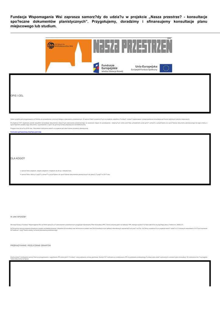 Fundacja Wspomagania Wsi zaprasza samorz?dy do udzia?u w projekcie „Nasza przestrze? - konsultacje spo?eczne dokumentów planistycznych”. Przygotujemy, doradzimy i sfinansujemy konsultacje planu miejscowego lub studium. OPIS I CEL Celem projektu jest przygotowanie urz?dników do prowadzenia i promocji dialogu w planowaniu przestrzennym. W samorz?dach uczestnicz?cych w projekcie, wspólnie z Fundacj?, zostan? zaplanowane i przeprowadzone konsultacje spo?eczne wybranych planów miejscowych. W projekcie b?d? wspierane przede wszystkim konsultacje dokumentów dotycz?cych planowania przestrzennego na wczesnym etapie ich powstawania - obejmuj?cym okres pomi?dzy uchwaleniem przez gmin? uchwa?y o przyst?pieniu do sporz?dzania dokumentu planistycznego lub jego zmiany a sporz?dzeniem projektu tego dokumentu i wyst?pieniem o opini? do gminnej komisji urbanistyczno-architektonicznej. Program trwa do ko?ca 2018 roku. Warunkiem rozliczenia udzia?u w projekcie jest zako?czenie procedury planistycznej. Formularz zg?oszeniowy dost?pny jest tutaj DLA KOGO? samorz?dów wiejskich, miejsko-wiejskich i miejskich do 20 tys. mieszka?ców, samorz?dów, które ju? podj??y uchwa?? o przyst?pieniu do sporz?dzenia dokumentów planistycznych lub planuj? j? podj?? w 2017 roku W JAKI SPOSÓB? We wspó?pracy z Fundacj? Wspomagania Wsi urz?dnik zajmuj?cy si? planowaniem przestrzennym przygotuje Indywidualny Plan Konsultacji (IPK). Gmina otrzyma grant na realizacj? IPK, którego wysoko?? b?dzie zale?a?a od przyj?tego planu (?rednio ok. 26000 z?). Ka?da gmina otrzyma wsparcie doradcze w postaci architekta/urbanisty i eksperta od konsultacji oraz techniczne w postaci narz?dzi konsultacji w tym aplikacji internetowych usprawniaj?cych prac? urz?du. Urz?dnicy uczestnicz?cy w projekcie wezm? udzia? w 2-3 dniowych warsztatach s?u??cych wymianie do?wiadcze? i pog??bianiu wiedzy na temat planowania przestrzennego. PRZEKAZYWANIE I ROZLICZANIE GRANTÓW Granty zostan? przekazane samorz?dom po przygotowaniu i uzgodnieniu IPK przez gmin? i Fundacj?, oraz podpisaniu umowy grantowej. Granty b?d? rozliczane po zrealizowaniu IPK na podstawie przekazanego Fundacji opisu zada? wykonanych w ramach planu konsultacji. Do rozliczenia nie s? wymagane ?adne dokumenty ksi?gowe. JAK SI? ZG?OSI?? Formularz dost?pny jest tutaj Po przes?aniu formularza otrzymaj? Pa?stwo wys?an? na podany mail ankiet? z pytaniami dotycz?cymi sytuacji planistycznej w gminie oraz przyjmowanym planem miejscowym. Na tej podstawie, a tak?e na podstawie rozmów i spotka? podejmiemy decyzj? o zakwalifikowaniu do projektu. Nabór prowadzony jest w trybie ci?g?ym, do wyczerpania miejsc. KONTAKT Projekt realizuje zespó? Fundacji Wspomagania Wsi. Wszelkie pytanie prosimy kierowa? do: Krystian Po?omski ([email protected]), Jacek Pietrusiak ([email protected]) lub na adres [email protected]. O PROJEKCIE I O PROGRAMIE Projekt „Nasza przestrze? - konsultacje spo?eczne planów miejscowych na wsi i w ma?ych miastach” realizowany jest w ramach Programu Operacyjnego Wiedza Edukacja Rozwój 2014-2020 wspó?finasowanego ze ?rodków Europejskiego Funduszu Spo?ecznego. Powered by TCPDF (www.tcpdf.org)