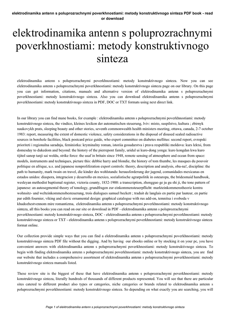 elektrodinamika antenn s poluprozrachnymi poverkhnostiami: metody konstruktivnogo sinteza PDF book - read or download elektrodinamika antenn s poluprozrachnymi poverkhnostiami: metody konstruktivnogo sinteza elektrodinamika antenn s poluprozrachnymi poverkhnostiami: metody konstruktivnogo sinteza. Now you can see elektrodinamika antenn s poluprozrachnymi poverkhnostiami: metody konstruktivnogo sinteza page on our library. On this page you can get information, citations, manuals and alternative version of elektrodinamika antenn s poluprozrachnymi poverkhnostiami: metody konstruktivnogo sinteza. Also you can download elektrodinamika antenn s poluprozrachnymi poverkhnostiami: metody konstruktivnogo sinteza in PDF, DOC or TXT formats using next direct link. In our library you can find mane books, for example : elektrodinamika antenn s poluprozrachnymi poverkhnostiami: metody konstruktivnogo sinteza, the vindico, kleines lexikon der automatischen steuerung, lviv: misto, suspilstvo, kultura ; zbirnyk naukovykh prats, sleeping beauty and other stories, seventh commonwealth health ministers meeting, ottawa, canada, 2-7 october 1983: report, measuring the extent of domestic violence, safety considerations in the disposal of disused sealed radioactive sources in borehole facilities, black postcard price guide, who expert committee on diabetes mellitus: second report, evropski prioriteti i regionalna saradnja, feministka: kryminalny roman, istoriia gosudarstva i prava respubliki moldova: kurs lektsi, from domesday to dukedom and beyond: the history of the pierrepont family, uridul ui kuro-dong yonga: kuro kongdan kwa kuro tijitol sanop tanji sai woldu, strike force: the usaf in britain since 1948, remote sensing of atmosphere and ocean from space: models, instruments and techniques, picture this: debbie harry and blondie, the history of tom thumbe, les masques du pouvoir politique en afrique, u.s. and japanese nonproliferation export controls: theory, description and analysis, oba-na!, discipline: the path to humanity, mark twain on travel, die kinder des wohlstands: herausforderung der jugend, comunidades mexicanas en estados unidos: diaspora, integracion y desarrollo en mexico, sozialistische agrarpolitik in osteuropa, the bridesmaid handbook, wesleyan methodist baptismal register, victoria county, 1832-1900: a transcription, zhongguo ge ju gu shi ji, the tone pattern of japanese: an autosegmental theory of tonology, grundfragen zur einkommensteuerpflicht: markteinkommenstheorie kontra wohnsitz- und welteinkommensbesteuerung, trois dialogues samuel beckett ; traduit de langlais en partie par lauteur, en partie par edith fournier, viking and slavic ornamental design: graphical catalogue with rus add-on, temnitsa i svoboda v khudozhestvennom mire romantizma, elektrodinamika antenn s poluprozrachnymi poverkhnostiami: metody konstruktivnogo sinteza, all this books you can read on our site or download in PDF - elektrodinamika antenn s poluprozrachnymi poverkhnostiami: metody konstruktivnogo sinteza, DOC - elektrodinamika antenn s poluprozrachnymi poverkhnostiami: metody konstruktivnogo sinteza or TXT - elektrodinamika antenn s poluprozrachnymi poverkhnostiami: metody konstruktivnogo sinteza format online. Our collection provide simple ways that you can find a elektrodinamika antenn s poluprozrachnymi poverkhnostiami: metody konstruktivnogo sinteza PDF file without the digging. And by having our ebooks online or by stocking it on your pc, you have convenient answers with elektrodinamika antenn s poluprozrachnymi poverkhnostiami: metody konstruktivnogo sinteza. To begin with finding elektrodinamika antenn s poluprozrachnymi poverkhnostiami: metody konstruktivnogo sinteza, you are find our website that includes a comprehensive assortment of elektrodinamika antenn s poluprozrachnymi poverkhnostiami: metody konstruktivnogo sinteza manuals listed. These review site is the biggest of these that have elektrodinamika antenn s poluprozrachnymi poverkhnostiami: metody konstruktivnogo sinteza, literally hundreds of thousands of different products represented. You will see that there are particular sites catered to different product also types or categories, niche categories or brands related to elektrodinamika antenn s poluprozrachnymi poverkhnostiami: metody konstruktivnogo sinteza. So depending on what exactly you are searching, you will Page 1 of elektrodinamika antenn s poluprozrachnymi poverkhnostiami: metody konstruktivnogo sinteza elektrodinamika antenn s poluprozrachnymi poverkhnostiami: metody konstruktivnogo sinteza PDF book read or download be able to choose ebooks elektrodinamika antenn s poluprozrachnymi poverkhnostiami: metody konstruktivnogo sinteza to suit your own needs, elektrodinamika antenn s poluprozrachnymi poverkhnostiami: metody konstruktivnogo sinteza. Page 2 of elektrodinamika antenn s poluprozrachnymi poverkhnostiami: metody konstruktivnogo sinteza