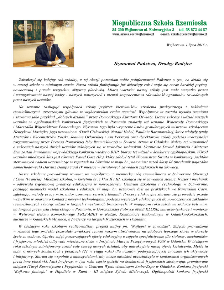 Wejherowo, 1 lipca 2015 r. Szanowni Państwo, Drodzy Rodzice Zakończył się kolejny rok szkolny, z tej okazji pozwalam sobie poinformować Państwa o tym, co działo się w naszej szkole w minionym czasie. Nasza szkoła funkcjonuje już dziewiąty rok i staje się coraz bardziej prężną, nowoczesną i przede wszystkim aktywną placówką. Miarą wartości naszej szkoły jest nade wszystko praca i zaangażowanie naszej kadry - naszych nauczycieli i niemal stuprocentowa zdawalność egzaminów zawodowych przez naszych uczniów. Na uznanie zasługuje współpraca szkoły poprzez kierowników szkolenia praktycznego z zakładami rzemieślniczymi zrzeszonymi głównie w wejherowskim cechu rzemiosł. Współpraca ta została wysoko oceniona i stawiana jako przykład „dobrych działań” przez Pomorskiego Kuratora Oświaty. Liczne sukcesy i udział naszych uczniów w ogólnopolskich konkursach fryzjerskich w Poznaniu znalazły też uznanie Wojewody Pomorskiego i Marszałka Województwa Pomorskiego. Wyrazem tego było wręczenie listów gratulacyjnych mistrzowi szkolącemu Henrykowi Mosiejko, jego uczennicom (Darii Cisłowskiej, Natalii Hebel, Paulinie Baranowskiej, które zdobyły tytuły Mistrzów i Wicemistrzów Polski, Joannie Orłowskiej i Ani Perszon) oraz dyrektorowi szkoły podczas uroczystości zorganizowanej przez Prezesa Pomorskiej Izby Rzemieślniczej w Dworze Artusa w Gdańsku. Należy też wspomnieć o sukcesach naszych dwóch uczniów szkolących się w zawodzie stolarskim. Uczniowie Dawid Jakimcio i Mateusz Styn zostali laureatami wojewódzkiego konkursu wiedzy o BHP, biorąc też udział w konkursie ogólnopolskim. Wśród uczniów młodszych klas jest również Paweł Gosz (IIc), który zdobył tytuł Wicemistrza Świata w konkurencji jachtów sterowanych radiem uczestnicząc w regatach na Ukrainie w maju br., natomiast uczeń klasy Id (mechanik pojazdów samochodowych) Dariusz Damps zajął IV miejsce w światowych zawodach żeglarskich na Słowacji. Nasze szkolenie prowadzimy również we współpracy z niemiecką izbą rzemieślniczą w Schwerinie (Niemcy) i Caen (Francja). Młodzież szkolna, w kwietniu br. z klas II i III, szkoląca się w zawodach stolarz, fryzjer i mechanik - odbywała tygodniową praktykę edukacyjną w nowoczesnym Centrum Szkolenia i Technologii w Schwerinie, poznając niemiecki model szkolenia i edukacji. W maju br. uczniowie byli na praktykach we francuskim Caen, zgłębiając metody pracy m.in. autoryzowanym serwisie Renault. Procesy edukacyjne staramy się prowadzić przede wszystkim w oparciu o kontakt z nowymi technologiami podczas wycieczek edukacyjnych do nowoczesnych zakładów rzemieślniczych i biorąc udział w targach i wystawach branżowych. W mijającym roku szkolnym stolarze byli m.in. na targach przemysłu stolarskiego w Poznaniu, w Gościcińskiej Fabryce Mebli KLOSE, murarze-tynkarze i monterzy w Wytwórni Betonu Komórkowego PREFABET w Redzie, Kombinacie Budowlanym w Gdańsku-Kokoszkach, kucharze w Gdańskich Młynach, a fryzjerzy na targach fryzjerskich w Poznaniu. W bieżącym roku szkolnym realizowaliśmy projekt unijny pn. "Najlepsi w zawodzie". Zajęcia prowadzone w ramach tego projektu pozwalały zwiększyć szansę naszym absolwentom na zdobycie lepszego startu w dorosłe życie zawodowe. Oprócz zajęć poszerzających ofertę edukacyjną o zajęcia specjalistyczne dla stolarzy, mechaników i fryzjerów, młodzież odbywała miesięczne staże w Instytucie Maszyn Przepływowych PAN w Gdańsku. W bieżącym roku szkolnym zainicjowany został cały szereg nowych działań, aby uatrakcyjnić naszą ofertę kształcenia. Myślę tu m.in. o nowych konkursach i pokazach (21 w ciągu roku) dla uczniów podwyższających znacznie ich aktywność i inicjatywę. Staram się wspólnie z nauczycielami, aby nasza młodzież uczestniczyła w konkursach organizowanych przez inne placówki. Nasi fryzjerzy, w tym roku często gościli na konkursach fryzjerskich zdobywając premiowane miejsca (Targi Kosmetyczne i Fryzjerskie w Centrum Wystawienniczym AmberExpo w Gdańsku, Konkurs fryzjerski "Bajkowa fantazja" w Hipolicie w Rumi - III miejsce Sylwia Mielewczyk, Ogólnopolski konkurs fryzjerski Bursztynowy Grzebień - Ania Perszon - I miejsce, Konkurs Fryzjerstwa Artystycznego w Gdyni - Maria Czereda - III miejsce, Kewin Karczewski - IV miejsce, nie zapominając o Ogólnopolskich Mistrzostwach Fryzjerstwa, na którym nasze uczennice Daria Cisłowska i Natalia Hebel zdobyły tytuł Mistrza i Wicemistrza Polski). Dla naszej młodzieży przygotowaliśmy w tym roku bogatą ofertę zajęć dodatkowych rozwijających ich uzdolnienia i zainteresowania (kółko fryzjerskie, stolarskie, kucharskie, motoryzacyjne, budowlane, informatyczne, recytatorskie, muzyczne sportowo-rekreacyjne, językowe, biblioteczne, historyczne, aerobik), jak i dających możliwość uzupełniania zaległości w nauce. Młodzież uczestniczy w różnego rodzaju uroczystościach o charakterze patriotyczno-religijnym (na cmentarzach leśnych w Białej, w Lesie Piaśnickim, apele rocznicowe). Najważniejszym świętem naszej organizacji rzemieślniczej jest święto patrona rzemiosła św. Józefa, kiedy to młodzież wspólnie z rzemieślnikami uczestniczy w przemarszu przez miasto kultywując nasze rzemieślnicze tradycje. Z satysfakcją muszę podkreślić, że dzięki mądrej i dalekosiężnej polityce naszego organu prowadzącego Zarządu Powiatowego Cechu Rzemiosł MiŚP w Wejherowie dokonaliśmy otwarcia nowej pracowni gastronomicznej i wyposażenia jej w nowoczesny sprzęt, wszystko dla naszych uczniów. Pracownia ta pozwoli młodzieży kształcącej się w zawodzie kucharza i cukiernika doskonalenie swoich umiejętności praktycznych. Planujemy w następnym roku przeprowadzenie egzaminu potwierdzającego kwalifikacje w zawodzie w naszej szkole dla kucharzy i sprzedawców. Priorytetem dla mnie i moich nauczycieli jest ciągłe doposażanie naszych sal lekcyjnych i pr