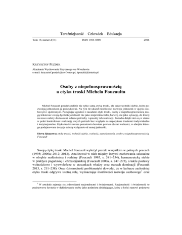 Teraźniejszość – Człowiek – Edukacja Tom 19, numer 2(74) ISSN 1505-8808 2016 KRZYSZTOF PEZDEK Akademia Wychowania Fizycznego we Wrocławiu e-mail: [email protected], [email protected] Osoby z niepełnosprawnością a etyka troski Michela Foucaulta Michel Foucault poddał analizie nie tylko samą etykę troski, ale także techniki siebie, które pozwalają jednostkom ją praktykować. Na tym tle ukazał możliwości rozwoju jednostek w ujęciu osobowym i społecznym. Postępując zgodnie z zasadami etyki troski, osoby z niepełnosprawnością mogą traktować swoją dysfunkcjonalność nie jako nieprzekraczalną barierę, ale jako sytuację, do której na nowo należy dostosować własne potrzeby i sposoby ich realizacji. Ponadto dzięki nim są w stanie w pełni kontrolować realizację owych potrzeb bez względu na napotykane trudności indywidualne i instytucjonalne. Etyka troski zawsze pozostawia bowiem pewien obszar wolności, w obrębie którego podejmowane decyzje zależą wyłącznie od samej jednostki. Słowa kluczowe: etyka troski, techniki siebie, wolność, samokontrola, osoby z niepełnosprawnością, Foucault Swoją etykę troski Michel Foucault wyłożył przede wszystkim w późnych pracach (1995; 2000a; 2012; 2013). Analizował w nich między innymi zachowania seksualne w obrębie małżeństwa i rodziny (Foucault 1995, s. 381–554), hermeneutykę siebie w praktyce pogańskiej i chrześcijańskiej (Foucault 2000a, s. 247–275), a także postawy wolnościowe i wyzwoleńcze w stosunkach władzy oraz stanach dominacji (Foucault 2013, s. 211–238). Owa różnorodność problematyki dowodzi, że w kulturze zachodniej etyka troski odgrywa istotną rolę, wyznaczając możliwości rozwoju osobowego1 oraz 1 W artykule zajmuję się jednostkami racjonalnymi i świadomymi. Racjonalność i świadomość to podstawowe kryteria w definiowaniu osoby jako podmiotu działającego, który z kolei stanowi podstawę 68 Krzysztof PEZDEK regulując funkcjonowanie jednostek w obrębie różnych instytucji np. rodziny, szkoły, kościoła, państwa. Według autora Historii seksualności, zgodnie z tradycją grecką, rzymską i wczesnochrześcijańską, aby praktykować etykę troski, niezbędne jest uzyskanie wiedzy o sobie oraz o społeczeństwie, w którym jednostka funkcjonuje (Foucault 2013, s. 216–217; Foucault 2000a, s. 250; Drwięga 2012, s. 41). Poznanie siebie odkrywa przed jednostką prawdę, dzięki której może ona wyselekcjonować oraz zhierarchizować własne potrzeby. W ten sposób wyznacza właściwy sobie przedmiot troski (Foucault 2000a, s. 256). Z kolei poznając społeczeństwo, jednostka zdobywa wiedzę o warunkach, w jakich dane jej będzie realizować owe potrzeby. Poznaje zatem obowiązujące prawdy i zasady wpływające na reguły postępowania poszczególnych jednostek (Foucault 2013, s. 217). Owe prawdy i zasady stanowią jednocześnie najbardziej ogólne kryterium oceny potrzeb jednostki pod względem ich realizacji. Według M. Foucaulta popularnymi i dostępnymi technikami odkrywania prawdy o sobie są medytacja (meletē, meditatio) oraz rachunek sumienia (Foucault 2000a, s. 264; Foucault 1995, s. 428, 438–440). Twierdzi on, że Medytacja jest wyobrażeniem sobie artykulacji możliwych zdarzeń po to, by sprawdzić, w jaki sposób dana osoba na nie zareaguje (Foucault 2000a, s. 264). Funkcje takiego działania autor opisuje trojako. Po pierwsze, dzięki medytacji jednostka potrafi wyobrazić sobie siebie w najgorszej i najmniej prawdopodobnej sytuacji, jaka może powstać. Po drugie, potrafi ocenić konsekwencje własnych zachowań w tej sytuacji, analizując je z perspektywy aktualnej i rzeczywistej. Po trzecie wreszcie, jednostka potrafi odrzucić te zachowania i ich konsekwencje jako nieprawdziwe oraz zaakceptować te, których faktycznie doświadcza (tamże, s. 265). Z kolei codzienne przeprowadzanie rachunku sumienia pozwala jednostkom odnieść się do działań zaplanowanych na konkretny dzień (poranny rachunek sumienia) oraz do tego, co udało się z tych działań zrealizować (wieczorny rachunek sumienia) (Foucault 1995, s. 438 –440). Dzięki temu możliwe jest wykrywanie błędów w planowaniu, ale przede wszystkim rozszerzanie zasięgu rozumu na te elementy planowania, które okazały się błędne. Ma to zapewnić efektywniejsze działanie w przyszłości (tamże, s. 440). Medytacja oraz rachunek sumienia umożliwiają testowanie systemu wartości jednostki w kontekście realizacji jej potrzeb. I tak, jeżeli potrzeby wpisują się w hierarchię wartości jednostki, a także w prawa i zasady obowiązujące w społeczeństwie, to ich realizacja jest teoretycznie możliwa, ponieważ nie prowadzi do negatywnych skutków dla jednostki i/lub społeczeństwa. Jeżeli zaś potrzeby dyskredytują hierarchię wartości jednostki albo też nie wpisują się w prawa i zasady obowiązujące w społeczeństwie, to ich realizacja jest znacząco utrudniona albo też niemożliwa, ponieważ rozważań dla M. Foucaulta. Podobnie definiują osobę także inni badacze, m.in. J. Habermas (2007, s. 335–341), P. Singer (1997, s. 197–201) oraz Z. Szawarski (2005, s. 44–46). Osoby z niepełnosprawnością a etyka troski Michela Foucaulta 69 może mieć negatywne konsekwencje dla jednostki i/lub społeczeństwa (zob.: Pezdek 2012, s. 65). Według M. Foucaulta jedną z technik wykorzystywanych w trosce o siebie są ćwiczenia praktyczne (gymnasia), w których skład wchodzą między innymi gimnastyka, sport, higiena, wstrzemięźliwość seksualna, dieta (Foucault 2000a, s. 265; Foucault 1995, s. 436–438). Ćwiczenia praktyczne powinny się odbywać w warunkach naturalnych bądź do nich zbliżonych. Tylko wówczas bowiem jednostka potrafi przećwiczyć konkretne zachowania, które następnie może przyjmować w podobnych sytuacjach życia codziennego. M. Foucault opisuje wiele takich ćwiczeń praktycznych. Oto jedno z nich: jednostka oddaje się bard