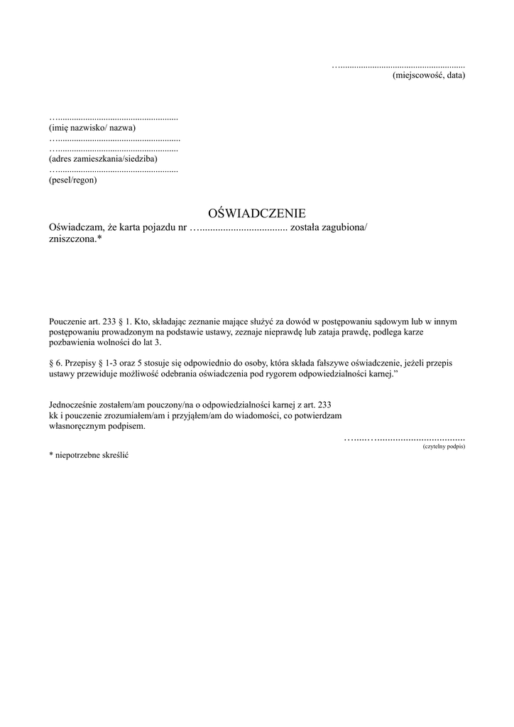 …....................................................... (miejscowość, data) …..................................................... (imię nazwisko/ nazwa) …...................................................... …..................................................... (adres zamieszkania/siedziba) …..................................................... (pesel/regon) OŚWIADCZENIE Oświadczam, że karta pojazdu nr ….................................. została zagubiona/ zniszczona.* Pouczenie art. 233 § 1. Kto, składając zeznanie mające służyć za dowód w postępowaniu sądowym lub w innym postępowaniu prowadzonym na podstawie ustawy, zeznaje nieprawdę lub zataja prawdę, podlega karze pozbawienia wolności do lat 3. § 6. Przepisy § 1-3 oraz 5 stosuje się odpowiednio do osoby, która składa fałszywe oświadczenie, jeżeli przepis ustawy przewiduje możliwość odebrania oświadczenia pod rygorem odpowiedzialności karnej.” Jednocześnie zostałem/am pouczony/na o odpowiedzialności karnej z art. 233 kk i pouczenie zrozumiałem/am i przyjąłem/am do wiadomości, co potwierdzam własnoręcznym podpisem. ….....….................................. (czytelny podpis) * niepotrzebne skreślić