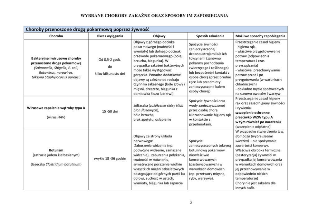 WYBRANE CHOROBY ZAKAŹNE ORAZ SPOSOBY IM ZAPOBIEGANIA Choroby przenoszone drogą pokarmową poprzez żywność Choroba Bakteryjne i wirusowe choroby przenoszone droga pokarmową (Salmonella, Shigella, E. coli, Rotawirus, norowirus, toksyna Staphylococus aureus ) Okres wylęgania Od 0,5‐2 godz. do kilku‐kilkunastu dni Wirusowe zapalenie wątroby typu A (wirus HAV) 15 ‐50 dni Botulizm (zatrucie jadem kiełbasianym) (laseczka Clostridium botulinum) zwykle 18 ‐36 godzin Objawy Sposób zakażenia Objawy z górnego odcinka pokarmowego (nudności i wymioty) lub dolnego odcinak przewodu pokarmowego (bóle, brzucha, biegunka). W przypadku zakażeń bakteryjnych może także występować gorączka. Ponadto dodatkowe objawy są zależne od rodzaju czynnika zakaźnego (bóle głowy i mięsni, dreszcze, biegunka z domieszka śluzu lub krwi) Spożycie żywności zanieczyszczonej drobnoustrojami lub ich toksynami (zarówno pokarmy pochodzenia zwierzęcego i roślinnego) lub bezpośredni kontakt z osoba chorą (przez brudne ręce lub przedmioty zanieczyszczone kałem osoby chorej) Możliwe sposoby zapobiegania Przestrzeganie zasad higieny ‐ higiena rąk, ‐ właściwe przygotowywanie potraw (odpowiednia temperatura i czas przyrządzania) ‐ właściwe przechowywanie potraw przed i po przygotowaniu (w warunkach chłodniczych) ‐ dokładne mycie spożywanych na surowo owoców i warzyw Przestrzeganie zasad higieny Spożycie żywności oraz rąk oraz zasad higieny żywności żółtaczka (zażółcenie skóry i/lub wody zanieczyszczonej i żywienia. błon śluzowych), przez osobę chorą. szczepienie ochronne bóle brzucha, Niezachowanie higieny rąk przeciwko WZW typu A brak apetytu, osłabienie w kontakcie z w tym również po narażeniu przedmiotami. (szczepienie odpłatne) W przypadku stwierdzenia tzw. Bombaża (wybrzuszenie Objawy ze strony układu Spożycie wieczka) – nie spożywanie nerwowego: zanieczyszczonych toksyną zawartości konserwy. Zaburzenia widzenia (np. botulinową pokarmów Właściwa obróbka termiczna podwójne widzenie, zamazane (pasteryzacja) żywności w widzenie), zaburzenia połykania, niewłaściwie konserwowanych przypadku jej konserwowania trudności w mówieniu, (pasteryzowanych) w w warunkach domowych oraz symetryczne porażenie wiotkie jej przechowywanie w wszystkich mięśni szkieletowych warunkach domowych odpowiednio niskich postępujące od górnych partii ku (np. przetwory mięsne, ryby, warzywa). temperaturze) dołowi, suchość w ustach, wymioty, biegunka lub zaparcia Chory nie jest zakaźny dla innych osób. 5 WYBRANE CHOROBY ZAKAŹNE ORAZ SPOSOBY IM ZAPOBIEGANIA Choroby przenoszone drogą oddechową Choroba Okres wylęgania Objawy Sposób zakażenia Chorobą przebiegającą z grudkowo‐plamistą wysypka oraz wysoka gorączką Odra (wirus‐ Morrbilli virus) Inwazyjna choroba meningokokowa (bakterie Neisseria meningitidis) 8‐13 dni (przeciętnie 10 dni) 2 ‐ 10 dni, najczęściej 3 ‐ 4 dni Źródłem zakażenia jest chory na odrę od 5 dni przed wystąpieniem Na 2‐4 dni przed wystąpieniem objawów do 5 dni po ich wysypki pojawiają się: gorączka, wystąpieniu. Choroba najczęściej powyżej 39°C, złe przenosi się drogą samopoczucie, zapalenie kropelkową (podczas spojówek, światłowstręt, kaszlu lub kichania, przez łzawienie, obrzęk powiek, katar ‐ styczność z wydzieliną z „cieknący nos”, kaszel. nosa, gardła lub moczem Wysypka pojawia się najpierw na chorej osoby). twarzy i za uszami, a następnie rozprzestrzenia się na tułów i kończyny. Zakażenie poprzez bezpośredni kontakt ze gorączka, złe samopoczucie, bóle śliną zakażonego (przede mięśniowe oraz stawowe, wszystkim pocałunki zwłaszcza głębokie). wymioty, sztywność karku, Ponadto drogą drgawki, wysypka kropelkową w wyniku wybroczynowa, długotrwałego narażenia choroba może przebiegać poprzez długotrwały gwałtownie kontakt (wspólne mieszkanie) 6 Możliwe sposoby zapobiegania Szczepienie przeciwko odrze Według kalendarza szczepień każde dziecko powinno zostać zaszczepione w 2 r.ż. i 10 r.ż. w celu uzyskania trwałej odporności. Dla osób dorosłych szczepienie jest odpłatne. U osób nieodpornych (nieszczepionych lub które nie chorowały wcześniej na odrę) skuteczne może być również szczepienie wykonane do 72 godz. po kontakcie z zakażonym Przestrzeganie zasad higieny osobistej: unikanie picia z jednej butelki, palenia tego samego papierosa, korzystania z tych samych sztućców itp.) W przypadku bliskiego kontaktu z zakażonym szybkie podanie przez lekarza chemioprofilaktyki. Dostępna jest szczepionka przeciwko meningokokom grupy C (szczepionka jest odpłatna) WYBRANE CHOROBY ZAKAŹNE ORAZ SPOSOBY IM ZAPOBIEGANIA Choroby przenoszone drogą płciową Choroba HIV/AIDS zespół nabytego upośledzenia odporności. Kiła Rzeżączka Okres wylęgania średnio ok. 10 lat 2‐4 tyg. objawy kiły późnej do kilku lat 3‐6 dni (mężczyźni) 7‐14 (kobiety) Objawy Zespół objawów chorobowych jest niejednorodny – zależny od towarzyszących zakażeń po upływie 2‐4 tyg. od zakażenia w miejscu wniknięcia krętków, najczęściej na narządach płciowych , pojawia się niewielki niebolesny guzek, ulegający szybko owrzodzeniu, w późniejszym czasie występuje wysypka. Obydwa objawy przemijają bez leczenia i choroba przechodzi w wieloletni okres utajony, powracając po latach w postaci ciężkich uszkodzeń narządowych. umiejscawia się najczęściej w miejscu wniknięcia bakterii (cewka moczowa, szyjka macicy, odbytnica, gardło). U mężczyzn powoduje bolesność przy oddawaniu moczu ze skąpą wydzieliną śluzowo‐ropną. U kobiet dolegliwości początkową są niewielkie, lecz z czasem doprowadzają do upławów i bolesnego oddawania moczu. Sposób zakażenia Możliwe sposoby zapobiegania Ryzykowne kontakty seksualne, dożylne przyjmowanie narkotyków Używanie prezerwatyw w przypadku kontaktów seksualnych. Unikanie