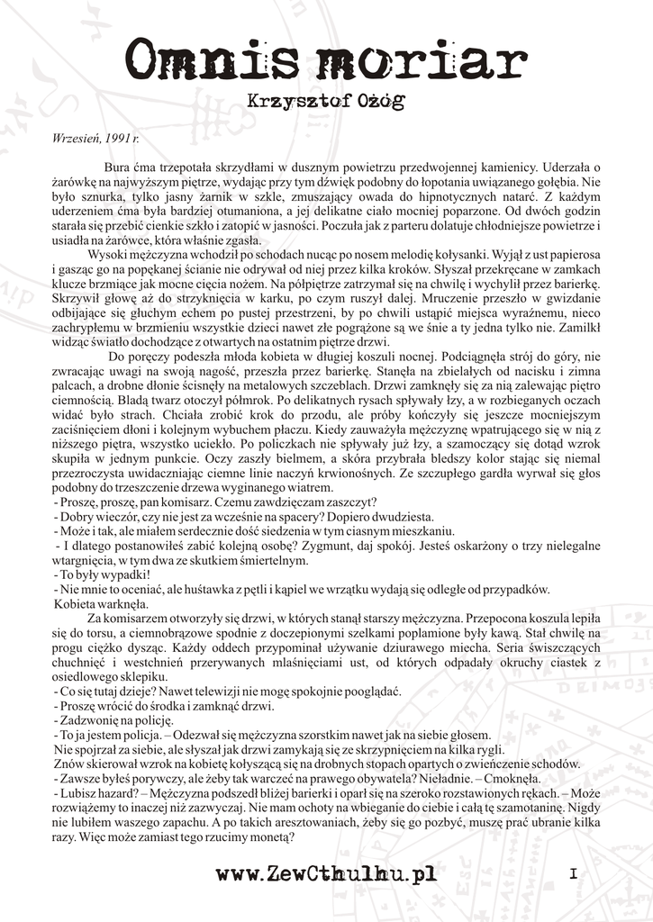 Omnis moriar Krzysztof Ożóg Wrzesień, 1991 r. Bura ćma trzepotała skrzydłami w dusznym powietrzu przedwojennej kamienicy. Uderzała o żarówkę na najwyższym piętrze, wydając przy tym dźwięk podobny do łopotania uwiązanego gołębia. Nie było sznurka, tylko jasny żarnik w szkle, zmuszający owada do hipnotycznych natarć. Z każdym uderzeniem ćma była bardziej otumaniona, a jej delikatne ciało mocniej poparzone. Od dwóch godzin starała się przebić cienkie szkło i zatopić w jasności. Poczuła jak z parteru dolatuje chłodniejsze powietrze i usiadła na żarówce, która właśnie zgasła. Wysoki mężczyzna wchodził po schodach nucąc po nosem melodię kołysanki. Wyjął z ust papierosa i gasząc go na popękanej ścianie nie odrywał od niej przez kilka kroków. Słyszał przekręcane w zamkach klucze brzmiące jak mocne cięcia nożem. Na półpiętrze zatrzymał się na chwilę i wychylił przez barierkę. Skrzywił głowę aż do strzyknięcia w karku, po czym ruszył dalej. Mruczenie przeszło w gwizdanie odbijające się głuchym echem po pustej przestrzeni, by po chwili ustąpić miejsca wyraźnemu, nieco zachrypłemu w brzmieniu wszystkie dzieci nawet złe pogrążone są we śnie a ty jedna tylko nie. Zamilkł widząc światło dochodzące z otwartych na ostatnim piętrze drzwi. Do poręczy podeszła młoda kobieta w długiej koszuli nocnej. Podciągnęła strój do góry, nie zwracając uwagi na swoją nagość, przeszła przez barierkę. Stanęła na zbielałych od nacisku i zimna palcach, a drobne dłonie ścisnęły na metalowych szczeblach. Drzwi zamknęły się za nią zalewając piętro ciemnością. Bladą twarz otoczył półmrok. Po delikatnych rysach spływały łzy, a w rozbieganych oczach widać było strach. Chciała zrobić krok do przodu, ale próby kończyły się jeszcze mocniejszym zaciśnięciem dłoni i kolejnym wybuchem płaczu. Kiedy zauważyła mężczyznę wpatrującego się w nią z niższego piętra, wszystko uciekło. Po policzkach nie spływały już łzy, a szamoczący się dotąd wzrok skupiła w jednym punkcie. Oczy zaszły bielmem, a skóra przybrała bledszy kolor stając się niemal przezroczysta uwidaczniając ciemne linie naczyń krwionośnych. Ze szczupłego gardła wyrwał się głos podobny do trzeszczenie drzewa wyginanego wiatrem. - Proszę, proszę, pan komisarz. Czemu zawdzięczam zaszczyt? - Dobry wieczór, czy nie jest za wcześnie na spacery? Dopiero dwudziesta. - Może i tak, ale miałem serdecznie dość siedzenia w tym ciasnym mieszkaniu. - I dlatego postanowiłeś zabić kolejną osobę? Zygmunt, daj spokój. Jesteś oskarżony o trzy nielegalne wtargnięcia, w tym dwa ze skutkiem śmiertelnym. - To były wypadki! - Nie mnie to oceniać, ale huśtawka z pętli i kąpiel we wrzątku wydają się odległe od przypadków. Kobieta warknęła. Za komisarzem otworzyły się drzwi, w których stanął starszy mężczyzna. Przepocona koszula lepiła się do torsu, a ciemnobrązowe spodnie z doczepionymi szelkami poplamione były kawą. Stał chwilę na progu ciężko dysząc. Każdy oddech przypominał używanie dziurawego miecha. Seria świszczących chuchnięć i westchnień przerywanych mlaśnięciami ust, od których odpadały okruchy ciastek z osiedlowego sklepiku. - Co się tutaj dzieje? Nawet telewizji nie mogę spokojnie pooglądać. - Proszę wrócić do środka i zamknąć drzwi. - Zadzwonię na policję. - To ja jestem policja. – Odezwał się mężczyzna szorstkim nawet jak na siebie głosem. Nie spojrzał za siebie, ale słyszał jak drzwi zamykają się ze skrzypnięciem na kilka rygli. Znów skierował wzrok na kobietę kołyszącą się na drobnych stopach opartych o zwieńczenie schodów. - Zawsze byłeś porywczy, ale żeby tak warczeć na prawego obywatela? Nieładnie. – Cmoknęła. - Lubisz hazard? – Mężczyzna podszedł bliżej barierki i oparł się na szeroko rozstawionych rękach. – Może rozwiążemy to inaczej niż zazwyczaj. Nie mam ochoty na wbieganie do ciebie i całą tę szamotaninę. Nigdy nie lubiłem waszego zapachu. A po takich aresztowaniach, żeby się go pozbyć, muszę prać ubranie kilka razy. Więc może zamiast tego rzucimy monetą? www.ZewCthulhu.pl 1 Kobieta przygryzła górną wargę. Uśmiech, który wykwitł na twarzy przybrał kształt wyciętego tępą brzytwą półksiężyca. Zacisnęła zęby na tyle mocno, by na wargach pojawiła się krew. Grymas nie opuszczał jej twarzy również, kiedy wypluwała posokę z kawałkiem wargi. Po brodzie spływała strużka krwi zakończona rosnącą kroplą. Skapnęła. Za nią poleciało kilka następnych. - To jak będzie? – Podjął na nowo mężczyzna. – Moneta, czy dopisać ci do nakazu egzorcyzmu poranienie i atak na funkcjonariusza? - Rzucaj. – Wycedziła przez zakrwawione usta. - Orzeł czy reszka? - Reszka. Moneta poszybowała wysoko. Wirowała spokojnie tuż przed zakrytymi bielmem oczami kobiety. Po chwili zaczęła spadać, a kiedy dotknęła posadzki na najniższym z pięter wydała z siebie ciche brzdęknięcie. Bardziej czknięcie niż pełen dźwięk. - Reszka! – Dobiegł z dołu dziecięcy głos. Kobieta zrobiła krok do przodu. W jednym momencie poddała się wszystkiemu, co w niej zamieszkało a nie było nią. Opadła z sił i kładąc się na gęstym powietrzu kamienicy zaczęła spadać. Zatrzymała się tuż przed twarzą mężczyzny. Jej ciało krzywiło się w powietrzu. Zginała i prostowała stawy, mięśnie i ścięgna. Przez bielmo zakrywające oczy przebijały zielone tęczówki, a blada twarz nabierała różowego koloru. W jej spojrzeniu widać było lęk. Surowy, gorzki. Taki, który pojawia się, kiedy stajemy przed światłem w kolejowym tunelu. Próbowała coś powiedzieć patrząc na mężczyznę, który wyciągnął do niej ręce. - Zdychaj. – Wyszeptała i poczuła jak spada. Upadek z czwartego piętra nie zawsze jest śmiertelny. Kiedy komisarz zbiegł po schodach 