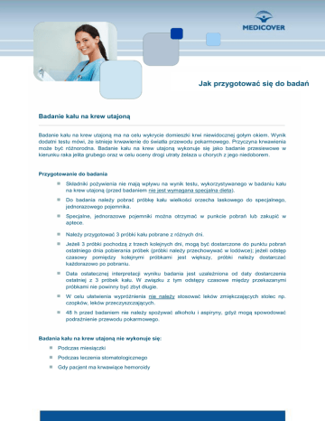 Jak przygotować się do badań Badanie kału na krew utajoną Badanie kału na krew utajoną ma na celu wykrycie domieszki krwi niewidocznej gołym okiem. Wynik dodatni testu mówi, że istnieje krwawienie do światła przewodu pokarmowego. Przyczyna krwawienia może być różnorodna. Badanie kału na krew utajoną wykonuje się jako badanie przesiewowe w kierunku raka jelita grubego oraz w celu oceny drogi utraty żelaza u chorych z jego niedoborem. Przygotowanie do badania Składniki pożywienia nie mają wpływu na wynik testu, wykorzystywanego w badaniu kału na krew utajoną (przed badaniem nie jest wymagana specjalna dieta). Do badania należy pobrać próbkę kału wielkości orzecha laskowego do specjalnego, jednorazowego pojemnika. Specjalne, jednorazowe pojemniki można otrzymać w punkcie pobrań lub zakupić w aptece. Należy przygotować 3 próbki kału pobrane z różnych dni. Jeżeli 3 próbki pochodzą z trzech kolejnych dni, mogą być dostarczone do punktu pobrań ostatniego dnia pobierania próbek (próbki należy przechowywać w lodówce); jeżeli odstęp czasowy pomiędzy kolejnymi próbkami jest większy, próbki należy dostarczać każdorazowo po pobraniu. Data ostatecznej interpretacji wyniku badania jest uzależniona od daty dostarczenia ostatniej z 3 próbek kału. W związku z tym odstępy czasowe między przekazanymi próbkami nie powinny być zbyt długie. W celu ułatwienia wypróżnienia nie należy stosować leków zmiękczających stolec np. czopków, leków przeczyszczających. 48 h przed badaniem nie należy spożywać alkoholu i aspiryny, gdyż mogą spowodować podrażnienie przewodu pokarmowego. Badania kału na krew utajoną nie wykonuje się: Podczas miesiączki Podczas leczenia stomatologicznego Gdy pacjent ma krwawiące hemoroidy
