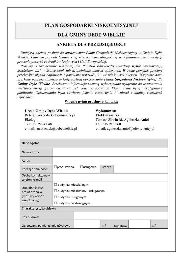 PLAN GOSPODARKI NISKOEMISYJNEJ DLA GMINY DĘBE WIELKIE ANKIETA DLA PRZEDSIĘBIORCY Niniejsza ankieta posłuży do opracowania Planu Gospodarki Niskoemisyjnej w Gminie Dębe Wielkie. Plan ten pozwoli Gminie i jej mieszkańcom ubiegać się o dofinansowanie inwestycji proekologicznych ze środków krajowych i Unii Europejskiej. Prosimy o zaznaczanie właściwej dla Państwa odpowiedzi (możliwy wybór wielokrotny) krzyżykiem „x” w kratce obok lub uzupełnienie danych opisowych. W razie pomyłki, prosimy przekreślić błędną odpowiedź i ponownie wstawić „x” we właściwym miejscu. Wszystkie dane uzyskane poprzez niniejszą ankietę posłużą opracowaniu Planu Gospodarki Niskoemisyjnej dla Gminy Dębe Wielkie. Przekazane informacje zostaną wykorzystane wyłącznie do oszacowania wielkości emisji gazów cieplarnianych oraz opracowania Planu i nie będą udostępniane publicznie. Opracowania będą zawierać jedynie zestawienia i wnioski z analizy zebranych informacji. W razie pytań prosimy o kontakt: Urząd Gminy Dębe Wielkie Referat Gospodarki Komunalnej i Ekologii Tel: 25 756 47 48 e-mail: [email protected] Wykonawca: Efektywniej s.c. Tomasz Śliwiński, Agnieszka Anioł Tel: 535 910 560 e-mail: [email protected] Dane ogólne Nazwa firmy Adres Rodzaj działalności produkcyjna usługowa Branża Osoba kontaktowa – telefon, e-mail Działalnośd jest prowadzona w… (możliwy wybór wielokrotny) budynku mieszkalnym budynku mieszkalno – usługowym budynku usługowym budynku produkcyjnym Charakterystyka obiektu Rok budowy Ogrzewana powierzchnia użytkowa m2 Kubatura m3 drewniane PVC inne: do 10 lat powyżej 10 lat Ocieplone ściany zewnętrzne TAK NIE Ocieplony dach/ stropodach TAK NIE ………..……. Rodzaj okien Charakterystyka źródeł ciepła : kotłownia węglowa, ekogroszek kocioł na pelet kotłownia olejowa gaz LPG kotłownia gazowa ogrzewanie elektryczne pompa ciepła Sposób ogrzewania pomieszczeo: inne: …………………………………………………………. Moc: Wiek kotła w latach: kotłownia węglowa, ekogroszek kocioł na pelet kotłownia olejowa gaz LPG kotłownia gazowa ogrzewanie elektryczne kolektory słoneczne pompa ciepła Sposób przygotowania ciepłej wody użytkowej (CWU) inne: …………………………………………………………. Moc: Cele technologiczne Wiek kotła w latach: gaz ziemny węgiel drewno pompa ciepła energia elektryczna – zużywane paliwa inne: …………………………………………………………. TAK * olej gaz LPG NIE * jeśli „TAK”: Rodzaj OZE (np. fotowoltaika, kolektory słoneczne): Aktualnie wykorzystywane odnawialne źródła energii (OZE) Moc zainstalowanych urządzeo: ilośd : Cel (przeznaczenie) wykorzystywania OZE: Roczne zużycia paliw i energii ( dane za cały rok 2014) Zużycie energii elektrycznej Zużycie gazu ziemnego Zużycie oleju opałowego Zużycie gazu LPG Zużycie węgla Zużycie innego paliwa ……………………………………………(rodzaj) kWh/rok m3/rok m3/rok m3/rok ton (Mg) /rok ………../rok PRACE TERMOMODERNIZACYJNE Wymiana okien wykonano w ciągu ostatnich 10 lat planowane w ciągu najbliższych 5 lat nie widzę potrzeby Ocieplenie ścian wykonano w ciągu ostatnich 10 lat planowane w ciągu najbliższych 5 lat nie widzę potrzeby Ocieplenie dachu/ wykonano w ciągu ostatnich 10 lat stropodachu planowane w ciągu najbliższych 5 lat nie widzę potrzeby Planuję wymianę źródła ekogroszek gazowe biomasa/pelet pompa ciepła ciepła (kotła) do ogrzewania budynku inne…………………………………….………………………………..… na : NIE PLANUJĘ Planuję wymianę źródła ekogroszek gazowe biomasa/pelet pompa ciepła ciepła (kotła) kolektory słoneczne do przygotowania ciepłej wody użytkowej (CWU) inne…………………………………….………………………………..… na : NIE PLANUJĘ Planuję zakup i montaż odnawialnych źródeł energii (OZE) (np. kolektory słoneczne, fotowoltaika, pompa ciepła, wiatraki) TAK : rodzaj……………………………………………………………………………………., Ilośd, moc……………………………………………………………………………………….... NIE Czy w procesach produkcyjnych powstaje ciepło odpadowe (ciepło nie TAK wykorzystywane podczas przetwarzania energii w urządzeniach i oddawane do otoczenia np. ciepło spalin, pary wylotowej, ciepło oddawane wodzie chłodzącej)? Opis: NIE Jeśli występuje, to czy jego wielkośd jest znana i czy jest ono wykorzystywane Czy do 2020 roku planowane są przedsięwzięcia inwestycyjne mające TAK znaczący wpływ na zmianę zużycia nośników energii np. rozbudowa budynków, zmiana NIE Opis: technologii, termomodernizacja, zakup energooszczędnych maszyn itp.? Jaka jest spodziewana oszczędnośd energii w %? TRANSPORT – informacje o pojazdach Liczba samochodów Benzyna osobowe Benzyna + LPG Diesel Zużycie paliwa roczne (w przybliżeniu) szt. szt. szt. Benzyna litry LPG Litry Litry litry Benzyna litry LPG Litry Litry litry litry LPG Litry Litry litry dostawcze Benzyna Benzyna + LPG Diesel szt. szt. szt. ciężarowe Benzyna Benzyna + LPG Diesel szt. szt. szt. Benzyna Czy są Paostwo zainteresowani udziałem w działaniach gminy Dębe Wielkie na rzecz redukcji CO2 poprzez np. wymianę źródła ciepła na niskoemisyjne? TAK NIE, ponieważ (brak funduszy, nie widzę sensu takich działao) ……………………………………………………………………………………………………………………… Jeśli „TAK”, jaki maksymalny wkład własny mógłby byd wniesiony? 30% 50% 70% inny (jaki)…………… Uwagi, spostrzeżenia: …………………………………………………………………………………………………………………………………………………………… ………………………………