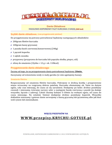 Danie Obiadowe FASOLOWO-KOPERKOWY FILET KURCZAKA Z KASZĄ (500 kcal) Szybki danie obiadowe. (czas przygotowania 30minut) Do przygotowania tej potrawy potrzebować będziemy następujących składników: ✗ 200gram filetów kurczaka ✗ 100gram kaszy gryczanej ✗ 1 puszka fasoli czerwonej konserwowej (240g) ✗ 1 pęczek koperku ✗ 1 ząbek czosnku ✗ przyprawy (przyprawa do kurczaka lub papryka słodka, pieprz, sól) ✗ oliwę do smażenia (1łyżka = 12 g = ok. 110kcal) Przygotowanie dania obiadowego Zacznę od tego, że na przygotowanie dania potrzebować będziemy 20min. Zaczynamy od wstawienia wody w mały garnku (w nim ugotujemy kaszę). Smażenie filetów Rozpoczynamy od smażenia filetów kurczaka. Pokrojone w drobną kostkę i przyprawione mięso wrzucamy na rozgrzaną dobrze patelnię. Kurczaka obsmażamy ok. 5min na dużym ogniu, cały czas mieszają, do czasu aż się zarumieni. Dodajemy po kolei: drobno posiekany czosnek i mieszamy, ścieramy surowy seler a następnie fasolę czerwoną z puszki (ja dodaje wszystko, łącznie z zalewą). Całość dusimy kolejne 5-10min na wolnym ogniu, od czasu do czasu mieszając. Na ostatnie 5minut dodajemy drobno posiekany koperek. Wszystko dokładnie mieszamy i gotowe danie serwujemy z kaszą gryczaną lub jęczmienną albo jak ktoś woli ryżem lub ziemniakami. WIĘCEJ PRZEPISÓW NA WW W.p rzepisy.K RYC HU- GOTUJE .pl POWIELANIE, KOPIOWANIE ZABRONIONE © 2012 WWW.KRYCHU-GOTUJE.PL Danie wysokobiałkowe i wysoko-węglowodanowe. Wartość odżywcza 1porcji fasolowo-koperkowego filetu kurczaka z kaszą L.p. Nazwa składnika Białko [gram] Węglowodany [gram] Tłuszcz [gram] Kalorie [kcal] 1 Filet kurczaka 100g 20,6 0 5,6 133 2 Fasola czerwona 120g 8,3 21,4 0,72 120 3 Kasza gryczana 50g 6,3 31,7 1,55 168 4 Koper, czosnek 5 Oliwa z oliwek 12g - - 9,8 108 - Łącznie 35,2 53,1 17,7 529 WIĘCEJ ZDJĘĆ NA WWW.z djęc ia.K RYC HU- GOTUJE .pl POWIELANIE, KOPIOWANIE ZABRONIONE © 2012 WWW.KRYCHU-GOTUJE.PL