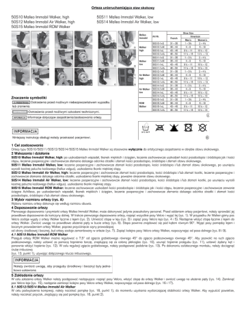 Orteza unieruchamiająca staw skokowy 50S10 Malleo Immobil Walker, high 50S12 Malleo Immobil Air Walker, high 50S15 Malleo Immobil ROM Walker 50S11 Malleo Immobil Walker, low 50S14 Malleo Immobil Air Walker, low Znaczenie symboliki 1 Cel zastosowania Ortezy typu 50S10/50S11/50S12/50S14/50S15 Malleo Immobil Walker są stosowane wyłącznie do ortotycznego zaopatrzenia w obrębie stawu skokowego. 2 Wskazania i działanie 50S10 Malleo Immobil Walker, high: po uszkodzeniach więzadeł, tkanek miękkich i ścięgien, leczenie zachowawcze uszkodzeń kości przodostopia i śródstopia jak i kości stępu, leczenie pooperacyjne i zachowawcze złamania dalszego odcinka strzałki i złamań kości przodostopia, śródstopia i złamań stawu skokowego. 50S11 Malleo Immobil Walker, low: leczenie pooperacyjne i zachowawcze złamań kości przodostopia, kości śródstopia i/lub złamań stawu skokowego, po usunięciu wyrośli kostnej palucha koślawego (hallux valgus), uszkodzenia tkanki miękkiej stopy. 50S12 Malleo Immobil Air Walker, high: leczenie pooperacyjne i zachowawcze złamań kości przodostopia, kości śródstopia i/lub złamań kostki, leczenie pooperacyjne i zachowawcze złamania dalszego odcinka strzałki, uszkodzenia tkanki miękkiej stopy, poważne skręcenie stawu skokowego. 50S14 Malleo Immobil Air Walker, low: leczenie pooperacyjne i zachowawcze złamań kości przodostopia, kości śródstopia i/lub złamań kostki, po usunięciu wyrośli kostnej palucha koślawego (hallux valgus), uszkodzenia tkanki miękkiej stopy. 50S15 Malleo Immobil ROM Walker: leczenie zachowawcze uszkodzeń kości przodostopia i śródstopia jak i kości stępu, leczenie pooperacyjne i zachowawcze zerwanie ścięgna Achillesa, po uszkodzeniach więzadeł, tkanek miękkich i ścięgien, leczenie pooperacyjne i zachowawcze złamania dalszego odcinka strzałki i złamań kości przodostopia, śródstopia i/lub złamań stawu skokowego. 3 Wybór rozmiaru ortezy (rys. A) Wyboru rozmiaru ortezy dokonuje się według rozmiaru obuwia. 4 Dopasowanie ortezy Pierwszego dopasowania i przymiarki ortezy Malleo Immobil Walker, może dokonywać jedynie przeszkolony personel. Przed oddaniem ortezy pacjentowi, należy sprawdzić jej prawidłowe dopasowanie do kończyny dolnej. W trakcie pierwszego dopasowania ortezy, rozpiąć wszystkie pasy Velcro i wyjąć lej (rys. 1). W przypadku Air Walker górny pas Velcro zostaje wyjęty z ortezy Walker łącznie z lejem (rys. 2). Umieścić stopę w leju (rys. 3) i zapiąć pasy Velcro leja (rys. 4 i 5). Następnie włożyć stopę łącznie z lejem do ortezy Walker. Zwrócić uwagę na prawidłowe ułożenie pięty w bucie ortezy (rys. 6). Stopa powinna znajdować się pod kątem równym 90°. Wyjąć pasy pomiędzy lejem i bocznym prowadzeniem ortezy Walker, poprzez przyciśnięcie szyny prowadzącej od strony środkowej i bocznej, but ortezy zostaje zamontowany w ortezie (rys. 7). Zapiąć kolejno pasy Velcro ortezy Walker, rozpoczynając od pasa dolnego (rys. 8 i 9). 4.1 50S15 Malleo Immobil ROM Walker Przegub ortezy ROM Walker można regulować o 7,5° od zgięcia grzbietowego równego 45° do zgięcia podeszwowego równego 45°. Aby pozwolić na ruch zgięcia podeszwowego, należy ustawić za pomocą trzpnienia tarczę, znajdującą się za osłoną pleksiglas (rys. 10), usunąć trzpienie przegubu (rys. 11), ustawić żądany kąt i ponownie włożyć trzpienie (rys. 12). W celu regulacji zgięcia grzbietowego, należy postępować podobnie (rys. 13). Po dokonaniu ostatecznego montażu, należy dociągnąć śrubę imbusową (rys. 13, punkt 1), używając dołączonego klucza imbusowego. 5 Zakładanie ortezy W celu założenia ortezy Walker należy postępować następująco: rozpiąć pasy Velcro, włożyć stopę do ortezy Walker i zwrócić uwagę na ułożenie pięty (rys. 14). Zamknąć pas Velcro leja (rys. 15), następnie zamknąć kolejno pasy Velcro ortezy Walker, rozpoczynając od pasa dolnego (rys. 16 i 17). 5.1 50S12/50S14 Malleo Immobil Air Walker W celu podwyższenia kompresji, należy naciskać pompkę (rys. 18, punkt 1), do momentu uzyskania wystarczającej stabilności ortezy Walker. Aby wypuścić powietrze, należy naciskać przycisk, znajdujący się pod pompką (rys. 18. punkt 2). 7 Przeciwwskazania 8 Wskazówki odnośnie użytkowania Przed każdorazowym użytkowaniem ortezy, należy sprawdzić jej prawidłowe funkcjonowanie, dokonać kontroli pod zględem uszkodzeń i stanu zużycia. Jeżeli zapięcia na rzep, przeguby lub inne elementy ortezy są zużyte, należy zaprzestać jej stosowania. Czas codziennego użytkowania kortezy jak i okres jej stosowania ustala lekarz. Nie wolno dokonywać zmian w produkcie. Należy poinformować pacjenta o tym, aby w przypadku pojawienia się jakichkolwiek zmian (np. wzrostu dolegliwości), niezwłocznie skontaktować się z lekarzem. Nie dopuścić do kontaktu produktu ze środkami zawierającymi tłuszcz i kwas, maściami lub środkami do pielęgnacji ciała. Wskazówki odnośnie pielęgnacji (rys. B) Poduszki należy prać w letniej wodzie, używając dostępnego w handlu proszku do tkanin delikatnych. Dobrze wypłukać. Suszyć na powietrzu. W trakcie suszenia, unikać bezpośredniego działania źródeł ciepła tj. promieni słonecznych, piecyków, lub kaloryferów. INFORMACJA Latex Safe: Według stanu naszej wiedzy, produkt nie zawiera naturalnego kauczuku. 9 Ograniczenia w stosowaniu Ortezy typu 50S10/50S11/50S12/50S14/50S15 Malleo Immobil Walker są przeznaczone do użytku tylko przez jednego pacjenta. Czas codziennego użytkowania ortezy jak i okres jej stosowania ustala lekarz, według wskazań medycznych. 10 Odpowiedzialność Producent ponosi odpowiedzialność cywilnoprawną tylko wtedy, jeśli produkt został zastosowany w opisanych warunkach i w celu, do którego jest przeznaczony. Producent zaleca odpowiednie stosowanie produktu i jego pielęgnację według wskazówek zawartych w instrukcji obsługi. 