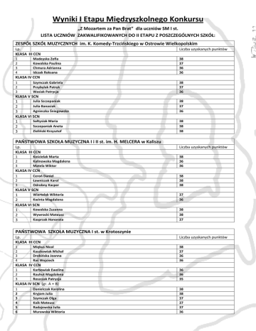 Wyniki I Etapu Międzyszkolnego Konkursu „Z Mozartem za Pan Brat” dla uczniów SM I st. LISTA UCZNIÓW ZAKWALIFIKOWANYCH DO II ETAPU Z POSZCZEGÓLNYCH SZKÓŁ: SZKÓŁ ZESPÓŁ SZKÓŁ MUZYCZNYCH im. K. Komedy-Trzcińskiego Komedy w Ostrowie Wielkopolskim Wielkopolski Lp. KLASA III CCN Liczba uzyskanych punktów 1 2 3 4 38 37 36 36 Madeyska Zofia Kowalska Paulina Chmura Adrianna Idczak Roksana KLASA IV CCN 1 2 3 Szymczak Gabriela Przybylak Patryk Wasiak Patrycja KLASA V SCN Julia Szczepaniak 1 Julia Banasiak 2 Agnieszka Śniegowska 3 KLASA VI SCN Sołtysiak Maria 1 Szczepaniak Aneta 2 Zieliński Krzysztof 3 38 37 36 38 37 36 38 38 38 PAŃSTWOWA SZKOŁA MUZYCZNA I i II st. im. H. MELCERA w Kaliszu Lp. KLASA III CCN Liczba uzyskanych punktów 1 2 3 38 36 36 Kościelak Marta Kalinowska Magdalena Matela Wiktor KLASA IV CCN 1 2 3 Ceroń Daniel Ławniczak Karol Odrobny Kacper KLASA V SCN Wiertelak Wiktoria 1 Kwinta Magdalena 2 KLASA VI SCN Kowalska Zuzanna 1 Wywrocki Mateusz 2 Kasprzak Honorata 3 38 38 38 37 36 38 38 37 PAŃSTWOWA SZKOŁA MUZYCZNA I st. w Krotoszynie Lp. KLASA III CCN Liczba uzyskanych punktów 1 2 3 4 38 37 36 36 Miękus Nicol Kaszkowiak Michał Drobińska Joanna Raś Wojciech KLASA IV CCN 1 2 3 Karbowiak Ewelina Rauhut Magdalena Roszczak Patrycja 36 36 35 KLASA IV SCN (gr. A + B) 1 2 3 4 5 6 Danielczak Karolina Kryjom Julia Szymczak Olga Kaik Mateusz Radajewska Julia Murawska Wiktoria 38 38 37 37 37 36 KLASA V SCN 1 Konrady Magdalena 2 Sikora Sonia 3 Skrzypczak Joanna 4 Zajączkowska Anna KLASA VI SCN 1 Sikora Jan 2 Kałążna Weronika 3 Kulesza Aleksandra 38 38 38 38 38 37 36 PAŃSTWOWA SZKOŁA MUZYCZNA I st. im. F. Chopina w Ostrzeszowie Lp. KLASA III CCN Liczba uzyskanych punktów 1 2 3 38 38 38 Dziubińska Dominika Mróz Marta Stodolna Sara KLASA IV CCN 1 Jokiel Julia 32 KLASA IV SCN 1 2 3 Graf Monika Błaszczyk Patrycja Gorzelanny Tobiasz KLASA V SCN 1 Gorzelanna Zofia KLASA VI SCN 1 Bogacz Anita 2 Nawrot Weronika 3 Jeżyk Julia 38 34 33 36 38 38 32 Termin II Etapu Konkursu „Z Mozartem za Pan Brat”: Brat” 12 grudnia (poniedziałek) 2011r. o godz. 15:30 INFORMACJA ORGANIZACYJNA! ORGANIZACYJNA Test II Etapu odbędzie się w następujących klasach: Klasa nr 210 poziom II (I piętro) • Uczniowie PSM I st. im. Fr. Chopina w Ostrzeszowie • Uczniowie ZSM im. K. Komedy-Trzcińskiego Komedy w Ostrowie Wielkopolskim ielkopolskim Klasa nr 207 poziom II (I piętro) • Uczniowie PSM I i II st. im. H. Melcera w Kaliszu • Uczniowie PSM I st. w Krotoszynie Krotoszyni