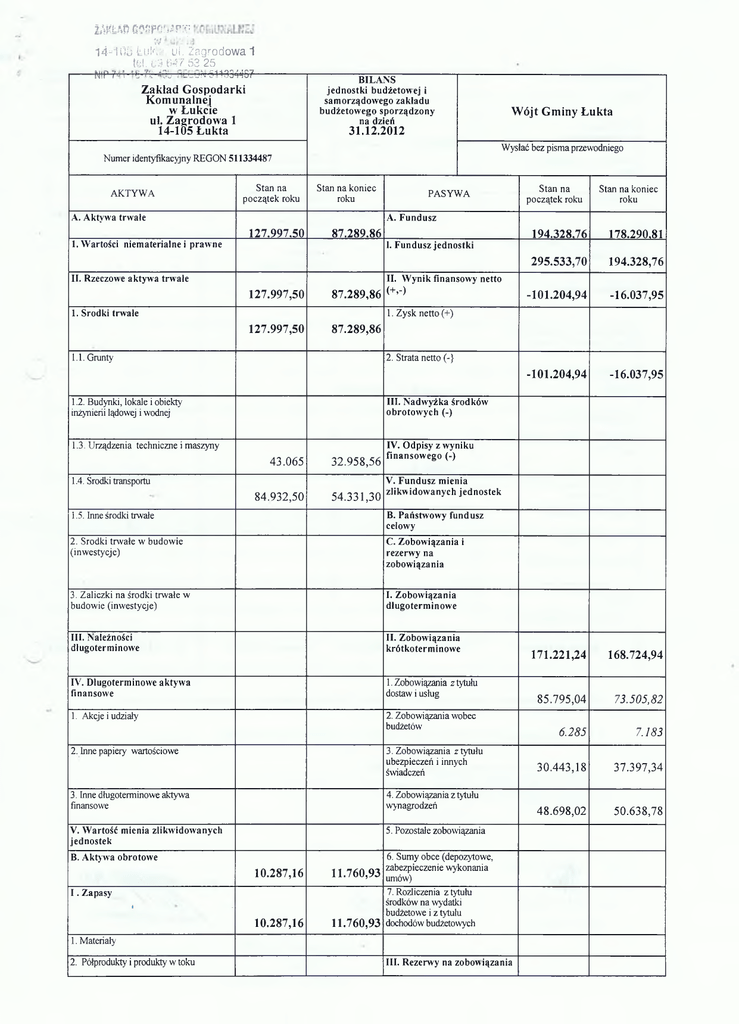 m m 6?sp(mp:<? W 14=1 Qi§ Łuk*« ui. Zagrodowa 1 tel. 89 64 7 53 25 741 -------- NIP 7 4 1■16-1 0 ;72-40:, 2-40;, RtCOM RtCOrc 511334487 S11334487------------------- Zakład Gospodarki Komunalnej w Łukcie ul. Zagrodowa 1 14-105 Łukta BIL A N S je d n o s tk i b u d żeto w ej i sam o rząd o w eg o zak ład u b u d żeto w eg o sp o rz ą d z o n y na dzień W ójt Gminy Łukta 31.12.2012 Wysłać bez pisma przewodniego Numer identyfikacyjny REGON 511334487 Stan na początek roku A KTYW A Stan na koniec roku A. A k tyw a trw ale PASYW A Stan na początek roku Stan na koniec roku A. F u n d u sz 127.997.50 87.289.86 1. W arto ści n iem aterialn e i p ra w n e 1. F u n d u sz je d n o s tk i II. Rzeczow e a k ty w a trw ale II. W y n ik finansow y netto (+ .-) 127.997,50 87.289,86 1. Ś ro d k i trw ale 194.328.76 178.290.81 295.533,70 194.328,76 -101.204,94 -16.037,95 -101.204,94 -16.037,95 171.221,24 168.724,94 85.795,04 73.505,82 6.285 7.183 30.443,18 31391,34 48.698,02 50.638,78 1. Z ysk netto (+) 127.997,50 87.289,86 1.1. Grunty 2. Strata netto (-} III. N ad w y żk a śro d k ó w o b ro to w y c h (-) 1.2. Budynki, lokale i obiekty inżynierii lądowej i wodnej 1.3. Urządzenia techniczne i maszyny 43.065 32.958,56 84.932,50 54.331,30 1.4. Środki transportu IV. O dpisy z w yniku f in a n so w e g o (-) V . F u n d u sz m ien ia zlik w id o w an y ch je d n o s te k 1.5. Inne środki trwale B. P aństw ow y fu n d u sz celowy 2. Środki trw ale w budow ie (inw estycje) C. Z o b o w iązan ia i rezerw y na zobow iązania 3. Zaliczki n a środki trw ale w budow ie (inw estycje) I. Z o b o w iązan ia d łu g o term in o w e III. N ależności d łu g o term in o w e II. Z o b o w ią z a n ia k ró tk o te rm in o w e IV. D ługoterm inow e a k ty w a fin an so w e 1. Zobowiązania z tytułu dostaw i usług 1. Akcje i udziały 2. Zobowiązania wobec budżetów 2. Inne papiery wartościowe 3. Zobowiązania z tytułu ubezpieczeń i innych świadczeń 3. Inne długoterminowe aktywa finansowe 4. Zobowiązania z tytułu wynagrodzeń V. W a rto ść m ien ia zlik w id o w an y ch je d n o ste k 5. Pozostałe zobowiązania 11.760,93 6. Sumy obce (depozytowe, zabezpieczenie wykonania umów) 11.760,93 7. Rozliczenia z tytułu środków na wydatki budżetowe i z tytułu dochodów budżetowych B. A ktyw a o b ro to w e 10.287,16 I . Z apasy t » 10.287,16 1. Materiały 2. Półprodukty i produkty w toku III. R ezerw y na zobow iązania 3. Produkty gotowe D. F u n d u sze specjalne 31.294,28 26.348,86 4. Towary ł . Zakładowy Fundusz Świadczeń Socjalnych 31.294,28 26.348,86 II. N ależności k ró tk o te rm in o w e 2. Inne fundusze 1. Należności z tytułu dostaw i usług 166.065,75 192.661,31 138.511,29 156.360,99 12.780,92 14.884,97 2. Należności od budżetów E. R ozliczenia m iędzyokresow e I. R ozliczenia m ięd zy o k reso w e p rz y c h o d ó w 15.000,00 II. Inne rozliczenia m ięd zy o k reso w e 3. Należności z tytułu ubezpieczeń i innych świadczeń 4. Pozostałe należności 14.773,54 21.415,35 92.493,87 96.652,51 92.493,87 96.652,51 396.844,28 388.364,61 5. Rozliczenia z tytułu środków na wydatki budżetowe i z tytułu dochodów budżetowych III. K rótkoterm inow e aktyw a finansowe 1. Środki pieniężne w kasie 2. Środki pieniężne na rachunkach bankowych 3. Środki pieniężne państwowego funduszu celowego 4. Inne środki pieniężne 5. A kcje lub udziały 6. Inne papiery w artościow e 7. Inne krótkoterm inowe aktywa finansowe IV. R ozliczenia m ięd zy o k reso w e Suma aktywów Suma pasywów 396.844,28 A. Objaśnienie — w ykazane w bilansie wartości aktyw ów trwałych i obrotow ych s ą pom niejszone odpow iednio o um orzenie i odpisy aktualizujące. B. Inform acje uzup e łnia ją ce isto tn e dla rzetelności i przejrzystości sytuacji fin an so w ej i m ajątkow ej: 1. U m orzenie w artości niem aterialnych i prawnych - 3 .5 0 0 ,0 0 ....................................... 2. U m orzenie środków trw ałych - 236.908,51 ......................................................................... 3. U morzenie pozostałych środków trwałych - 1 10.000,33.................................................. 4. O dpisy aktualizujące należności.............................................................................................. 5 ............................................................................................................................................................ 388.364,61 Ł» >1* .3 : J » j P łJ i ¡V; ł J , • . _ fT , Ł 1«VŁukJJ9 14-105 Łukta. ui. Zagrodowa 1 tel. 89 647 53 25 NIP 741-18-72-403 HEGON 511334487 Zakład Gospodarki Komunalnej w Łukcie Ul. Zagrodowa 1 14-105 Łukta 511334487 Rachunek zysków i strat jednostki (wariant porównawczy) sporządzony na dzień 31.12.2012 r. W ójt Gm iny Łukta Wysłać bez pisma przewodniego Stan na koniec roku poprzedniego A. Przychody netto z podstaw owej działalności operacyjnej i. II. Przychody netto ze sprzedaży produktów Zmiana stanu produktów (zwiększenie — wartość dodatnia, zmniejszenie — wartość ujemna) III. Koszt wytworzenia produktów na własne potrzeby jednostki IV. Przychody netto ze sprzedaży towarów i materiałów V. VI. Dotacje na finansowanie działalności podstawowej Przychody z tytułu dochodów budżetowych Stan na koniec roku bieżącego 2.167.441,95 2.201.163,02 1.941.182,69 2.080.644,50 226.259,26 120.518,52 B. Koszty działalności operacyjnej 2.237.215,18 2.203.320,26 I. II. III. IV. V. VI. Amortyzacja Zużycie materiałów i energii Usługi obce Podatki i opłaty Wynagrodzenia Ubezpieczenia społeczne i inne świadczenia dla pracowników 38.214,08 1.098.146,88 354.267,34 566.065,91 115.960,78 40.707,64 1.063.424,45 358.553,70 326 548.638,69 126.787,76 VII. VIII. IX. X. Pozostałe koszty rodzajowe Wartość sprzedanych towarów i materiałów Inne świadczenia finansowane z budżetu Pozostałe obciążenia 64.560,19 64.