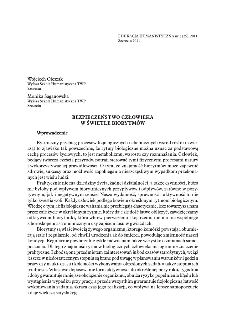Edukacja Humanistyczna nr 2 (25), 2011 Szczecin 2011 Wojciech Oleszak Wyższa Szkoła Humanistyczna TWP Szczecin Monika Saganowska Wyższa Szkoła Humanistyczna TWP Szczecin Bezpieczeństwo człowieka w świetle biorytmów Wprowadzenie Rytmiczny przebieg procesów fizjologicznych i chemicznych wśród roślin i zwierząt to zjawisko tak powszechne, że rytmy biologiczne można uznać za podstawową cechę procesów życiowych, to jest metabolizmu, wzrostu czy rozmnażania. Człowiek, będący twórczą częścią przyrody, potrafi sterować tymi fizycznymi procesami natury i wykorzystywać jej prawidłowości. O tym, że znajomość biorytmów może zapewnić zdrowie, sukcesy oraz możliwość zapobiegania nieszczęśliwym wypadkom przekonanych jest wielu ludzi. Praktycznie nie ma dziedziny życia, żadnej działalności, a także czynności, która nie byłoby pod wpływem biorytmicznych przypływów i odpływów, zarówno w pozytywnym, jak i negatywnym sensie. Nasza wydajność, sprawność i aktywność to nie tylko kwestia woli. Każdy człowiek podlega bowiem określonym rytmom biologicznym. Wiedzę o tym, iż fizjologiczne wahania nie przebiegają chaotycznie, lecz towarzyszą nam przez całe życie w określonym rytmie, który daje się dość łatwo obliczyć, zawdzięczamy odkrywcom biorytmiki, która wbrew pierwszemu skojarzeniu nie ma nic wspólnego z horoskopem astronomicznym czy zapisem losu w gwiazdach. Biorytmy są właściwością żywego organizmu, którego komórki powstają i obumierają stale i regularnie, od chwili urodzenia aż do śmierci, powodując zmienność naszej kondycji. Regularnie powtarzalne cykle mówią nam także wszystko o zmianach samopoczucia. Dlatego znajomość rytmów biologicznych człowieka ma ogromne znaczenie praktyczne. I choć są one przedmiotem zainteresowań już od czasów starożytnych, wciąż jeszcze w niedostatecznym stopniu są brane pod uwagę w planowaniu warunków i godzin pracy czy nauki, czasu i kolejności wykonywania określonych zadań, a także stopnia ich trudności. Właściwe dopasowanie form aktywności do określonej pory roku, tygodnia i doby gwarantuje mniejsze obciążenie organizmu, obniża ryzyko popełnienia błędu lub wystąpienia wypadku przy pracy, a przede wszystkim gwarantuje fizjologiczną łatwość wykonywania zadania, skraca czas jego realizacji, co wpływa na lepsze samopoczucie i daje większą satysfakcję. 108 Wojciech Oleszak, Monika Saganowska Zasadnicze biorytmy człowieka Wieloletnie badania wykazały, że człowiek podlega około osiemdziesięciu różnym rytmom. Najważniejszymi – z punktu widzenia bezpieczeństwa pracy – są rytmy roczne, okołomiesięczne, tygodniowe i dobowe. Na przełomie XIX i XX wieku, prawie jednocześnie i niezależnie od siebie, dwaj uczeni – dr Herman Swoboda, profesor psychologii na Uniwersytecie Wiedeńskim, oraz dr Wilhelm Fliess, długoletni prezydent Niemieckiej Akademii Nauk, odkryli dwa podstawowe rytmy okołomiesięczne: 23-dniowy rytm wydolności fizycznej, związany ze wzrostem energii, siły, odporności, wytrzymałości i koordynacją ruchów, oraz 28-dniowy rytm psychiczny, zwany także emocjonalnym, łączony z nastrojem i intuicją, stanem psychiki, samopoczuciem, wrażliwością na urazy psychiczne i emocjonalne. Trzeci – 33-dniowy rytm intelektualny, określający sprawność pamięci, dyspozycje twórcze oraz zdolność do logicznego myślenia – został natomiast odkryty przez prof. Teltschera z politechniki w Innsbrucku1. Każdy z okresów biorytmów, według znawców problematyki, należy podzielić na dwie różne fazy. Jedna z nich ma wpływ pozytywny, druga zaś negatywny. Najbardziej krytycznymi dniami są dni oddzielające fazy rytmu. W cyklu wydolności fizycznej jest to dzień, w którym wyraźnie wzrasta liczba nieszczęśliwych wypadków, a w cyklu wydajności psychicznej dni przełomu poszczególnych faz sprzyjają powstaniu konfliktu. Aby w prosty sposób rozpoznać dni kryzysowe i móc wyciągnąć praktyczne wnioski, należy sporządzić biogram obejmujący cały rok. Dzięki temu możliwe jest podtrzymywanie zaciekawienia losami własnej osoby i programowanie na najbardziej korzystne okresy, a także na te mniej sprzyjające, w czasie których następuje regeneracja organizmu. W pracy zawodowej wręcz pożądane jest, abyśmy mieli stały wgląd do biorytmów osób współpracujących z nami. Rytmy roczne, tygodniowe i okołodobowe Wszelkiego rodzaju wahania sprawności funkcjonowania organizmu wynikają, według licznych znawców tematyki, z istnienia zegara biologicznego, który pozwala dostosowywać zachodzące w nim procesy życiowe do rytmicznych zmian w środowisku. Stąd też człowiek przystosowuje się nie tylko do cyklicznych zmian pór roku, ale podlega także rytmom rocznym, tygodniowym i okołodobowym. Badania gotowości organizmu do wykonywania pracy w okresie roku kalendarzowego (rysunek 1) wykazały, że wahania dyspozycyjności, oceniane na podstawie wydajności pracy, sięgają niemal 50%. Najwyższą zdolność psychofizyczną organizm człowieka przejawia w miesiącach: styczeń, marzec, wrzesień i listopad, najmniejszą natomiast w miesiącach letnich, stąd większość urlopów powinna być planowana właśnie latem, a najtrudniejsze zadania – w czasie najwyższej zdolności psychofizycznej2. Dane dotyczące rytmiki tygodniowej pozwalają stwierdzić, że poniedziałek, będący pierwszym dniem pracy po dłuższej przerwie, słusznie nazywany jest „szewskim poniedziałkiem”. W tym dniu dyspozycyjność organizmu jest najsłabsza, pracownikom trudno jest wrócić do obowiązków, stąd bardzo często dochodzi do błędów i wypadków przy pracy. Największą gotowość i wydajność pracy obserwuje się w środę, po której 1 2 J.A. Sikora, Sekrety biorytmów, Katowice 2009, s. 15. E. Kowal, Ekonomiczno-społeczne aspekty ergonomii, Warszawa–Poznań 2002, s. 48. 109 Bezpieczeństwo człowiek