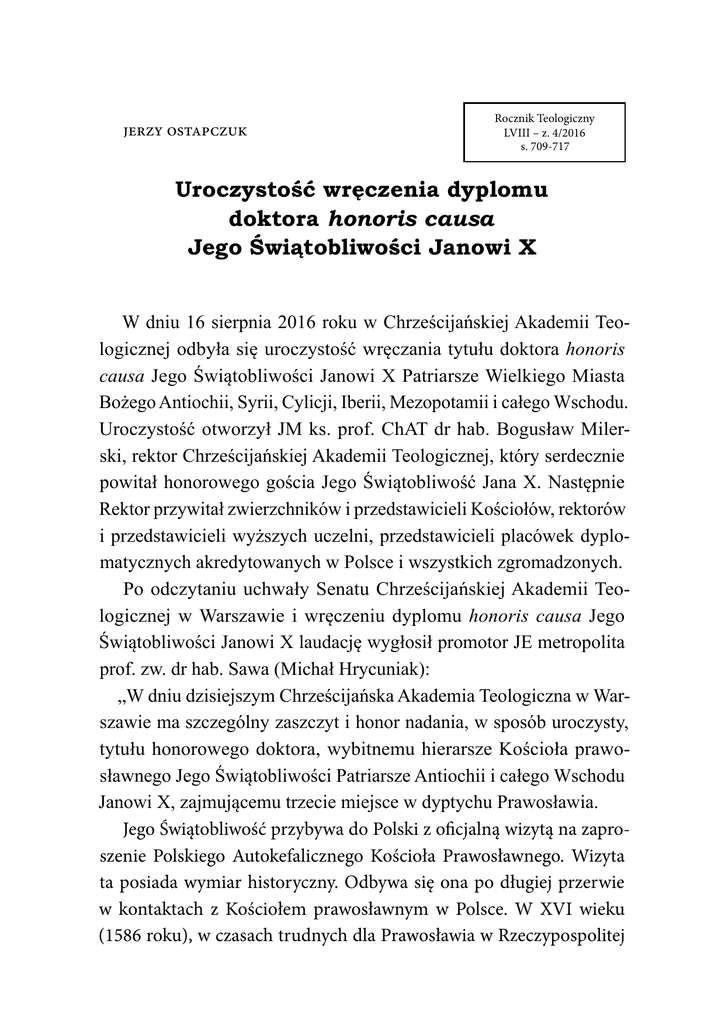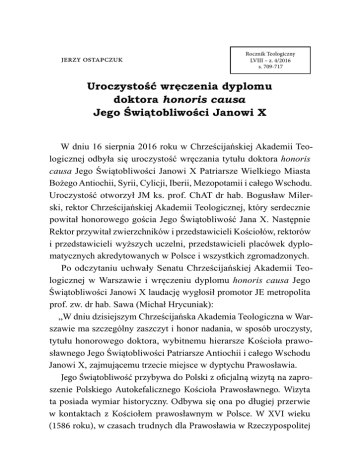 Jerzy Ostapczuk Rocznik Teologiczny LVIII – z. 4/2016 s. 709-717 Uroczystość wręczenia dyplomu doktora honoris causa Jego Świątobliwości Janowi X W dniu 16 sierpnia 2016 roku w Chrześcijańskiej Akademii Teologicznej odbyła się uroczystość wręczania tytułu doktora honoris causa Jego Świątobliwości Janowi X Patriarsze Wielkiego Miasta Bożego Antiochii, Syrii, Cylicji, Iberii, Mezopotamii i całego Wschodu. Uroczystość otworzył JM ks. prof. ChAT dr hab. Bogusław Milerski, rektor Chrześcijańskiej Akademii Teologicznej, który serdecznie powitał honorowego gościa Jego Świątobliwość Jana X. Następnie Rektor przywitał zwierzchników i przedstawicieli Kościołów, rektorów i przedstawicieli wyższych uczelni, przedstawicieli placówek dyplomatycznych akredytowanych w Polsce i wszystkich zgromadzonych. Po odczytaniu uchwały Senatu Chrześcijańskiej Akademii Teologicznej w Warszawie i wręczeniu dyplomu honoris causa Jego Świątobliwości Janowi X laudację wygłosił promotor JE metropolita prof. zw. dr hab. Sawa (Michał Hrycuniak): „W dniu dzisiejszym Chrześcijańska Akademia Teologiczna w Warszawie ma szczególny zaszczyt i honor nadania, w sposób uroczysty, tytułu honorowego doktora, wybitnemu hierarsze Kościoła prawosławnego Jego Świątobliwości Patriarsze Antiochii i całego Wschodu Janowi X, zajmującemu trzecie miejsce w dyptychu Prawosławia. Jego Świątobliwość przybywa do Polski z oficjalną wizytą na zaproszenie Polskiego Autokefalicznego Kościoła Prawosławnego. Wizyta ta posiada wymiar historyczny. Odbywa się ona po długiej przerwie w kontaktach z Kościołem prawosławnym w Polsce. W XVI wieku (1586 roku), w czasach trudnych dla Prawosławia w Rzeczypospolitej 710 Kronika Obojga Narodów, przybył do Lwowa Patriarcha Joachim V i błogosławił działalność Bractwa cerkiewnego, zadaniem którego była obrona wiary prawosławnej w okresie unii brzeskiej. 21 czerwca 1913 roku Patriarcha Grzegorz VII udzielił chirotonii biskupiej przyszłemu metropolicie Polskiego Autokefalicznego Kościoła Prawosławnego Dionizemu, który będąc już metropolitą, złożył wizytę oficjalną w Patriarchacie Antiocheńskim. Ówczesny Patriarcha Grzegorz VII witał metropolitę Dionizego w sposób szczególnie serdeczny. Mówił między innymi: „Dziękuję Bogu, że mogłem ujrzeć mojego umiłowanego syna, zwierzchnika powołanej do istnienia Autokefalicznej Cerkwi prawosławnej w Polsce. Gdy usłyszałem od patriarchy ekumenicznego o ogłoszeniu tej Cerkwi autokefaliczną, moje serce uradowało się i z daleka błogosławiłem waszą autokefalię, niezbędną do zachowania jedności wiary”. Jego Świątobliwość Patriarcha Jan X kontynuuje dzisiejszą wizytą w Polsce współpracę pomiędzy naszymi Kościołami. Przybywa do nas z umęczonej, znękanej wojną, biblijnej ziemi Syrii. Jest to ziemia, na której nawrócony został apostoł Paweł (Dz 9,1-19), ziemia, na której uczniowie Chrystusa nazwani zostali chrześcijanami (Dz 11,26). Jest to ziemia wielu Świętych Ojców, męczenników, pustelników i słynnej szkoły antiocheńskiej. Antiochia była ośrodkiem, z którego Słowo Boże promieniowało we wszystkich kierunkach i odegrało doniosłą rolę w rozprzestrzenianiu chrześcijaństwa nie tylko w Azji Mniejszej, ale i w Grecji, Rzymie. Akta Soborów Powszechnych świadczą o aktywnym udziale Antiocheńczyków w zwalczaniu herezji. Należy tu wspomnieć, że Patriarchat Antiocheński przez całą swoją historię był doświadczany najazdami i różnego rodzaju walkami wewnętrznymi. Również dzisiaj przeżywa on trudne, wręcz tragiczne chwile, narażony jest na stałe zbrojne ataki. Zagrożona jest nawet jego dalsza normalna działalność. Jego Świątobliwość Patriarcha Jan X urodził się w 1955 roku w mieście Latakia, w Syrii. Wychowywał się w domu religijnym znanym Uroczystość wręczenia dyplomu doktora honoris causa 711 z szacunku do wiary prawosławnej i nauki. Ma troje rodzeństwa: brata Pawła, który jest metropolitą Aleppo, a który został uprowadzony 22 kwietnia 2013 roku, a Jego los jest dotychczas nieznany, dwie siostry, z których jedna jest mniszką. Patriarcha Jan X, po ukończeniu nauki w rodzinnym mieście, zapisał się̨ na Wydział Inżynierii Lądowej w Uniwersytecie Tichrin w Latakii, jednocześnie studiując muzykę̨ cerkiewną. Po ukończeniu Wydziału Inżynierii Lądowej rozpoczął studia w Instytucie Teologicznym św. Jana z Damaszku w Balamand. Ukończył je ze stopniem licencjata teologii. Następnie podjął studia doktoranckie na Wydziale Teologicznym Uniwersytetu w Salonikach. W 1981 roku otrzymał dyplom Wyższego Instytutu Muzyki Bizantyjskiej w Salonikach. W 1983 roku uzyskał stopień doktora teologii z wyróżnieniem. W 1979 roku otrzymał święcenia diakońskie, zaś w 1983 roku kapłańskie. Pełnił posługę̨ w duszpasterstwie archidiecezji Latakii. Od 1981 roku wykładał liturgikę̨ w Instytucie Teologicznym św. Jana z Damaszku. Od 2005 roku był także dziekanem tego instytutu. Jednocześnie pełnił funkcję przełożonego w patriarszym monasterze św. Jerzego w Humeira (Syria). Założył tam szkołę̨ studiów cerkiewnych Patriarchatu Antiocheńskiego. W 1995 roku został powołany na biskupa Al-Hosn, otrzymując chirotonię biskupią. Posługę̨ biskupią w swej diecezji pełnił do 2008 roku, kiedy Święty Synod powołał go na metropolitę̨ Europy Zachodniej i Środkowej dla wiernych Patriarchatu Antiocheńskiego. Po śmierci patriarchy antiocheńskiego Ignacego IV Święty Synod 17 grudnia 2012 roku wybrał go na 158. Patriarchę̨ antiocheńskiego i całego Wschodu. Jego Świątobliwość Patriarcha Antiocheński Jan X, oprócz działalności na niwie Kościoła prawosławnego, odgrywał i odgrywa ważną rolę na arenie relacji międzychrześcijańskich poprzez udział w konferencjach, seminariach w Grecji, Włoszech, Szwajcarii, na Cyprze, w Stana