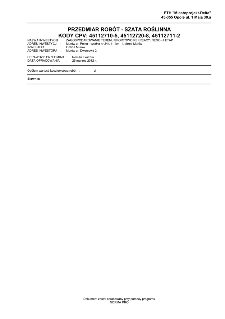 PTH "Miastoprojekt-Delta" 45-355 Opole ul. 1 Maja 30.a PRZEDMIAR ROBÓT - SZATA ROŚLINNA KODY CPV: 45112710-5, 45112720-8, 45112711-2 NAZWA INWESTYCJI ADRES INWESTYCJI INWESTOR ADRES INWESTORA : : : : ZAGOSPODAROWANIE TERENU SPORTOWO REKREACYJNEGO - I ETAP Murów ul. Polna - działka nr 244/11, km. 1, obręb Murów Gmina Murów Murów ul. Dworcowa 2 SPRAWDZIŁ PRZEDMIAR : DATA OPRACOWANIA : Roman Tkaczuk 25 marzec 2012 r. Ogółem wartość kosztorysowa robót : zł Słownie: Dokument został opracowany przy pomocy programu NORMA PRO OGÓLNA CHARAKTERYSTYKA OBIEKTU 1. OPIS INWESTYCJI Omawiana inwestycja polega na wytworzeniu poprzez układy kompozycyjne stref szaty roślinnej oraz płaszczyzn widokowych w miejscowości Murów w obrębie ul. Polnej. Kosztorys obejmuje wykonanie zasadzeń drzew i krzewów, wykonanie trawników i kwietników oraz ukształotowanie terenu. Wielkości i parametry inwestycji: a) trawniki parkowe:: 6315,9 m.kw. b) rabaty wrzosów i wrzośców: 40,0 m.kw. c) ukwiecenia bylinowe: 24,0 m.kw. d) róże kwietnikowe i okrywowe: 72,3 m.kw. e) zioła i rośliny lecznicze: 46,0 m.kw. f) krzewy okrywowe:234,0 m.kw. 2. DANE WYJŚCIOWE DO OPRACOWANIA KOSZTORYSU INWESTORSKIEGO a) Projekt techniczny b) Zakres robót ustalony przez Inwestora c) Rozporządzenia Ministra Infrastruktury, Ministra Rozwoju Regionalnego i Budownictwa, Prezesa Rady Ministrów oraz właściwe ustawy. 3. PODSTAWOWE ZAŁOŻENI KOSZTORYSOWE a) Aktualnie obowiązujące KNNR-y i KNR-y b) Wydawnictwo cenowe "SEKOCENBUD" obowiązujące w danym kwartale b.r. c) Informacje cenowe producentów i dystrybutorów obowiązujące w danym kwartale b.r. 4. ELEMENTY CENOTWÓRCZE - stawka "R" zł/rg - koszty pośrednie "KP" w % - zysk "Z" w % i poziom cen zastosowane przy opracowaniu kosztorysu inwestorskiego zgodnie z pkt. 3 a,b,c. 5. KALKULACJI KOSZTÓW dokonano na podstawie metody szczegółowej oraz w metodzie uproszczonej. 6. KOSZTORYS INWESTORSKI stanowi podstawę dla zleceniodawcy do planowania nakładów finansowych oraz celów przetargowych. 7. INNE USTALENIA mające wpływ na wycenę kosztorysu zawarte zostały w prokekcie i opisie technicznym. Szczegółowe dane dotyczęce rozwiązań technicznych inwestycki zostałe zawarte w projekcie technicznym oraz specyfikacji technicznej i swym zakresem obejmują: wykonanie robót sanitarnych oraz budowlano-drogowych. SPIS ZAŁĄCZNIKÓW 1. Strona tytułowa 2. Część opisowa do kosztorysu inwestorskiego - ogólna charakterystyka obiektu 3. Kosztorys inwestorski -2- Norma PRO Wersja 4.01, Marzec 2003 r. Licencja: 37337 dla abc Kosztorys zieleń-ost Lp. Pozycje kosztorysowe 1 TABELA WARTOŚCI ELEMENTÓW SCALONYCH Nazwa 3 ROBOTY ZIEMNE I UPRAWOWE SADZENIE DRZEW I KRZEWÓW TRAWNIKI I KWIETNIKI RAZEM netto VAT Razem brutto Ogółem wartość kosztorysowa robót W tym: Wartość kosztorysowa robót bez podatku VAT Podatek VAT 1 2 3 2 1-9 10 - 18 19 - 25 Uproszczone Wartość zł Jedn. miary Ilość jedn. Wskaźnik na jednostkę zł 4 5 6 7 8 Słownie: -3- Norma PRO Wersja 4.01, Marzec 2003 r. Licencja: 37337 dla abc Udzi ał procentowy 9 Kosztorys zieleń-ost KSIĄŻKA PRZEDMIARÓW Lp. Podst Opis i wyliczenia Teren rekreacyjno-sportowy w Murowie - KOD CPV 45112000 1 ROBOTY ZIEMNE I UPRAWOWE 1 KNR 2-01 Roboty ziemne z przewozem gruntu taczkami na odległość 20 m kat. gr. III d.1 0307-02 0307-06 110 2 KNR 2-01 d.1 0314-02 3 KNNR 1 d.1 0408-02 4 KNNR 1 d.1 0503-05 j.m. m3 m3 110 m3 Zagęszczanie nasypów z gruntu spoistego kat. III ubijakami mechanicznymi m3 110 m3 Plantowanie (obrobienie na czysto) gruntu nasypowego kat. III m2 200.00+250.00 m2 5 KNNR 1 Ukop ziemi urodzajnej koparkami podsiębiernymi o poj. łyżki 0.25 m3 z transp. m3 d.1 0202-03 ana- urobku na odl. do 1 km sam. samowyład. logia pod drzewa i krzewy 125 m3 6 KNR 2-01 Załadunek humusu uprzednio odspojonego z przewozem taczkami na odlegd.1 0307-01 łość do 40 m do miejsc nasadzeń drzew i krzewów z.sz. 2.2 307-05 analogia 53.11 m3 7 KNR 2-21 d.1 0218-01 m3 8 KNR 2-01 Załadunek torfu z przewozem taczkami na odległość do 40 m do miejsc sad.1 0307-01 dzenia rododendronów i azalii z.sz. 2.2 307-05 analogia 2.60 m3 m3 11 KNR 2-21 d.2 0323-04 12 KNR 2-21 d.2 0311-06 13 KNR 2-21 d.2 0302-06 14 KNR 2-21 d.2 0302-04 15 KNR 2-21 d.2 0302-05 m3 szt. Sadzenie drzew liściastych form piennych na terenie płaskim w gruncie kat. III szt. z całkowitą zaprawą dołów; średnica/głębokość : 0.7 m 22 szt. Sadzenie drzew liściastych form naturalnych na terenie płaskim w gruncie kat. szt. III z całkowitą zaprawą dołów; średnica/głębokość : 0.7 m 19 szt. Sadzenie krzewów liściastych mniejszych, form naturalnych na terenie płaskim szt. w gruncie kat. III z całkowitą zaprawą dołów; średnica/głębokość : 0.3 m 150 szt. Sadzenie krzewów liściastych większych, form naturalnych na terenie płaskim szt. w gruncie kat. III z całkowitą zaprawą dołów; średnica/głębokość : 0.5 m 170 szt. Norma PRO Wersja 4.01, Marzec 2003 r. Licencja: 37337 dla abc 110.00 110.00 RAZEM 110.00 110.00 RAZEM 110.00 450.00 RAZEM 450.00 125.00 RAZEM 125.00 53.11 RAZEM 53.11 154.00 RAZEM 154.00 2.60 RAZEM 2.60 4.00 RAZEM 4.00 9.00 RAZEM 9.00 67.00 RAZEM 67.00 22.00 RAZEM 22.00 19.00 RAZEM 19.00 150.00 RAZEM 150.00 170.00 RAZEM 170.00 szt. Sadzenie krzewów iglastych na terenie płaskim w gruncie kat. III z zaprawą do- szt. łów; średnica/głębokość : 0.5 m 67 szt. -4- 110.00 RAZEM m3 9 KNR 2-21 Rozścielenie torfu ręczne z przerzutem na terenie płaskim pod rabaty wrzosów m3 d.1 0218-01 ana- i wrzośców logia 4.00 m3 2 SADZENIE DRZEW I KRZEWÓW 10 KNR 2-21 Sadzenie drzew iglastych na terenie płaskim w gruncie kat. III z zaprawą d.2 0323-05 dołów; średnica/głębokość : 0.7 m 9 Razem m3 Ręczne formowanie nasypów z ziemi leżącej na odkładzie (kat.gr.III-IV) Rozścielenie ziemi urodzajnej ręczne z przerzutem na terenie płaskim pod trawniki i kwietniki na terenie płaskim, warstwą grub. 4-6