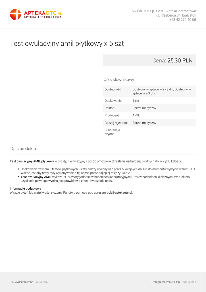 SK-FARM II Sp. z o.o. - Apteka Internetowa ul. Kleeberga 34, Białystok +48 42 279 40 05 Test owulacyjny amil płytkowy x 5 szt Cena: 25,30 PLN Opis słownikowy Dostępność Dostępny w aptece w 2 - 3 dni, Dostępny w aptece w 2-3 dni Opakowanie 1 szt Postać Sprzęt medyczny Producent AMIL Rodzaj rejestracji Sprzęt medyczny Substancja czynna - Opis produktu Test owulacyjny AMIL płytkowy w prosty, nieinwazyjny sposób umożliwia określenie najbardziej płodnych dni w cyklu kobiety. Opakowanie zawiera 5 testów płytkowych. Testy należy wykonywać przez 5 kolejnych dni lub do momentu wykrycia wzrostu LH. Ważne jest aby testy były wykonywane o tej samej porze najlepiej między 10 a 20. Test owulacyjny AMIL wykazał 99 % wiarygodność w badaniach laboratoryjnych i 96% w badaniach klinicznych. Warunkiem uzyskania pewnego wyniku jest prawidłowe przeprowadzenie testu. Informacje dodatkowe W razie pytań lub wątpliwości służymy Państwu pomocą pod adresem [email protected]. Plik wygenerowano: 03-03-2017 Powered by TCPDF (www.tcpdf.org) Oprogramowanie sklepu: AptusShop