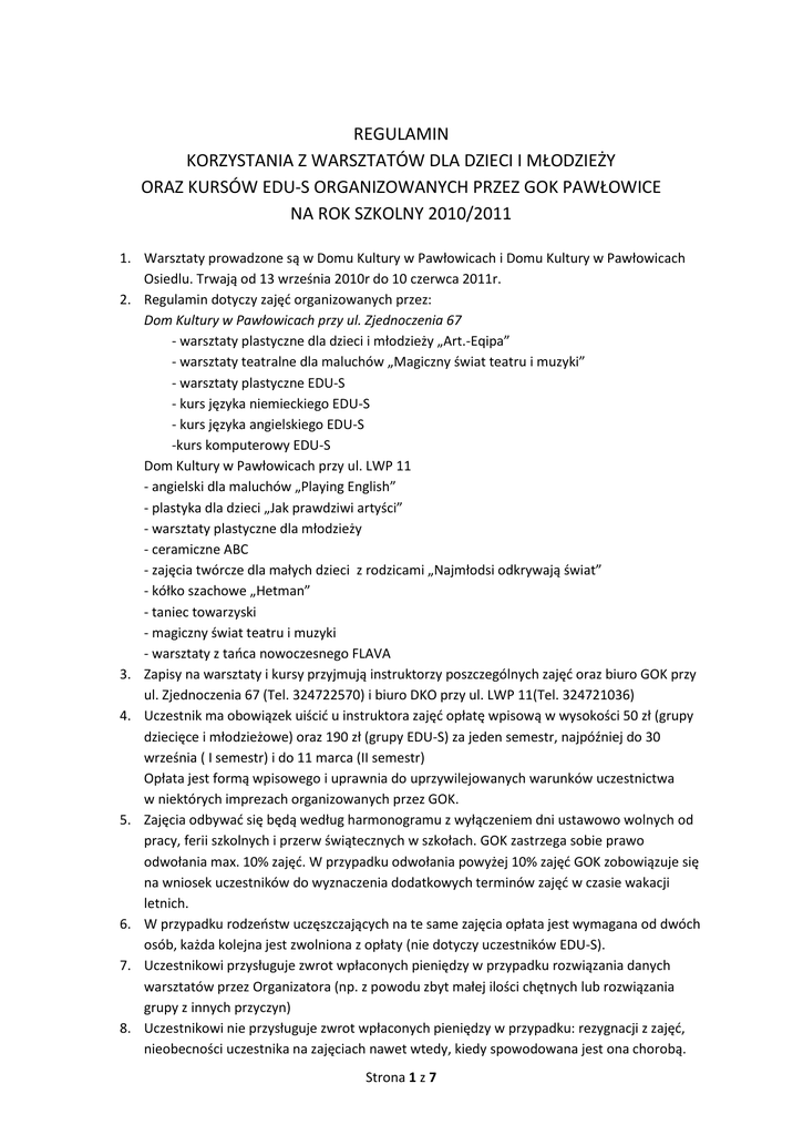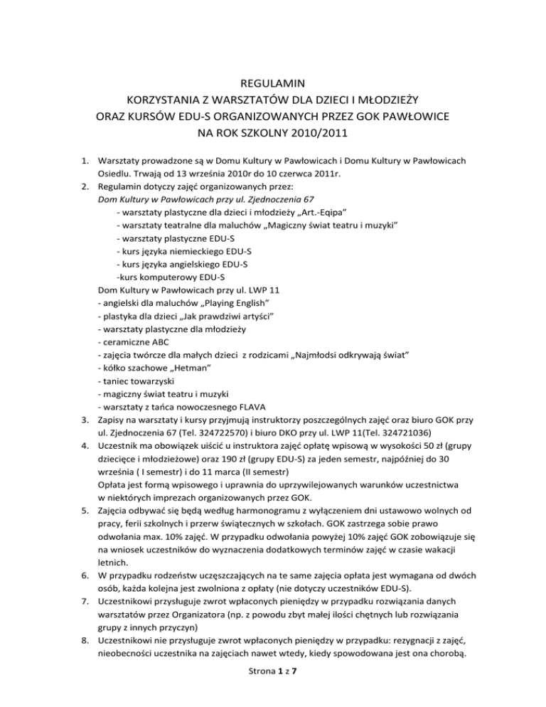 REGULAMIN KORZYSTANIA Z WARSZTATÓW DLA DZIECI I MŁODZIEŻY ORAZ KURSÓW EDU-S ORGANIZOWANYCH PRZEZ GOK PAWŁOWICE NA ROK SZKOLNY 2010/2011 1. Warsztaty prowadzone są w Domu Kultury w Pawłowicach i Domu Kultury w Pawłowicach Osiedlu. Trwają od 13 września 2010r do 10 czerwca 2011r. 2. Regulamin dotyczy zajęd organizowanych przez: Dom Kultury w Pawłowicach przy ul. Zjednoczenia 67 - warsztaty plastyczne dla dzieci i młodzieży „Art.-Eqipa” - warsztaty teatralne dla maluchów „Magiczny świat teatru i muzyki” - warsztaty plastyczne EDU-S - kurs języka niemieckiego EDU-S - kurs języka angielskiego EDU-S -kurs komputerowy EDU-S Dom Kultury w Pawłowicach przy ul. LWP 11 - angielski dla maluchów „Playing English” - plastyka dla dzieci „Jak prawdziwi artyści” - warsztaty plastyczne dla młodzieży - ceramiczne ABC - zajęcia twórcze dla małych dzieci z rodzicami „Najmłodsi odkrywają świat” - kółko szachowe „Hetman” - taniec towarzyski - magiczny świat teatru i muzyki - warsztaty z taoca nowoczesnego FLAVA 3. Zapisy na warsztaty i kursy przyjmują instruktorzy poszczególnych zajęd oraz biuro GOK przy ul. Zjednoczenia 67 (Tel. 324722570) i biuro DKO przy ul. LWP 11(Tel. 324721036) 4. Uczestnik ma obowiązek uiścid u instruktora zajęd opłatę wpisową w wysokości 50 zł (grupy dziecięce i młodzieżowe) oraz 190 zł (grupy EDU-S) za jeden semestr, najpóźniej do 30 września ( I semestr) i do 11 marca (II semestr) Opłata jest formą wpisowego i uprawnia do uprzywilejowanych warunków uczestnictwa w niektórych imprezach organizowanych przez GOK. 5. Zajęcia odbywad się będą według harmonogramu z wyłączeniem dni ustawowo wolnych od pracy, ferii szkolnych i przerw świątecznych w szkołach. GOK zastrzega sobie prawo odwołania max. 10% zajęd. W przypadku odwołania powyżej 10% zajęd GOK zobowiązuje się na wniosek uczestników do wyznaczenia dodatkowych terminów zajęd w czasie wakacji letnich. 6. W przypadku rodzeostw uczęszczających na te same zajęcia opłata jest wymagana od dwóch osób, każda kolejna jest zwolniona z opłaty (nie dotyczy uczestników EDU-S). 7. Uczestnikowi przysługuje zwrot wpłaconych pieniędzy w przypadku rozwiązania danych warsztatów przez Organizatora (np. z powodu zbyt małej ilości chętnych lub rozwiązania grupy z innych przyczyn) 8. Uczestnikowi nie przysługuje zwrot wpłaconych pieniędzy w przypadku: rezygnacji z zajęd, nieobecności uczestnika na zajęciach nawet wtedy, kiedy spowodowana jest ona chorobą. Strona 1 z 7 9. Po zakooczeniu zajęd każdy uczestnik otrzyma dyplom potwierdzający jego udział w warsztatach. 10. Szczegółowe dane dotyczące grup (liczebnośd, wiek uczestników, ilośd godzin zajęd) określają poniższe tabele. 11. Za promocję zajęd i terminowe rozliczanie wpłat odpowiedzialni są instruktorzy poszczególnych grup. Zajęcia dla dzieci i młodzieży w Domu Kultury przy ul. Zjednoczenia 67 Nazwa zajęć Czego się dziecko nauczy instruktor Wiek uczestników Wielkość grupy Ilość godzin tygodniowo 6-11 lat 6-14 osób 3 12-20 lat 6-14 osób 4 5-6 lat 6-10 osób 1,5 - podstawy rysunku artystycznego Warsztaty plastyczne „ART-Eqipa” - portretowanie - pastel i ołówek Instruktor - Agnieszka Kornas - Wiśniewska - doskonalenie malarstwa sztalugowego - rozbudzanie dziecięcej wyobraźni na poziomie słuchowo – ruchowo – językowym Warsztaty teatralne dla maluchów „Magiczny świat teatru i muzyki” Instruktor – Ewa Sikora, Monika Janecka - Wardak - wprowadzenie dzieci do twórczego działania w grupie - Poznawanie różnych form teatru oraz elementów warsztatu aktorskiego: ruchu, dykcji, tańca, śpiewu. - Zaznajomienie się z różnymi rodzajami muzyki, rytmów, instrumentów muzycznych. -prostych piosenek, układów choreograficznych, tekstów i literatury dziecięcej. Zajęcia EDU-S Nazwa zajęć, Rok nauki, instruktor Materiał do opanowania. Tematyka zajęć, podręczniki Wielkość grup Ilość godzin tygodniowo 6-13 osób 3 godz. 7-9 osób 3 godz. - Malowanie na tkaninach WARSZTATY PLASTYCZNE Instruktor Agnieszka Kornas - Wiśniewska - BATIK jako forma użytkowa - Rysunek (ołówek, tusz) - Malarstwo sztalugowe - Ceramika i koło garncarskie - Makramy i biżuteria ZAJĘCIA KOMPUTEROWE - Podstawy technik informatycznych i komunikacyjnych Strona 2 z 7 Grupa podstawowa (I rok) - Pojęcia z zakresu hardware i czynniki wpływające na jego wydajność Instruktor - urządzenia peryferyjne Mariusz Grygier - Sieci komputerowe i sposoby łączenia się z Internetem - Zagadnienia związane z BHP przy użyciu komputera - Korzystanie z głównych elementów systemu operacyjnego, sprawnego poruszania się po środowisku graficznym Windows - Edytor tekstu – tworzenie, edycja i zapisywanie dokumentu. - Internet – wyszukiwanie informacji - E-mail – tworzenie i korzystanie z konta pocztowego - Pojęcia z zakresu software dotyczące powszechnych aplikacji oraz oprogramowania - Zagadnienia prawne związane z użytkowaniem komputera ZAJĘCIA KOMPUTEROWE Grupa śr. zaawansowana (II rok) - Ustawianie najważniejszych parametrów konfiguracyjnych komputera - Podstawy zarządzania plikami w tym organizacja plików i folderów Instruktor - Arkusz kalkulacyjny – edycja komórek, wierszy i kolumn Mariusz Grygier - Praca z plikami graficznymi 6-9 3 godz. 5-9 3 godz. - Zapisywanie, kopiowanie stron www oraz ich fragmentów do wybranych aplikacji - Komunikatory - GG, Skype, Tlen - System operacyjny -instalowanie, sterowniki, podstawowe aplikacje związane z systemem i urządzeniami peryferyjnymi ZAJĘCIA KOMPUTEROWE - Operacje na plikach i folderach Grupa zaawansowana - Operacje na kontach użytkownika (III rok) - Zmiany podstawowych i zaawansowanych ustawień systemowych Instruktor Mariusz Grygier - Edytor tekstu – Word, Writer – edycja tekstu, wstawianie grafiki, tabele, korespondencja seryjna - Arkusz kalkulacyjny – praca z arkuszami, tabele, wykresy, for