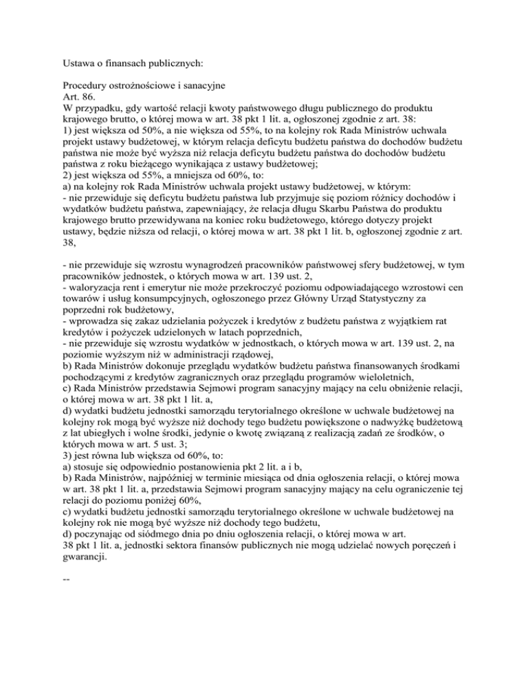 Ustawa o finansach publicznych: Procedury ostrożnościowe i sanacyjne Art. 86. W przypadku, gdy wartość relacji kwoty państwowego długu publicznego do produktu krajowego brutto, o której mowa w art. 38 pkt 1 lit. a, ogłoszonej zgodnie z art. 38: 1) jest większa od 50%, a nie większa od 55%, to na kolejny rok Rada Ministrów uchwala projekt ustawy budżetowej, w którym relacja deficytu budżetu państwa do dochodów budżetu państwa nie może być wyższa niż relacja deficytu budżetu państwa do dochodów budżetu państwa z roku bieżącego wynikająca z ustawy budżetowej; 2) jest większa od 55%, a mniejsza od 60%, to: a) na kolejny rok Rada Ministrów uchwala projekt ustawy budżetowej, w którym: - nie przewiduje się deficytu budżetu państwa lub przyjmuje się poziom różnicy dochodów i wydatków budżetu państwa, zapewniający, że relacja długu Skarbu Państwa do produktu krajowego brutto przewidywana na koniec roku budżetowego, którego dotyczy projekt ustawy, będzie niższa od relacji, o której mowa w art. 38 pkt 1 lit. b, ogłoszonej zgodnie z art. 38, - nie przewiduje się wzrostu wynagrodzeń pracowników państwowej sfery budżetowej, w tym pracowników jednostek, o których mowa w art. 139 ust. 2, - waloryzacja rent i emerytur nie może przekroczyć poziomu odpowiadającego wzrostowi cen towarów i usług konsumpcyjnych, ogłoszonego przez Główny Urząd Statystyczny za poprzedni rok budżetowy, - wprowadza się zakaz udzielania pożyczek i kredytów z budżetu państwa z wyjątkiem rat kredytów i pożyczek udzielonych w latach poprzednich, - nie przewiduje się wzrostu wydatków w jednostkach, o których mowa w art. 139 ust. 2, na poziomie wyższym niż w administracji rządowej, b) Rada Ministrów dokonuje przeglądu wydatków budżetu państwa finansowanych środkami pochodzącymi z kredytów zagranicznych oraz przeglądu programów wieloletnich, c) Rada Ministrów przedstawia Sejmowi program sanacyjny mający na celu obniżenie relacji, o której mowa w art. 38 pkt 1 lit. a, d) wydatki budżetu jednostki samorządu terytorialnego określone w uchwale budżetowej na kolejny rok mogą być wyższe niż dochody tego budżetu powiększone o nadwyżkę budżetową z lat ubiegłych i wolne środki, jedynie o kwotę związaną z realizacją zadań ze środków, o których mowa w art. 5 ust. 3; 3) jest równa lub większa od 60%, to: a) stosuje się odpowiednio postanowienia pkt 2 lit. a i b, b) Rada Ministrów, najpóźniej w terminie miesiąca od dnia ogłoszenia relacji, o której mowa w art. 38 pkt 1 lit. a, przedstawia Sejmowi program sanacyjny mający na celu ograniczenie tej relacji do poziomu poniżej 60%, c) wydatki budżetu jednostki samorządu terytorialnego określone w uchwale budżetowej na kolejny rok nie mogą być wyższe niż dochody tego budżetu, d) poczynając od siódmego dnia po dniu ogłoszenia relacji, o której mowa w art. 38 pkt 1 lit. a, jednostki sektora finansów publicznych nie mogą udzielać nowych poręczeń i gwarancji. --