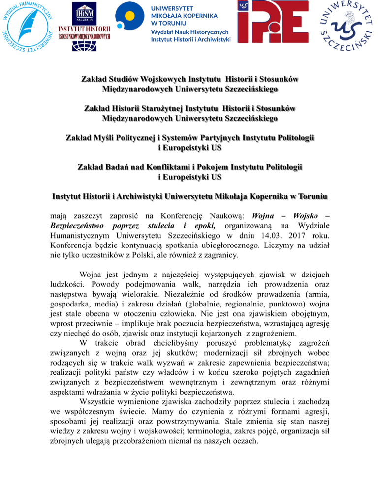 Zakład Studiów Wojskowych Instytutu Historii i Stosunków Międzynarodowych Uniwersytetu Szczecińskiego Zakład Historii Starożytnej Instytutu Historii i Stosunków Międzynarodowych Uniwersytetu Szczecińskiego Zakład Myśli Politycznej i Systemów Partyjnych Instytutu Politologii i Europeistyki US Zakład Badań nad Konfliktami i Pokojem Instytutu Politologii i Europeistyki US Instytut Historii i Archiwistyki Uniwersytetu Mikołaja Kopernika w Toruniu mają zaszczyt zaprosić na Konferencję Naukową: Wojna – Wojsko – Bezpieczeństwo poprzez stulecia i epoki, organizowaną na Wydziale Humanistycznym Uniwersytetu Szczecińskiego w dniu 14.03. 2017 roku. Konferencja będzie kontynuacją spotkania ubiegłorocznego. Liczymy na udział nie tylko uczestników z Polski, ale również z zagranicy. Wojna jest jednym z najczęściej występujących zjawisk w dziejach ludzkości. Powody podejmowania walk, narzędzia ich prowadzenia oraz następstwa bywają wielorakie. Niezależnie od środków prowadzenia (armia, gospodarka, media) i zakresu działań (globalnie, regionalnie, punktowo) wojna jest stale obecna w otoczeniu człowieka. Nie jest ona zjawiskiem obojętnym, wprost przeciwnie – implikuje brak poczucia bezpieczeństwa, wzrastającą agresję czy niechęć do osób, zjawisk oraz instytucji kojarzonych z zagrożeniem. W trakcie obrad chcielibyśmy poruszyć problematykę zagrożeń związanych z wojną oraz jej skutków; modernizacji sił zbrojnych wobec rodzących się w trakcie walk wyzwań w zakresie zapewnienia bezpieczeństwa; realizacji polityki państw czy władców i w końcu szeroko pojętych zagadnień związanych z bezpieczeństwem wewnętrznym i zewnętrznym oraz różnymi aspektami wdrażania w życie polityki bezpieczeństwa. Wszystkie wymienione zjawiska zachodziły poprzez stulecia i zachodzą we współczesnym świecie. Mamy do czynienia z różnymi formami agresji, sposobami jej realizacji oraz powstrzymywania. Stale zmienia się stan naszej wiedzy z zakresu wojny i wojskowości; terminologia, zakres pojęć, organizacja sił zbrojnych ulegają przeobrażeniom niemal na naszych oczach. Mamy nadzieję, że wymiana poglądów pozwoli uczestnikom szerzej spojrzeć na współczesne wyzwania stojące przed narodami w zakresie powstrzymania wojen, konfliktów, zamachów terrorystycznych. Pozwoli dostrzec podobieństwa i różnice, prawidłowości zachodzące w działaniach na rzecz budowy i utrzymania stanu bezpieczeństwa w państwach, na kontynentach, a także w skali globalnej. Proponujemy uczestnikom prace w kilku panelach: • Stereotypy w historii wojskowości • Wojskowość a polityka i dyplomacja • Wojsko a prawo krajowe, międzynarodowe i prawa człowieka • Technika wojskowa i broń biologiczna, chemiczna oraz jądrowa – rozwój i przemiany • Sztuka wojenna od starożytności po współczesność • Bezpieczeństwo, wywiad, kontrwywiad, przeszłość – teraźniejszość – przyszłość • Obrona terytorialna i organizacje paramilitarne Konferencja odbędzie się w dniu 14.03. 2017 r. Zgłoszenia tematów i abstrakty przyjmujemy do 31.01.2017 r. Opłata konferencyjna wynosi 400 zł. Wliczone są w nią: obiad, kawa w trakcie przerwy i wydanie publikacji. Publikacja zostanie ogłoszona drukiem w 2017 r. Konto na dokonanie opłaty konferencyjnej zostanie podane uczestnikom w styczniu 2017 roku. Organizatorzy: Zakład Studiów Wojskowych IHiSM US Zakład Historii Starożytnej IHiSM US Zakład Myśli Politycznej i Systemów Partyjnych IPiE US Zakład Badań nad Konfliktami i Pokojem IPiE US Instytut Historii i Archiwistyki UMK w Toruniu Kontakt: Prof. US Henryk Walczak Tel. Kontaktowy: 695 633 767 Mail: [email protected] Prof. US Renata Gałaj-Dempniak Tel. kontaktowy: 608 446 567 Mail: [email protected]
