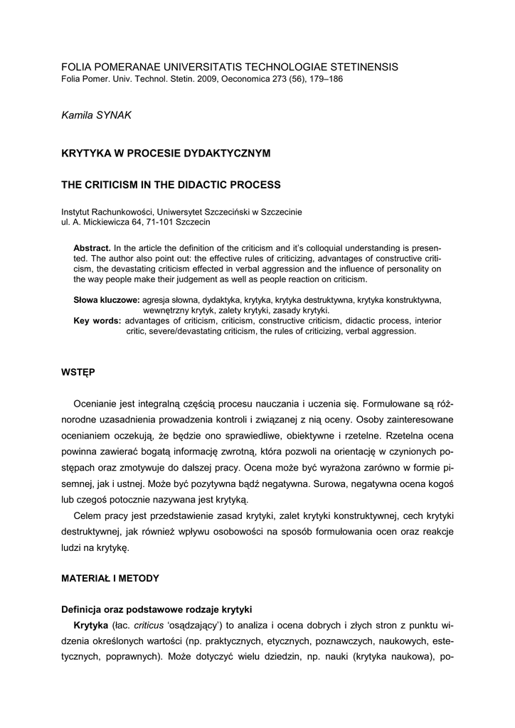 FOLIA POMERANAE UNIVERSITATIS TECHNOLOGIAE STETINENSIS Folia Pomer. Univ. Technol. Stetin. 2009, Oeconomica 273 (56), 179–186 Kamila SYNAK KRYTYKA W PROCESIE DYDAKTYCZNYM THE CRITICISM IN THE DIDACTIC PROCESS Instytut Rachunkowości, Uniwersytet Szczeciński w Szczecinie ul. A. Mickiewicza 64, 71-101 Szczecin Abstract. In the article the definition of the criticism and it’s colloquial understanding is presented. The author also point out: the effective rules of criticizing, advantages of constructive criticism, the devastating criticism effected in verbal aggression and the influence of personality on the way people make their judgement as well as people reaction on criticism. Słowa kluczowe: agresja słowna, dydaktyka, krytyka, krytyka destruktywna, krytyka konstruktywna, wewnętrzny krytyk, zalety krytyki, zasady krytyki. Key words: advantages of criticism, criticism, constructive criticism, didactic process, interior critic, severe/devastating criticism, the rules of criticizing, verbal aggression. WSTĘP Ocenianie jest integralną częścią procesu nauczania i uczenia się. Formułowane są róŜnorodne uzasadnienia prowadzenia kontroli i związanej z nią oceny. Osoby zainteresowane ocenianiem oczekują, Ŝe będzie ono sprawiedliwe, obiektywne i rzetelne. Rzetelna ocena powinna zawierać bogatą informację zwrotną, która pozwoli na orientację w czynionych postępach oraz zmotywuje do dalszej pracy. Ocena moŜe być wyraŜona zarówno w formie pisemnej, jak i ustnej. MoŜe być pozytywna bądź negatywna. Surowa, negatywna ocena kogoś lub czegoś potocznie nazywana jest krytyką. Celem pracy jest przedstawienie zasad krytyki, zalet krytyki konstruktywnej, cech krytyki destruktywnej, jak równieŜ wpływu osobowości na sposób formułowania ocen oraz reakcje ludzi na krytykę. MATERIAŁ I METODY Definicja oraz podstawowe rodzaje krytyki Krytyka (łac. criticus ‘osądzający’) to analiza i ocena dobrych i złych stron z punktu widzenia określonych wartości (np. praktycznych, etycznych, poznawczych, naukowych, estetycznych, poprawnych). MoŜe dotyczyć wielu dziedzin, np. nauki (krytyka naukowa), po- 180 K. Synak prawności formalnej (krytyka logiczna), poprawności merytorycznej (krytyka merytoryczna lub krytyka empiryczna), metod (krytyka metodologiczna). W mowie potocznej wyraz „krytyka” oznacza zwykle wystąpienie (słowne lub pisemne) przeciwko jakiemuś zjawisku, osobie, faktowi lub sposobowi rozwiązania problemu, co jest powiązane z negatywną oceną tych faktów (Krytyka 2009).Krytyka moŜe przybrać konstruktywną bądź destruktywną formę. Konstruktywna krytyka to rodzaj krytyki, która charakteryzuje się tym, Ŝe osoba krytykująca przedstawia lub sugeruje jednocześnie sposób lub sposoby rozwiązania problemu poddanego krytyce (Konstruktywna krytyka 2009). Konstruktywna krytyka jest informacją zwrotną niezbędną do tego, by podąŜać dobrą ścieŜką i wprowadzać odpowiednie korekty. Wymaga ona wysiłku, a do tego jest przejawem szczerości i traktowania drugiej osoby i jej pracy z odpowiednim szacunkiem. Destruktywna krytyka jest zazwyczaj wyraŜana w formie ogólnych, subiektywnych uwag koncentrujących się na cechach osobistych; przyjmuje formę nieobiektywnych komentarzy. Brak krytyki jest równie niedobry, jak jej nadmiar lub nieodpowiednia forma. W Ŝyciu nieustannie podlegamy krytyce oraz sami wyraŜamy krytyczne uwagi, dlatego warto poznać podstawowe jej zasady. WYNIKI I DYSKUSJA Zasady skutecznej krytyki Przekazywanie dobrych wiadomości, a więc udzielanie pochwał jest niewątpliwie znacznie łatwiejsze zarówno dla oceniającego, jak i ocenianego. Informacje o tym, Ŝe coś nie spełnia naszych oczekiwań, udzielanie nagany jest duŜo bardziej obciąŜające emocjonalnie. Wzmacnianie dobrych działań i zachowań, a takŜe korygowanie działań niepoŜądanych powinno być konstruktywne. Zdolność przekazywania krytycznych uwag innym jest warunkiem niezbędnym skutecznego działania. By informacja była skuteczna, osoba oceniająca, formułując uwagi, powinna (Bee 2002): a) przeprowadzić analizę aktualnej sytuacji; b) określić cele, do jakich się dąŜy oraz skonstruować strategię zapewniającą ich osiągnięcie; c) wziąć pod uwagę zróŜnicowanie ludzi pod względem moŜliwości przyjmowania krytyki; d) wykreować właściwą atmosferę; rozmowa powinna przebiegać w przyjaznej atmosferze, w której ludzie otwarci są na informacje wypowiadane bez negatywnych emocji; atmosfera zaufania, wzajemnego szacunku jest konieczna do oferowania i przyjmowania krytyki; e) skutecznie się komunikować; f) przekazywać wiadomości odpowiednim tonem; g) aktywnie słuchać; h) obserwować rozmówcę; i) zadawać pytania; Krytyka w procesie dydaktycznym 181 j) opisać zachowanie, które chcemy zmienić, pamiętając, Ŝe zachowanie, a nie cecha człowieka, stanowi element, który wymaga korekty; k) opisać poŜądane zachowanie; l) wspólnie szukać rozwiązań; istotne jest, aby udzielając wskazówek czy zadając pytania, zachęcić rozmówcę do samodzielnego rozwiązania problemu; m) wybrać odpowiednią formę; krytykę podajemy w wersji „kanapkowej”: najpierw coś pozytywnego, potem coś negatywnego, na koniec znów coś pozytywnego. Powstaje z tego „strawna kanapka”, którą osoba krytykowana jest w stanie przełknąć i, co waŜne, „strawić”, czyli przyswoić informację; n) osiągnąć porozumienie. o) Określone zasady konstruowania oceny są bardzo istotne w pracy dydaktycznej. Pozwalają oceniającemu kontrolować emocje, co wpływa na przejrzystość oraz efektywność komunikacji. Nauczyciel skoncentrowany na ocenie pracy wykonanej przez studenta unika formułowania osobistych komentarzy, bowiem „[…] nie ma dowodów na to, Ŝe Bóg powierzył ocenianie i kreowanie wszystkiego naukowcom […]”(Banach 2000, s. 7). Osoba oceniana zaś krytykę, sformułowaną zgodnie z powyŜszymi zasadami, przyjmuj