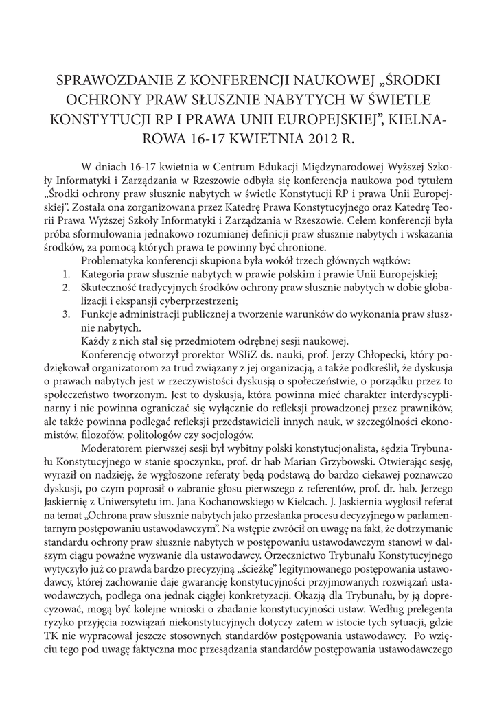 SPRAWOZDANIE Z KONFERENCJI NAUKOWEJ „ŚRODKI OCHRONY PRAW SŁUSZNIE NABYTYCH W ŚWIETLE KONSTYTUCJI RP I PRAWA UNII EUROPEJSKIEJ”, KIELNAROWA 16-17 KWIETNIA 2012 R. W dniach 16-17 kwietnia w Centrum Edukacji Międzynarodowej Wyższej Szkoły Informatyki i Zarządzania w Rzeszowie odbyła się konferencja naukowa pod tytułem „Środki ochrony praw słusznie nabytych w świetle Konstytucji RP i prawa Unii Europejskiej”. Została ona zorganizowana przez Katedrę Prawa Konstytucyjnego oraz Katedrę Teorii Prawa Wyższej Szkoły Informatyki i Zarządzania w Rzeszowie. Celem konferencji była próba sformułowania jednakowo rozumianej definicji praw słusznie nabytych i wskazania środków, za pomocą których prawa te powinny być chronione. Problematyka konferencji skupiona była wokół trzech głównych wątków: 1. Kategoria praw słusznie nabytych w prawie polskim i prawie Unii Europejskiej; 2. Skuteczność tradycyjnych środków ochrony praw słusznie nabytych w dobie globalizacji i ekspansji cyberprzestrzeni; 3. Funkcje administracji publicznej a tworzenie warunków do wykonania praw słusznie nabytych. Każdy z nich stał się przedmiotem odrębnej sesji naukowej. Konferencję otworzył prorektor WSIiZ ds. nauki, prof. Jerzy Chłopecki, który podziękował organizatorom za trud związany z jej organizacją, a także podkreślił, że dyskusja o prawach nabytych jest w rzeczywistości dyskusją o społeczeństwie, o porządku przez to społeczeństwo tworzonym. Jest to dyskusja, która powinna mieć charakter interdyscyplinarny i nie powinna ograniczać się wyłącznie do refleksji prowadzonej przez prawników, ale także powinna podlegać refleksji przedstawicieli innych nauk, w szczególności ekonomistów, filozofów, politologów czy socjologów. Moderatorem pierwszej sesji był wybitny polski konstytucjonalista, sędzia Trybunału Konstytucyjnego w stanie spoczynku, prof. dr hab Marian Grzybowski. Otwierając sesję, wyraził on nadzieję, że wygłoszone referaty będą podstawą do bardzo ciekawej poznawczo dyskusji, po czym poprosił o zabranie głosu pierwszego z referentów, prof. dr. hab. Jerzego Jaskiernię z Uniwersytetu im. Jana Kochanowskiego w Kielcach. J. Jaskiernia wygłosił referat na temat „Ochrona praw słusznie nabytych jako przesłanka procesu decyzyjnego w parlamentarnym postępowaniu ustawodawczym”. Na wstępie zwrócił on uwagę na fakt, że dotrzymanie standardu ochrony praw słusznie nabytych w postępowaniu ustawodawczym stanowi w dalszym ciągu poważne wyzwanie dla ustawodawcy. Orzecznictwo Trybunału Konstytucyjnego wytyczyło już co prawda bardzo precyzyjną „ścieżkę” legitymowanego postępowania ustawodawcy, której zachowanie daje gwarancję konstytucyjności przyjmowanych rozwiązań ustawodawczych, podlega ona jednak ciągłej konkretyzacji. Okazją dla Trybunału, by ją doprecyzować, mogą być kolejne wnioski o zbadanie konstytucyjności ustaw. Według prelegenta ryzyko przyjęcia rozwiązań niekonstytucyjnych dotyczy zatem w istocie tych sytuacji, gdzie TK nie wypracował jeszcze stosownych standardów postępowania ustawodawcy. Po wzięciu tego pod uwagę faktyczna moc przesądzania standardów postępowania ustawodawczego ROCZNIKI ADMINISTRACJI I PRAWA. TEORIA I PRAKTYKA. ROK XII w tym zakresie należy do TK. Jest to jednak oczywiste w sytuacji, gdy faktyczna treść konstytucyjnej dyspozycji uzależniona jest od „odczytania” klauzuli generalnej przez TK. Rodzi to oczywiście pytanie o istotę suwerenności, ludowładztwa i treści mandatu przedstawicielskiego w zakresie tworzenia prawa w konfrontacji z aktywizmem sądowym, ale dylematu tego nie da się rozstrzygnąć tak długo, jak długo ustrojodawca nie wyartykułuje expressis verbis treści tej zasady. W tej sytuacji, zdaniem panelisty, pozostaje doskonalenie dotychczasowego modelu drogą precyzowania standardów orzeczniczych w zakresie ochrony praw słusznie nabytych i ich precyzyjnego stosowania w procesie stanowienia ustaw. Następnym prelegentem był prof. dr hab. Jerzy Menkes ze Szkoły Wyższej Psychologii Społecznej w Warszawie, który swe wystąpienie zatytułował „Zasada nieinflacyjnego wzrostu w prawie europejskim – charakterystyka prawnicza”. Podkreślił on, że norma stanowiąca podstawę prawną ochrony praw słusznie nabytych w polskim krajowym porządku prawnym ma swoją treść i rangę zarówno w prawie pozytywnym – prawie konstytucyjnym, jak i doktrynie prawa. Ta jednoznaczność ma miejsce, mimo że ani obecna, ani wcześniejsze konstytucje nie przyznawały/nie gwarantowały jej w sposób wyraźny w regulacji szczegółowej. Panelista zauważył, że powszechnie uznaje się, że zasada ochrony praw słusznie nabytych jest elementem konstytutywnym istoty demokratycznego państwa prawnego. Ugruntowanie tej normy we wspólnej tradycji konstytucyjnej demokratycznego państwa prawnego pozwoliło, mimo że ustrojodawca polski nie skorzystał z możliwości, jaką dawało tworzenie nowej ustawy zasadniczej dla wprowadzenia zasady ochrony praw słusznie nabytych do konstytucji, na konsekwentne podtrzymywanie konsensu w odniesieniu do jej treści i rangi w porządku prawnym RP. Zdaniem referenta próba odczytania normy w poszerzonym zakresie wydaje się zadaniem co najmniej karkołomnym. Mimo to próba ta została przez niego podjęta. Zauważył on, że wzrost podaży pieniądza ze strony banku centralnego jest źródłem inflacji, która pozbawia właścicieli części realnej wartości zasobów pieniężnych stanowiących ich własność. To działanie państwa nakłada na właścicieli zobowiązania podatkowe niemające właściwej podstawy prawnej. Narzędziem ochrony może być ustrojowa kotwica podatkowa w reżimie norm konstytucyjnych prawa krajowego lub europejskiego. Finansowanie rozwoju inflacją wątpliwie służy rozwojowi, na pewno pozbawia/ogranicza własność. Po profesorze Menkesie głos zabrała prof. dr hab. Iwona Ni