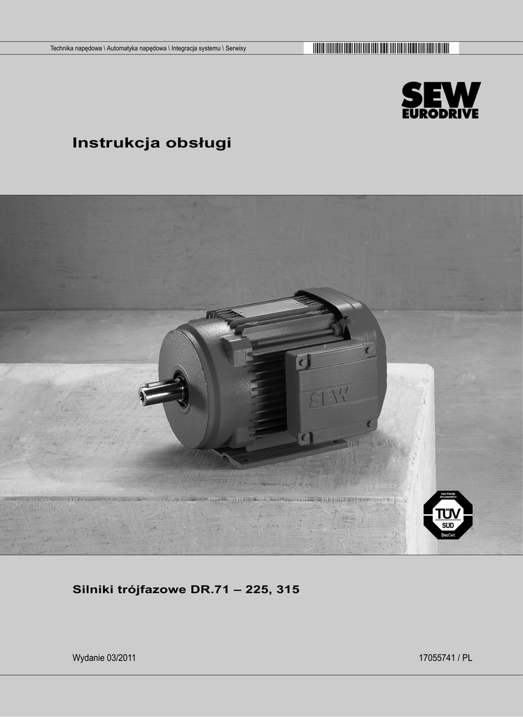 Technika napędowa \ Automatyka napędowa \ Integracja systemu \ Serwisy Instrukcja obsługi Silniki trójfazowe DR.71 – 225, 315 Wydanie 03/2011 17055741 / PL SEW-EURODRIVE—Driving the world Spis tresci Spis tresci 1 Wskazówki ogólne ................................................................................................. 6 1.1 Korzystanie z dokumentacji ........................................................................... 6 1.2 Struktura wskazówek bezpieczeństwa........................................................... 6 1.3 Roszczenia z tytułu odpowiedzialności za wady............................................ 7 1.4 Wykluczenie odpowiedzialności..................................................................... 7 1.5 Prawa autorskie ............................................................................................. 7 1.6 Nazwa produktu i znak towarowy................................................................... 7 2 Wskazówki bezpieczeństwa .................................................................................. 8 2.1 Uwagi wstępne............................................................................................... 8 2.2 Informacje ogólne .......................................................................................... 8 2.3 Grupa docelowa ............................................................................................. 9 2.4 Funkcjonalna technika bezpieczeństwa (FS)................................................. 9 2.5 Użytkowanie zgodne z przeznaczeniem ...................................................... 10 2.6 Dokumentacja uzupełniająca ....................................................................... 11 2.7 Transport / magazynowanie......................................................................... 11 2.8 Ustawienie .................................................................................................. 12 2.9 Podłączenie elektryczne .............................................................................. 12 2.10 Uruchomienie / eksploatacja ........................................................................ 13 3 Budowa silnika ..................................................................................................... 14 3.1 Ogólna budowa DR.71 – DR.132................................................................. 14 3.2 Ogólna budowa DR.160 – DR.180............................................................... 15 3.3 Ogólna budowa DR.200 – DR.225............................................................... 16 3.4 Ogólna budowa DR.315............................................................................... 17 3.5 Tabliczka znamionowa, oznaczenie typu..................................................... 18 3.6 Wyposażenie dodatkowe ............................................................................. 19 4 Instalacja mechaniczna ....................................................................................... 22 4.1 Przed rozpoczęciem..................................................................................... 22 4.2 Długotrwałe przechowywanie silników ......................................................... 23 4.3 Wskazówki na temat ustawiania silnika ....................................................... 25 4.4 Tolerancje przy pracach montażowych........................................................ 26 4.5 Naciąganie elementów napędu.................................................................... 26 4.6 Zwalnianie ręczne HR/HF ............................................................................ 27 4.7 Montaż enkodera zewnętrznego .................................................................. 28 4.8 Montowanie urządzenia montażowego enkodera XV.A do silników DR.71 – 225 ................................................................................... 29 4.9 Obracanie skrzynki zaciskowej .................................................................... 31 4.10 Wyposażenie dodatkowe ............................................................................. 32 5 Instalacja elektryczna .......................................................................................... 35 5.1 Dodatkowe przepisy..................................................................................... 35 5.2 Korzystanie ze schematów połączeń i schematów elektrycznych ............... 35 5.3 Uwagi dot. okablowania ............................................................................... 35 5.4 Cechy szczególne podczas pracy z przetwornicą częstotliwości................. 36 5.5 Polepszenie uziemienia (EMC) .................................................................... 38 5.6 Cechy szczególne podczas pracy łączeniowej ............................................ 41 Instrukcja obsługi – Silniki trójfazowe DR.71-225, 315 3 Spis tresci 5.7 5.8 5.9 5.10 5.11 5.12 5.13 5.14 Cechy szczególne w przypadku silników momentowych i silników wielobiegunowych ................................................ 41 Warunki otoczenia podczas pracy ............................................................... 42 Wskazówki na temat podłączania silnika ..................................................... 43 Podłączanie silnika poprzez płytę zaciskową............................................... 44 Podłączanie silnika poprzez złącze wtykowe............................................... 53 Podłączanie silnika poprzez zacisk szeregowy............................................ 58 Podłączenie hamulca ................................................................................... 60 Wyposażenie dodatkowe ............................................................................. 62 6 Uruchomienie ....................................................................................................... 70 6.1 Przed uruchomieniem .....................