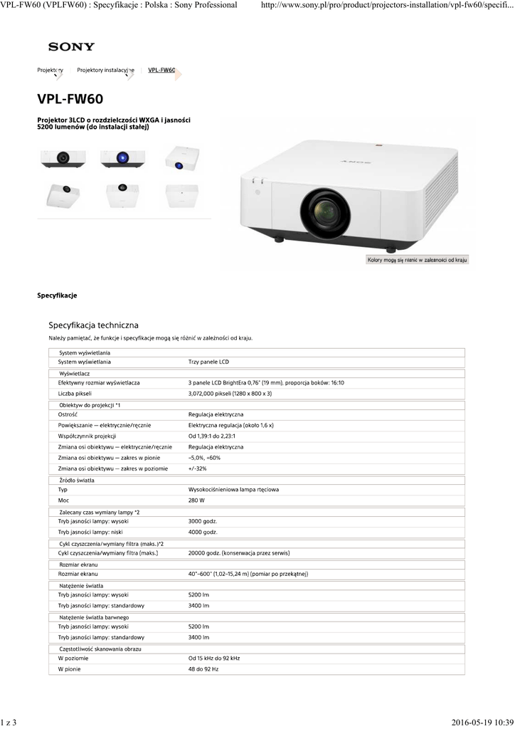 VPL-FW60 (VPLFW60) : Specyfikacje : Polska : Sony Professional http://www.sony.pl/pro/product/projectors-installation/vpl-fw60/specifi... System wyświetlania Wyświetlacz Obiektyw do projekcji *1 Źródło światła Zalecany czas wymiany lampy *2 Cykl czyszczenia/wymiany filtra (maks.)*2 Rozmiar ekranu Natężenie światła Natężenie światła barwnego Częstotliwość skanowania obrazu 1z3 2016-05-19 10:39 VPL-FW60 (VPLFW60) : Specyfikacje : Polska : Sony Professional http://www.sony.pl/pro/product/projectors-installation/vpl-fw60/specifi... Obsługiwana rozdzielczość System koloru Korekcja zniekształceń trapezowych (maks.) Język menu ekranowego WEJŚCIE WYJŚCIE (komputer/wideo/sterowanie) Poziom głośności Temperatura/wilgotność w środowisku pracy Temperatura/wilgotność podczas przechowywania Zasilanie Pobór mocy Pobór mocy (w trybie czuwania) Pobór mocy (w sieciowym trybie czuwania) Włączono tryb czuwania / sieciowy tryb czuwania Rozpraszanie ciepła Wymiary (szer. x wys. x gł.) Waga Dołączone akcesoria Akcesoria opcjonalne Uwagi 2z3 2016-05-19 10:39 VPL-FW60 (VPLFW60) : Specyfikacje : Polska : Sony Professional 3z3 http://www.sony.pl/pro/product/projectors-installation/vpl-fw60/specifi... 2016-05-19 10:39