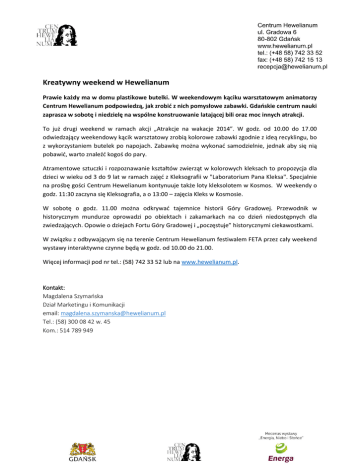 Kreatywny weekend w Hewelianum Prawie każdy ma w domu plastikowe butelki. W weekendowym kąciku warsztatowym animatorzy Centrum Hewelianum podpowiedzą, jak zrobić z nich pomysłowe zabawki. Gdańskie centrum nauki zaprasza w sobotę i niedzielę na wspólne konstruowanie latającej bili oraz moc innych atrakcji. To już drugi weekend w ramach akcji „Atrakcje na wakacje 2014”. W godz. od 10.00 do 17.00 odwiedzający weekendowy kącik warsztatowy zrobią kolorowe zabawki zgodnie z ideą recyklingu, bo z wykorzystaniem butelek po napojach. Zabawkę można wykonać samodzielnie, jednak aby się nią pobawić, warto znaleźć kogoś do pary. Atramentowe sztuczki i rozpoznawanie kształtów zwierząt w kolorowych kleksach to propozycja dla dzieci w wieku od 3 do 9 lat w ramach zajęć z Kleksografii w "Laboratorium Pana Kleksa". Specjalnie na prośbę gości Centrum Hewelianum kontynuuje także loty kleksolotem w Kosmos. W weekendy o godz. 11:30 zaczyna się Kleksografia, a o 13:00 – zajęcia Kleks w Kosmosie. W sobotę o godz. 11.00 można odkrywać tajemnice historii Góry Gradowej. Przewodnik w historycznym mundurze oprowadzi po obiektach i zakamarkach na co dzień niedostępnych dla zwiedzających. Opowie o dziejach Fortu Góry Gradowej i „poczęstuje” historycznymi ciekawostkami. W związku z odbywającym się na terenie Centrum Hewelianum festiwalem FETA przez cały weekend wystawy interaktywne czynne będą w godz. od 10.00 do 21.00. Więcej informacji pod nr tel.: (58) 742 33 52 lub na www.hewelianum.pl. Kontakt: Magdalena Szymańska Dział Marketingu i Komunikacji email: [email protected] Tel.: (58) 300 08 42 w. 45 Kom.: 514 789 949