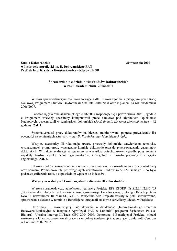 Studia Doktoranckie w Instytucie Agrofizyki im. B. Dobrzańskiego PAN Prof. dr hab. Krystyna Konstankiewicz – Kierownik SD 30 września 2007 Sprawozdanie z działalności Studiów Doktoranckich w roku akademickim 2006/2007 W roku sprawozdawczym realizowano zajęcia dla III roku zgodnie z przyjętym przez Radę Naukową Programem Studiów Doktoranckich na lata 2004-2008 oraz z planem na rok akademicki 2006/2007. Planowe zajęcia roku akademickiego 2006/2007 rozpoczęły się 4 października 2006. , zgodnie z Programem wszyscy uczestnicy kontynuowali prace naukowe pod kierunkiem Opiekunów Naukowych, uczestniczyli w seminariach doktorskich (Prof. dr hab. Krystyna Konstankiewicz) – 42 godziny, Zał. 1. Systematyczność pracy doktorantów na bieŜąco monitorowano poprzez prowadzenie list obecności na seminariach, (Starosta – mgr D. Porębska, mgr Magdalena RyŜak). Wszyscy uczestnicy III roku mają otwarte przewody doktorskie, zatwierdzoną tematykę, wyznaczonych promotorów, wyznaczone komisje doktorskie oraz do przeprowadzania egzaminów doktorskich. W trakcie realizacji są egzaminy a wszystkie dotychczasowe wypadły pozytywnie i uzyskały bardzo wysoką oceną egzaminatorów, szczególnie z filozofii przyrody i z języka angielskiego, Zał. 2. III roku studiów zakończono zaliczeniami z seminariów, sprawozdaniami z pracy naukowej oraz opiniami Promotorów dla poszczególnych uczestników Studiów za V i VI semestr. – co było podstawą zaliczenia roku, z odpowiednim wpisem do indeksów. Wszyscy uczestnicy – 14 osób, uzyskało zaliczenia III roku studiów. W roku sprawozdawczy zakończono realizację Projektu EFS ZPORR Nr Z/2.6/II/2.6/01/05 „Stypendia dla młodych naukowców szansą agrorozwoju Lubelszczyzny”, którego Beneficjentami było 11 uczestników III roku SD, Zał. 3. Wszystkie cele Projektu zostały w pełni zrealizowane, sprawozdania złoŜone w terminie a Beneficjenci otrzymali stosowne certyfikaty udziału w Projekcie. Uczestnicy III roku włączyli się aktywnie w działalność „Interregionalnego Centrum Badawczo-Edukacyjne w Instytucie Agrofizyki PAN w Lublinie”, programu Sąsiedztwa PolskaBiałoruś –Ukraina Interreg III/Tacis CBC 2004-2006. Doktoranci i Beneficjenci Projektu, młodzi naukowcy z Ukrainy, prezentowali prace na wspólnej konferencji inaugurującej działalność Centrum w Lublinie 26.02.2007. 1 Beneficjenci obydwu Projektów wspólnie uczestniczyli w cyklu wykładów przewidzianych programem Centrum oraz w kursie języka angielskiego, 05.02.2007- 06.06.2006., zakończonego odpowiednim certyfikatem. W ramach integracji obydwu grup młodych naukowców zrealizowano wyjazd na Ukrainę połączony ze zwiedzaniem Lwowa, wizytą w Stacji badawczej FizykoMechanicznego Instytutu UAN i programem kulturalnym, 1-3.06. 2007. Uczestnicy, od początku podjęcia studiów, wykazywali duŜą aktywność w zajęciach programowych SD, w pracach badawczych realizowanych w zadaniach statutowych Instytutu, projektach badawczych i programach międzynarodowych czego dowodem są publikacje oraz opracowania prezentowane jako referaty i postery na konferencjach, a takŜe prowadzili działania na rzecz promocji i upowszechniania nauki poprzez udział w masowych imprezach, inicjowali teŜ własne oryginalne przedsięwzięcia w kształceniu na poziomie szkoły podstawowej. Aktywność naukową uczestników SD w roku akademickim 2006/2007 przedstawia Zał. 4. : wydano 13 publikacji oraz 17 opracowań w materiałach konferencyjnych, 2 recenzowane monografie zawierające autorskie opracowania wszystkich uczestników SD: o Agrofizyczne metody badawcze - pod redakcją J. Grodek, K. Konstankiewicz, K.Skiba, prace doktorantów w ramach projektu: Stypendia dla młodych naukowców szansą agrorozwoju Lubelszczyzny”- EFS ZPORR, wydawca: IAPAN, Lublin 2007, pp. 103. o Człowiek a środowisko – pod redakcją J. Michalczyk, prace doktorantów nt. Agrofizyka kształtuje środowisko glebowe, w ramach projektu: „Stypendia dla młodych naukowców szansą agrorozwoju Lubelszczyzny” – EFS ZPORR, wydawca: Katolicki Uniwersytet Lubelski Jana Pawła II i Kuratorium Oświaty w Lublinie, Lublin 2007, pp. 199. zaprezentowano 33 referaty i 35 posterów na międzynarodowych i krajowych konferencjach, 10 uczestników brało udział w 22 róŜnych szkoleniach – poszerzających wiedzę, z zakresu aplikacji, zarządzania i rozliczania projektów europejskich oraz akredytacji laboratoriów badawczych, kursów języka angielskiego, uzyskując odpowiednie dyplomy i certyfikaty. 2 osoby były zaangaŜowane w prace redakcyjne przy wydawaniu monografii oraz 7 osób przy organizowaniu konferencji naukowych, takŜe 2 osoby kontynuowały prace w zakresie monitoringu i e-informacji – strony internetowe SD, ŚSD, EFS oraz Interregionalnego Centrum Badawczo-Edukacyjnego w IA PAN, 3 osoby odbyły zagraniczne staŜe naukowe, 1 – staŜ w INRA (Nantes, Francja), 1 współpraca i konsultacje z promotorem w Uniwersytecie w Edynburgu (Szkocja), 1 – staŜ w Technical Uniweristy (Berlin, Niemcy). 8 osób prowadziło konsultacje i współprace z innymi jednostkami – Uniwersytety, Instytutu, Szkoły WyŜsze, 7 osób współpracowało w 12 projektach badawczych – międzynarodowych, Ministerstwa Nauki i Szkolnictwa WyŜszego, 4 osoby wykonują Projekty Promotorskie a 7 osób przygotowało wnioski na 34 konkurs Ministerstwa Nauki i Szkolnictwa WyŜszego, Zał. 5. 5 osób uczestniczyło w opracowaniu nowych metod badawczych, 2 4 osoby uzyskały nagrody i wyróŜnienia za pracę i aktywność naukową – 2 nagrody Prezesa PAN w konkursie Mistrz popularyzacji wiedzy „Złoty umysł 2006”, 2- wyróŜnienia za prezentacje prac na konferencji International Student’s Scientific Conference, Nitra (Słowacja). 4 osoby prezentowały specjalnie przygotowane pokazy podczas Lubelskiego Festiwalu Nauki oraz Pikniku Naukowego w Warszawie. Wszyscy uczestnicy włączyli się w działalność 5 róŜnych To