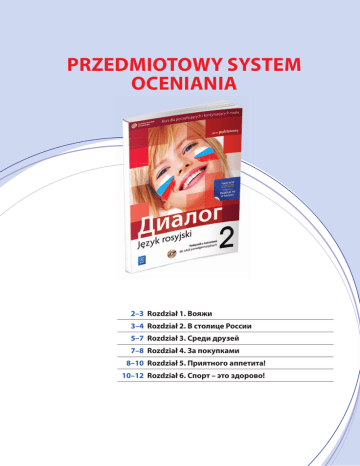 PRZEDMIOTOWY SYSTEM OCENIANIA 2–3 Rozdział 1. Вояжи 3–4 Rozdział 2. В столице России 5–7 Rozdział 3. Среди друзей 7–8 Rozdział 4. За покупками 8–10 Rozdział 5. Приятного аппетита! 10–12 Rozdział 6. Спорт – это здорово! 2 Поездка в Италию Символы и пейзажи России Прогноз погоды 1. Вояжи Вот и лето прошло! Nazwa działu • określić rodzaj swojego wypoczynku letniego i zapytać o wypoczynek rozmówcy • wyodrębnić w słuchanym tekście (z poznaną wcześniej leksyką) podstawowe informacje dotyczące wypoczynku letniego • określić główną myśl przeczytanego tekstu na temat wakacji • sformułować krótką wypowiedź na temat wypoczynku letniego, polegającą na wprowadzeniu do czytanego tekstu realiów własnych • wyodrębnić w czytanym tekście (z poznaną wcześniej leksyką) podstawowe zjawiska pogodowe • wyodrębnić w czytanym tekście (z poznaną wcześniej leksyką) podstawowe typy krajobrazów • sformułować krótką wypowiedź na temat przygotowań do wycieczki, polegającą na wprowadzeniu do czytanego tekstu realiów własnych Uczeń potrafi: Uczeń potrafi: • nazwać różne formy wypoczynku letniego • nazwać kierunki geograficzne • zrozumieć krótkie informacje dotyczące wypoczynku letniego • sformułować krótką wypowiedź na temat wypoczynku letniego (miejsce, podstawowe czynności) • nazwać pory roku i miesiące • nazwać podstawowe zjawiska pogodowe • zrozumieć krótką informację dotyczącą stanu pogody • sformułować krótką wypowiedź na temat pogody (temperatura, podstawowe zjawiska pogodowe) • nazwać najbardziej znane symbole Rosji i Polski • nazwać podstawowe typy krajobrazu • nazwać podstawowe elementy ekwipunku turysty • sformułować krótką wypowiedź na temat odbytej wycieczki (czas, miejsce, pogoda) dostateczny dopuszczający • zadawać pytania o miejsce letniego wypoczynku, pogodę i rodzaje aktywności podczas jego trwania oraz udzielać na nie odpowiedzi • wyodrębnić w czytanym tekście (z poznaną wcześniej leksyką) szczegółowe informacje na temat atrakcji turystycznych • wyselekcjonować z czytanego tekstu (z poznaną wcześniej leksyką) szczegółowe informacje na temat wycieczki • napisać krótką notatkę o swoim letnim wypoczynku; popełnia przy tym niewielkie uchybienia leksykalno-gramatyczne • wyodrębnić w słuchanym tekście (z poznaną wcześniej leksyką) zjawiska pogodowe charakterystyczne dla poszczególnych pór roku • wyselekcjonować z czytanego tekstu (z poznaną wcześniej leksyką) szczegółowe informacje na temat ekstremalnych zjawisk pogodowych Uczeń potrafi: dobry • wyodrębnić w czytanym tekście szczegółowe informacje na temat atrakcji turystycznych • odczytać tekst ze strony internetowej i wyodrębnić w nim podstawowe informacje dotyczące regionów i obiektów turystycznych • sformułować dłuższą wypowiedź na temat wypoczynku letniego; popełnia przy tym niewielkie uchybienia gramatyczne • wyodrębnić w słuchanym tekście szczegółowe informacje na temat zjawisk pogodowych charakterystycznych dla poszczególnych pór roku • wyselekcjonować z czytanego tekstu szczegółowe informacje na temat ekstremalnych zjawisk pogodowych • wyselekcjonować z czytanego tekstu szczegółowe informacje na temat typów krajobrazu • wyselekcjonować z czytanego tekstu szczegółowe informacje na temat programu Comenius Uczeń potrafi: bardzo dobry • zainicjować i prowadzić rozmowę na temat wypoczynku letniego • szczegółowo przekazać wybrane informacje dotyczące regionów i obiektów turystycznych zaczerpnięte ze strony internetowej • swobodnie wypowiedzieć się na temat przeczytanego/ wysłuchanego tekstu dotyczącego wypoczynku letniego; uwzględnia przy tym poprawność użycia struktur gramatyczno-leksykalnych • sformułować dłuższą wypowiedź na temat wypoczynku letniego poprawną pod względem leksykalnogramatycznym, wyróżniającą się płynnością, bogactwem leksykalnym i różnorodnością struktur wykraczających poza program Uczeń potrafi: celujący Opracowany przez Renatę Broniarz na podstawie podręcznika Диалог 2 autorstwa Mirosława Zyberta oraz Programu nauczania języka rosyjskiego dla uczniów szkół ponadgimnazjalnych na poziomie IV.0 i IV.1 autorstwa Mirosława Zyberta Przedmiotowy system oceniania (wymagania edukacyjne) Przedmiotowy system oceniania Культурная Москва Как попасть в центр города? 2. В столице России В Москву Nazwa działu • tworzyć wyrażenia oznaczające miejsce i kierunek z przyimkami в-из, на-с (со) • tworzyć i stosować wyrażenia z przyimkiem через dla określenia czasu i przestrzeni • wyrażać pozwolenie (можно) i zakaz (нельзя) • stosować zaimki pytające где? куда? oткуда? • wyodrębnić w słuchanym tekście (z poznaną wcześniej leksyką) podstawowe informacje dotyczące podróży pociągiem • sformułować krótką wypowiedź na temat podróży pociągiem na podstawie wypowiedzi wzorcowej • sformułować krótką wypowiedź na temat podstawowych czynności dnia codziennego, udzielić odpowiedzi na pytania o czas ich wykonywania Uczeń potrafi: Uczeń potrafi: • nazwać popularne środki transportu • nazwać podstawowe pomieszczenia dworcowe • zrozumieć krótkie informacje dotyczące podróży pociągiem (godzina odjazdu, cena biletu) • sformułować krótką wypowiedź na temat podróży pociągiem, udzielić odpowiedzi na pytania o cel podróży (miejscowość), godzinę odjazdu i cenę biletu • określić czas zegarowy (oficjalnie) dostateczny dopuszczający • określić kontekst sytuacyjny na podstawie wysłuchanych tekstów informacyjnych dotyczących podróży pociągiem • z