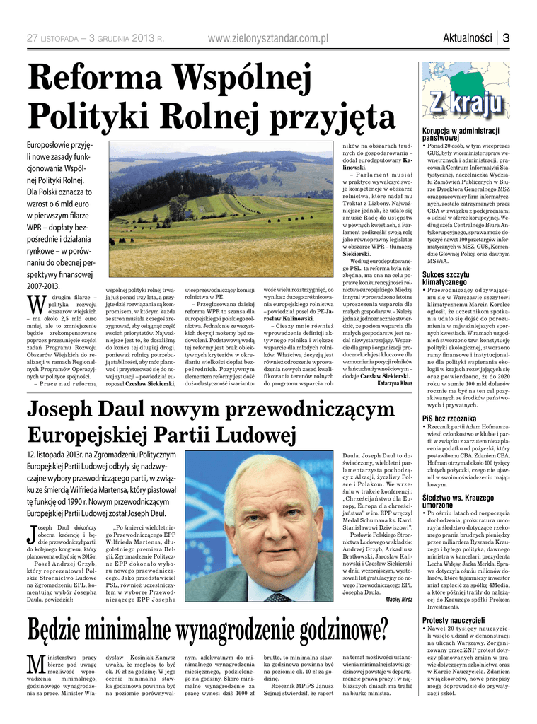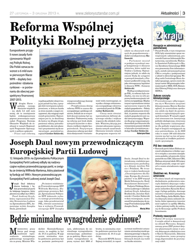 27 listopada – 3 grudnia 2013 r. Aktualności | 3 www.zielonysztandar.com.pl Reforma Wspólnej Polityki Rolnej przyjęta Europosłowie przyjęli nowe zasady funkcjonowania Wspólnej Polityki Rolnej. Dla Polski oznacza to wzrost o 6 mld euro w pierwszym filarze WPR – dopłaty bezpośrednie i działania rynkowe – w porównaniu do obecnej perspektywy finansowej 2007-2013. W drugim filarze – polityka rozwoju obszarów wiejskich – ma około 2,5 mld euro mniej, ale to zmniejszenie będzie zrekompensowane poprzez przesunięcie części zadań Programu Rozwoju Obszarów Wiejskich do realizacji w ramach Regionalnych Programów Operacyjnych w polityce spójności. – P r a c e n a d r e fo r m ą wspólnej polityki rolnej trwają już ponad trzy lata, a przyjęte dziś rozwiązania są kompromisem, w którym każda ze stron musiała z czegoś zrezygnować, aby osiągnąć część swoich priorytetów. Najważniejsze jest to, że doszliśmy do końca tej długiej drogi, ponieważ rolnicy potrzebują stabilności, aby móc planować i przystosować się do nowej sytuacji – powiedział europoseł Czesław Siekierski, wiceprzewodniczący komisji rolnictwa w PE. – Przegłosowana dzisiaj reforma WPR to szansa dla europejskiego i polskiego rolnictwa. Jednak nie ze wszystkich decyzji możemy być zadowoleni. Podstawową wadą tej reformy jest brak obiektywnych kryteriów w określaniu wielkości dopłat bezpośrednich. Pozytywnym elementem reformy jest dość duża elastyczność i warianto- wość wielu rozstrzygnięć, co wynika z dużego zróżnicowania europejskiego rolnictwa – powiedział poseł do PE Jarosław Kalinowski. – Cieszy mnie również wprowadzenie definicji aktywnego rolnika i większe wsparcie dla młodych rolników. Właściwą decyzją jest również odroczenie wprowadzenia nowych zasad kwalifikowania terenów rolnych do programu wsparcia rol- ników na obszarach trudnych do gospodarowania – dodał eurodeputowany Kalinowski. – Parlament musia ł w praktyce wywalczyć swoje kompetencje w obszarze rolnictwa, które nadał mu Traktat z Lizbony. Najważniejsze jednak, że udało się zmusić Radę do ustępstw w pewnych kwestiach, a Parlament podkreślił swoją rolę jako równoprawny legislator w obszarze WPR – tłumaczy Siekierski. Według eurodeputowanego PSL, ta reforma była niezbędna, ma ona na celu poprawę konkurencyjności rolnictwa europejskiego. Między innymi wprowadzono istotne uproszczenia wsparcia dla małych gospodarstw. – Należy jednak jednoznacznie stwierdzić, że poziom wsparcia dla małych gospodarstw jest nadal niewystarczający. Wsparcie dla grup i organizacji producenckich jest kluczowe dla wzmocnienia pozycji rolników w łańcuchu żywnościowym – dodaje Czesław Siekierski. Katarzyna Klaus Joseph Daul nowym przewodniczącym Europejskiej Partii Ludowej 12. listopada 2013r. na Zgromadzeniu Politycznym Europejskiej Partii Ludowej odbyły się nadzwyczajne wybory przewodniczącego partii, w związku ze śmiercią Wilfrieda Martensa, który piastował tę funkcję od 1990 r. Nowym przewodniczącym Europejskiej Partii Ludowej został Joseph Daul. J oseph Daul dokończy obecna kadencję i będzie przewodniczył partii do kolejnego kongresu, który planowo ma odbyć się w 2015 r. Poseł A ndrzej Grzyb, który reprezentował Polskie Stronnictwo Ludowe na Zgromadzeniu EPL, komentując wybór Josepha Daula, powiedział: Daula. Joseph Daul to doświadczony, wieloletni parlamentarzysta pochodzący z Alzacji, życzliwy Polsce i Polakom. We wrześniu w trakcie konferencji: „Chrześcijaństwo dla Europy, Europa dla chrześcijaństwa” w im. EPP wręczył Medal Schumana ks. Kard. Stanisławowi Dziwiszowi”. Posłowie Polskiego Stronnictwa Ludowego w składzie: Andrzej Grzyb, Arkadiusz Bratkowski, Jarosław Kalinowski i Czesław Siekierski w dniu wczorajszym, wystosowali list gratulacyjny do nowego Przewodniczącego EPL Josepha Daula. Maciej Mróz „Po śmierci wieloletniego Przewodniczącego EPP Wilfrieda Martensa, długoletniego premiera Belgii, Zgromadzenie Polityczne EPP dokona ło w ybo ru nowego przewodniczącego. Jako przedstawiciel PSL, również uczestniczyłem w wyborze Przewodn icz ącego E PP Jo seph a Będzie minimalne wynagrodzenie godzinowe? M inisterstwo pracy bierze pod uwagę możliwość wprowadzenia minimalnego, godzinowego wynagrodzenia za pracę. Minister Wła- dysław Kosiniak-Kamysz uważa, że mogłoby to być ok. 10 zł za godzinę. W jego ocenie minimalna stawka godzinowa powinna być na poziomie porównywal- nym, adekwatnym do minimalnego wynagrodzenia miesięcznego, podzielonego na godziny. Skoro minimalne wynagrodzenie za pracę wynosi dziś 1600 zł brutto, to minimalna stawka godzinowa powinna być na poziomie ok. 10 zł za godzinę. Rzecznik MPiPS Janusz Sejmej stwierdził, że raport na temat możliwości ustanowienia minimalnej stawki godzinowej powstaje w departamencie prawa pracy i w najbliższych dniach ma trafić na biurko ministra. Z kraju Korupcja w administracji państwowej • Ponad 20 osób, w tym wiceprezes GUS, były wiceminister spraw wewnętrznych i administracji, pracownik Centrum Informatyki Statystycznej, naczelniczka Wydziału Zamówień Publicznych w Biurze Dyrektora Generalnego MSZ oraz pracownicy firm informatycznych, zostało zatrzymanych przez CBA w związku z podejrzeniami o udział w aferze korupcyjnej. Według szefa Centralnego Biura Antykorupcyjnego, sprawa może dotyczyć nawet 100 przetargów informatycznych w MSZ, GUS, Komendzie Głównej Policji oraz dawnym MSWiA. Sukces szczytu klimatycznego • Przewodniczący odbywającemu się w Warszawie szczytowi klimatycznemu Marcin Korolec ogłosił, że uczestnikom spotkania udało się dojść do porozumienia w najważniejszych spornych kwestiach. W ramach uzgodnień stworzono tzw. konstytucję polityki ekologicznej, stworzono ramy finansowe i instytucjonalne dla polityki wspierania ekologii w krajach rozwijających się oraz potwierdzo