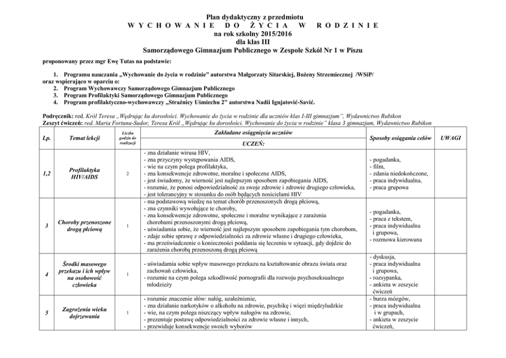 Plan dydaktyczny z przedmiotu W Y C H O W A N I E D O Ż Y C I A W R O D Z I N I E na rok szkolny 2015/2016 dla klas III Samorządowego Gimnazjum Publicznego w Zespole Szkół Nr 1 w Piszu proponowany przez mgr Ewę Tutas na podstawie: 1. Programu nauczania „Wychowanie do życia w rodzinie” autorstwa Małgorzaty Sitarskiej, Bożeny Strzemiecznej /WSiP/ oraz wspierająco w oparciu o: 2. Program Wychowawczy Samorządowego Gimnazjum Publicznego 3. Program Profilaktyki Samorządowego Gimnazjum Publicznego 4. Program profilaktyczno-wychowawczy „Strażnicy Uśmiechu 2” autorstwa Nadii Ignjatović-Savić. Podręcznik: red. Król Teresa „Wędrując ku dorosłości. Wychowanie do życia w rodzinie dla uczniów klas I-III gimnazjum”, Wydawnictwo Rubikon Zeszyt ćwiczeń: red. Maria Fortuna-Sudor, Teresa Król „Wędrując ku dorosłości. Wychowanie do życia w rodzinie” klasa 3 gimnazjum, Wydawnictwo Rubikon Lp. 1,2 Temat lekcji Profilaktyka HIV/AIDS 3 Choroby przenoszone drogą płciową 4 Środki masowego przekazu i ich wpływ na osobowość człowieka 5 Zagrożenia wieku dojrzewania Liczba godzin do realizacji 2 1 Zakładane osiągnięcia uczniów UCZEŃ: - zna działanie wirusa HIV, - zna przyczyny występowania AIDS, - wie na czym polega profilaktyka, - zna konsekwencje zdrowotne, moralne i społeczne AIDS, - jest świadomy, że wierność jest najlepszym sposobem zapobiegania AIDS, - rozumie, że ponosi odpowiedzialność za swoje zdrowie i zdrowie drugiego człowieka, - jest tolerancyjny w stosunku do osób będących nosicielami HIV - ma podstawową wiedzę na temat chorób przenoszonych drogą płciową, - zna czynniki wywołujące te choroby, - zna konsekwencje zdrowotne, społeczne i moralne wynikające z zarażenia chorobami przenoszonymi drogą płciową, - uświadamia sobie, że wierność jest najlepszym sposobem zapobiegania tym chorobom, - zdaje sobie sprawę z odpowiedzialności za zdrowie własne i drugiego człowieka, - ma przeświadczenie o konieczności poddania się leczeniu w sytuacji, gdy dojdzie do zarażenia chorobą przenoszoną drogą płciową 1 - uświadamia sobie wpływ masowego przekazu na kształtowanie obrazu świata oraz zachowań człowieka, - rozumie na czym polega szkodliwość pornografii dla rozwoju psychoseksualnego młodzieży 1 - rozumie znaczenie słów: nałóg, uzależnienie, - zna działanie narkotyków o alkoholu na zdrowie, psychikę i więzi międzyludzkie - wie, na czym polega niszczący wpływ nałogów na zdrowie, - prezentuje postawę odpowiedzialności za zdrowie własne i innych, - przewiduje konsekwencje swoich wyborów Sposoby osiągania celów - pogadanka, - film, - zdania niedokończone, - praca indywidualna, - praca grupowa - pogadanka, - praca z tekstem, - praca indywidualna i grupowa, - rozmowa kierowana - dyskusja, - praca indywidualna i grupowa, - rozsypanka, - ankieta w zeszycie ćwiczeń - burza mózgów, - praca indywidualna i w grupach, - ankieta w zeszycie ćwiczeń, UWAGI - zabawa w „2 kąty” 6 Przemoc i nadużycia seksualne 1 7 Różnice psychoseksualne między mężczyznami i kobietami 1 8 Podstawowe funkcje rodziny 1 9 Odpowiedzialne rodzicielstwo 1 10, 11 Fizjologia układu rozrodczego 12, 13 - powinien wykształcić w sobie postawy szacunku wobec ciała własnego i innych ludzi, - rozumie znaczenie intymności, - zna czynniki sprzyjające przemocy wobec młodzieży, - rozpoznaje sytuacje ryzykowne, w których może dojść do przemocy i nadużyć seksualnych, - wie, gdzie może szukać pomocy w sytuacji zagrożenia - ma świadomość istnienia różnic psychoseksualnych między mężczyznami i kobietami, - wykazuje zrozumienie i akceptację dla własnej i przeciwnej płci, - dostrzega komplementarność płci, - potrafi słuchać wypowiedzi innych i na ich podstawie wyciągać wnioski - docenia wysiłki rodziców i współdomowników w tworzeniu więzi rodzinnej, - zwróci uwagę na wspomagające role rodziców i dziadków w rozwoju osobowości młodego człowieka, - aktywnie włączy się w życie rodzinne - zna czynniki wpływające na mechanizmy kierujące rozwojem dziecka, - rozumie, że potrzeby dziecka zmieniają się w zależności od etapu życia, - rozumie, że odpowiedzialność jest integralnym elementem dojrzałości do rodzicielstwa, - nabiera przekonania o konieczności wspierania się małżonków w wychowywaniu dzieci - pogadanka, - rozmowa kierowana, - praca w grupach, - dyskusja - dyskusja, - rozmowa kierowana, - praca w grupach - pogadanka, - film, - dyskusja, - praca w grupach - wykład, - praca w grupach 1+1 - zna fizjologię układu rozrodczego, - zna okresy cyklu menstruacyjnego, - umie rozpoznać objawy owulacji - film, - praca w grupach Metody naturalnego planowania rodziny 1+1 - rozpoznaje objawy płodności, - umie obserwować własną płodność, - wyznacza dni płodne nap odstawie objawów płodności - wykład, - praca indywidualna, - ćwiczenia pod kierunkiem nauczyciela 14, 15 Metody i środki antykoncepcyjne 1+1 - zna środki antykoncepcyjne, - zna sposoby działania poszczególnych środków antykoncepcyjnych - pogadanka, - dyskusja, - praca z tekstem 16, 17 Od poczęcia do narodzin 18, 19 Od narodzin do starości 1+1 1+1 - pozna rozwój człowieka w okresie prenatalnym, - wykształci wrażliwość i szacunek dla nowego życia, - uzna potrzebę dojrzałości emocjonalno-uczuciowej i odpowiedzialności w działaniu seksualnym - potrafi refleksyjnie spojrzeć na samego siebie „wstecz”, - zrozumie, że człowiek podlega ciągłym zmianom, - potrafi przyjąć prawdę o odpowiedzialności za swój dalszy rozwój i za przyszłe potomstwo, za jego harmonijny rozwój, - ma poczucie, że jest ogniwem w łańcuch pokoleń, - zwiększy empatię w stosunku do ludzi starszego pokolenia i będzie okazywał im szacunek Na zakończenie zajęć: - potrafi dokonać analizy i podsumowania zajęć WdŻwR w szkole gimnazjalnej. - film, - pogadanka, - praca z tekstem - wykład, - film,