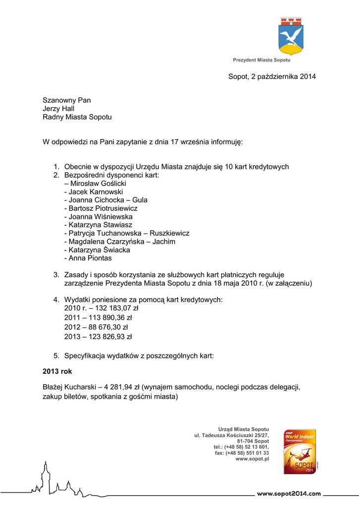 Prezydent Miasta Sopotu Sopot, 2 października 2014 Szanowny Pan Jerzy Hall Radny Miasta Sopotu W odpowiedzi na Pani zapytanie z dnia 17 września informuję: 1. Obecnie w dyspozycji Urzędu Miasta znajduje się 10 kart kredytowych 2. Bezpośredni dysponenci kart: – Mirosław Goślicki - Jacek Karnowski - Joanna Cichocka – Gula - Bartosz Piotrusiewicz - Joanna Wiśniewska - Katarzyna Stawiasz - Patrycja Tuchanowska – Ruszkiewicz - Magdalena Czarzyńska – Jachim - Katarzyna Świacka - Anna Piontas 3. Zasady i sposób korzystania ze służbowych kart płatniczych reguluje zarządzenie Prezydenta Miasta Sopotu z dnia 18 maja 2010 r. (w załączeniu) 4. Wydatki poniesione za pomocą kart kredytowych: 2010 r. – 132 183,07 zł 2011 – 113 890,36 zł 2012 – 88 676,30 zł 2013 – 123 826,93 zł 5. Specyfikacja wydatków z poszczególnych kart: 2013 rok Błażej Kucharski – 4 281,94 zł (wynajem samochodu, noclegi podczas delegacji, zakup biletów, spotkania z gośćmi miasta) Urząd Miasta Sopotu ul. Tadeusza Kościuszki 25/27, 81-704 Sopot tel.: (+48 58) 52 13 601, fax: (+48 58) 551 01 33 www.sopot.pl Prezydent Miasta Sopotu Marta Dulkiewicz – 16 864,03 zł (zakup miejskich dekoracji świątecznych na jarmark bożonarodzeniowy, noclegi podczas delegacji, zakup elementów do wyposażenia stoiska miasta na targach Bartosz Piotrusiewicz – 15 407,11 zł (opłata za parking, zakup biletów, noclegi podczas delegacji, zakup paliwa, wynajem samochodu, opłaty za autostradę, spotkania z gośćmi miasta) Mirosław Goślicki – 1 694,41 zł (zakup paliwa, spotkania z gośćmi miasta, zakup dokumentów historycznych dla miasta) Patrycja Tuchanowska – Ruszkiewicz – 3 865,63 zł (opłaty transportowe podczas delegacji do USA) Joanna Cichocka – Gula – 18 220,76 (zakup biletów, noclegi podczas delegacji, spotkania z gośćmi miasta) Joanna Wiśniewska – 9 631,88 zł (zakup paliwa, opłaty parkingowe podczas delegacji, noclegi podczas delegacji, zakup biletów, spotkania z gośćmi miasta) Magdalena Czarzyńska – Jachim – 10 038,51 (zakup biletów, noclegi podczas delegacji, zakup elementów stoiska promocyjnego na targi, spotkania z mediami) Katarzyna Stawiasz – 19 946,64 (noclegi podczas delegacji, zakup paliwa podczas delegacji, spotkania z gośćmi miasta – przedstawiciele miast partnerskich) Jacek Karnowski – 23 596,02 zł (opłata za parking, zakup biletów, noclegi podczas delegacji, zakup paliwa, wynajem samochodu, opłaty za autostradę, spotkania z gośćmi miasta) Anna Piontas – 140 zł (opłaty bankowe) Katarzyna Świacka – 140 zł (opłaty bankowe) 2014 rok (do końca sierpnia) Marta Dulkiewicz – 4 879,75 zł (zakup prezentów świątecznych dla uboższych mieszkańców) Bartosz Piotrusiewicz – 6 174,19 zł (opłata za parking, opłata za taksówkę, zakup biletów, noclegi podczas delegacji, zakup paliwa, wynajem samochodu, opłaty za autostradę, spotkania z gośćmi miasta) Urząd Miasta Sopotu ul. Tadeusza Kościuszki 25/27, 81-704 Sopot tel.: (+48 58) 52 13 601, fax: (+48 58) 551 01 33 www.sopot.pl Prezydent Miasta Sopotu Mirosław Goślicki – 14 616,79 zł (zakup paliwa, spotkania z gośćmi miasta, noclegi podczas delegacji, zakup nagród rzeczowych, zakup elementów do samochodu służbowego, opłata za domenę internetową) Patrycja Tuchanowska – Ruszkiewicz – 7 303,18 zł (zakup biletów, noclegi podczas delegacji, zakup oprogramowania komputerowego, spotkania z gośćmi miasta, trasport taxi, zakup elementów wyposażenia stoiska na targi promocyjne) Joanna Cichocka – Gula – 7 623,91 (zakup biletów, noclegi podczas delegacji, transport taxi, spotkania z gośćmi miasta) Joanna Wiśniewska – 9 653,92 zł (noclegi podczas delegacji, zakup biletów) Magdalena Czarzyńska – Jachim – 1 123,80 (transport taxi, zakup zdjęć z banku fotografii, spotkania z mediami oraz gośćmi miasta) Katarzyna Stawiasz – 14 268,94 (noclegi podczas delegacji, spotkania z gośćmi miasta – przedstawiciele miast partnerskich oraz study toury, zakup materiałów podczas promocji w Karlskronie) Jacek Karnowski – 8 614,03 zł (opłata za parking, zakup biletów, noclegi podczas delegacji, zakup paliwa, wynajem samochodu, opłaty za autostradę, spotkania z gośćmi miasta) Anna Piontas – 140 zł (opłaty bankowe) Z wyrazami szacunku Urząd Miasta Sopotu ul. Tadeusza Kościuszki 25/27, 81-704 Sopot tel.: (+48 58) 52 13 601, fax: (+48 58) 551 01 33 www.sopot.pl