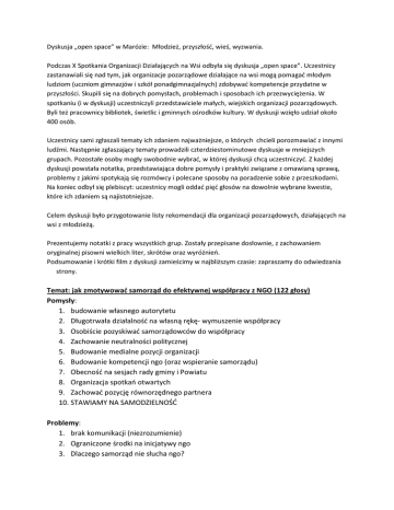 Dyskusja „open space” w Marózie: Młodzież, przyszłość, wieś, wyzwania. Podczas X Spotkania Organizacji Działających na Wsi odbyła się dyskusja „open space”. Uczestnicy zastanawiali się nad tym, jak organizacje pozarządowe działające na wsi mogą pomagać młodym ludziom (uczniom gimnazjów i szkół ponadgimnazjalnych) zdobywać kompetencje przydatne w przyszłości. Skupili się na dobrych pomysłach, problemach i sposobach ich przezwyciężenia. W spotkaniu (i w dyskusji) uczestniczyli przedstawiciele małych, wiejskich organizacji pozarządowych. Byli też pracownicy bibliotek, świetlic i gminnych ośrodków kultury. W dyskusji wzięło udział około 400 osób. Uczestnicy sami zgłaszali tematy ich zdaniem najważniejsze, o których chcieli porozmawiać z innymi ludźmi. Następnie zgłaszający tematy prowadzili czterdziestominutowe dyskusje w mniejszych grupach. Pozostałe osoby mogły swobodnie wybrać, w której dyskusji chcą uczestniczyć. Z każdej dyskusji powstała notatka, przedstawiająca dobre pomysły i praktyki związane z omawianą sprawą, problemy z jakimi spotykają się rozmówcy i polecane sposoby na poradzenie sobie z przeszkodami. Na koniec odbył się plebiscyt: uczestnicy mogli oddać pięć głosów na dowolnie wybrane kwestie, które ich zdaniem są najistotniejsze. Celem dyskusji było przygotowanie listy rekomendacji dla organizacji pozarządowych, działających na wsi z młodzieżą. Prezentujemy notatki z pracy wszystkich grup. Zostały przepisane dosłownie, z zachowaniem oryginalnej pisowni wielkich liter, skrótów oraz wyróżnień. Podsumowanie i krótki film z dyskusji zamieścimy w najbliższym czasie: zapraszamy do odwiedzania strony. Temat: jak zmotywować samorząd do efektywnej współpracy z NGO (122 głosy) Pomysły: 1. budowanie własnego autorytetu 2. Długotrwała działalność na własną rękę- wymuszenie współpracy 3. Osobiście pozyskiwać samorządowców do współpracy 4. Zachowanie neutralności politycznej 5. Budowanie medialne pozycji organizacji 6. Budowanie kompetencji ngo (oraz wspieranie samorządu) 7. Obecność na sesjach rady gminy i Powiatu 8. Organizacja spotkań otwartych 9. Zachować pozycję równorzędnego partnera 10. STAWIAMY NA SAMODZIELNOŚĆ Problemy: 1. brak komunikacji (niezrozumienie) 2. Ograniczone środki na inicjatywy ngo 3. Dlaczego samorząd nie słucha ngo? 4. Brak długofalowej wizji ze strony samorządu 5. Samorządy traktują ngo jako zagrożenie (brak partnerstwa) 6. Ngo musi sobie radzić samemu 7. Niezdrowa preferencja 8. Brak zdefiniowania wspólnego dobra 9. Podział na miasto i gminę 10. Postrzeganie działalności ngo jako sposobu na zarobek Sposoby na problemy: 1. Pozyskiwanie samorządowców poprzez dobre praktyki 2. Formalizacja problemów 3. Czyny głośniejsze niż słowa 4. Konsekwencja w działaniu 5. Zapraszanie władz lokalnych na swoje imprezy, inicjatywy 6. Oczekiwania realne od samorządowców 7. Sponsoring 8. Lobbing 9. Budowanie struktur i siły stowarzyszenia Temat: Współpraca z samorządem (min. inicjatywa lokalna) (97 głosów) Pomysły: 1. Wspólne imprezy, 2. Delegowanie – dzielenie zysków, korzyści na wszystkich 3. Regranting (stow. Do UG i przekazują sołectwom) 4. Udział w dużych programach edukacyjnych np. „Decydujemy razem”, „Daj głos mieszkańcom”, 5. DIALOG!, 6. Spotkania otwarte 7. Przyjrzenie się statutom i jakości P.Współ. 8. Inicjatywy własne społeczności – wtedy samorząd dodaje 9. Dwukadencyjność? 10. Mówić!! 11. Nauczyć się mówić samorządowcom o potrzebach wsi: to nasza potrzeba, a nie Wójta, 12. Utworzyć płaszczyznę wymiany 13. Młodzieżowa Rada przy Gminie 14. R.D.P.P. ze świadomymi ludźmi 15. EDUKOWAĆ WSZYSTKICH Problemy: 1. Zero samorządowych pieniędzy, 2. Brak szkoleń dla sołtysów, 3. Brak przygotowania urzędników odnośnie FS 4. Nie potrafimy powiedzieć, co chcemy dla samorządu, 5. 6. 7. 8. 9. 10. 11. LGD – procedura(!!!) Postrzeganie Upolitycznienie samorządu, Przepływ informacji, „Zawłaszczanie sukcesów NGO przed samorząd”, Radni nie przychodzą na spotkania NGO, albo przychodzą ludzie, którzy nie chcą tam być Dojazd dzieci po gimnazjum [na sesje rad młodzieżowych?] – brak wsparcia i rozwiązań logistycznych, nie do końca wiemy, po co Młodzieżowe Rady, nieczytanie dokumentacji przez radnych. Sposoby na problemy: 1. ANR ma możliwość przekazania grantu na działania społeczne, 2. LOG, 3. „Przedstawić się” dla samorządu i bezkosztowo współpracować 4. Odpis sołecki? 5. Robić samemu, zadbać o „dobro” naszych wsi, 6. Wynegocjować cokolwiek np.: sprzęt, rzeczy. 7. Wójt ma prawo opiekować się dziećmi ponadgimnazjalnymi - gimbusy 8. KONKRETY, a nie tylko dyskusja, 9. Szkolenia dla radnych i sołtysów – wspólne!!! 10. Urząd Marszałkowski może przeprowadzić szkolenie nieodpłatnie dla Radnych i innych Temat: Metody animowania młodzieży wiejskiej (104 głosy) Pomysły 1. Zachęcanie przez działanie 2. Kontakt na zasadzie partnerstwa 3. Wykorzystanie lokalnych zasobów 4. Wolontariat młodzieżowy Problemy: 1. Problem pierwszego kontaktu między animatorami a młodzieżą 2. Poszukiwanie tematu, który zainteresuje młodych. Sposoby na problemy: 1. Kontakt z liderem 2. Większa liczba spotkań, paneli dyskusyjnych i warsztatów 3. Kontakt z młodzieżą nam najbliższą Temat: Jak budować autorytet? (Autorytet buduje się latami!!!) (73 głosy) Pomysły: 1. Nie obiecuj za dużo 2. Zawsze dotrzymuj danego słowa 3. Nie! Dla robienia tego cudzym kosztem 4. Autorytet grupowy (Koło Gospodyń Wiejskich, nieformalne grupy) Problemy: 1. Niezależnie od wieku odbiorcy autorytet to ciężki orzech do zgryzienia 2. Ciężko wyszukać autorytety na wsi (zawiść, zazdrość) 3. Rodzice a autorytet zewnętrzny Sposoby na problemy: 1. Budowa zaufania – małymi kroczkami 2. Nie rezygnować mimo przeciwieństw 3. Działanie własnym pr