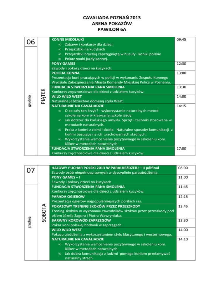 CAVALIADA POZNAŃ 2013 ARENA POKAZÓW PAWILON 6A PIĄTEK grudnia 06 SOBOTA grudnia 07 KONNE MIKOŁAJKI • Zabawy i konkursy dla dzieci. • Przejażdżki na kucykach • Przejażdżki bryczką zaprzęgniętą w hucuły i koniki polskie • Pokaz nauki jazdy konnej. PONY GAMES Zawody i pokazy dzieci na kucykach. POLICJA KONNA Prezentacja koni pracujących w policji w wykonaniu Zespołu Konnego Wydziału Zabezpieczenia Miasta Komendy Miejskiej Policji w Poznaniu. FUNDACJA STWORZENIA PANA SMOLENIA Konkursy zręcznościowe dla dzieci z udziałem kucyków. WILD WILD WEST Naturalne jeździectwo domeną stylu West. NATURALNIE NA CAVALIADZIE • O co cały ten krzyk? - wykorzystanie naturalnych metod szkolenia koni w klasycznej szkole jazdy. • Jak dotrzeć do końskiego umysłu. Sprzęt i techniki stosowane w metodach naturalnych. • Praca z końmi z ziemi i siodła. Naturalne sposoby komunikacji z końmi bazujące na ich zrachowaniach stadnych. • Wykorzystanie wzmocnienia pozytywnego w szkoleniu koni. Kliker w metodach naturalnych. FUNDACJA STWORZENIA PANA SMOLENIA Konkursy zręcznościowe dla dzieci z udziałem kucyków. HALOWY PUCHAR POLSKI 2013 W PARAUJEŻDZEIU – II półfinał Zawody osób niepełnosprawnych w dyscyplinie paraujeżdżenia. PONY GAMES – I Zawody i pokazy dzieci na kucykach. FUNDACJA STWORZENIA PANA SMOLENIA Konkursy zręcznościowe dla dzieci z udziałem kucyków. PARADA OGIERÓW Prezentacja ogierów najpopularniejszych polskich ras. POKAZOWY TRENING SKOKÓW PRZEZ PRZESZKODY Trening skoków w wykonaniu zawodników skoków przez przeszkody pod okiem Józefa Zagora i Piotra Wawryniuka. BARWNY KOROWÓD ZAPRZĘGÓW Pokaz koni polskiej hodowli w zaprzęgach. WILD WILD WEST Pokazu ujeżdżenia z wykorzystaniem stylu klasycznego i westernowego. NATURALNIE NA CAVALIADZIE • Wykorzystanie wzmocnienia pozytywnego w szkoleniu koni. Kliker w metodach naturalnych. • Jak dobra komunikacja z ludźmi pomaga koniom przełamywać naturalny strach. 09:45 12:30 13:00 13:30 14:00 14:15 17:00 08:00 11:00 11:45 12:15 12:45 13:30 14:00 14:10 • Jak dotrzeć do końskiego umysłu. Sprzęt i techniki stosowane w metodach naturalnych. POKAZ MODY JEŹDZIECKIEJ Pokaz ubrań firmy Pikeur zaprezentowany przez zawodników startujących na Cavaliadzie. WKKW – DOMENA POLSKICH KONI Pokaz Wszechstronnego Konkursu Konia Wierzchowego – najtrudniejszej dyscypliny jeździeckiej. PONY GAMES – II Zawody i pokazy dzieci na kucykach. POLSKIE ARABY – NASZE OKNO NA ŚWIAT Pokaz koni czystej krwi arabskiej ze słynnych Stadnin Koni. FUNDACJA STWORZENIA PANA SMOLENIA - ZORRO Przedstawienie z udziałem osób niepełnosprawnych z FSPS. AGILITY Wyścigi równoległe psów i pokaz szkolenia psów. NIEDZIELA grudnia 08 HALOWY PUCHAR POLSKI 2013 W PARAUJEŻDZENIU – finał Zawody osób niepełnosprawnych w dyscyplinie paraujeżdżenia PONY GAMES I Zawody i pokazy dzieci na kucykach. POLSKIE ARABY – NASZE OKNO NA ŚWIAT Pokaz koni czystej krwi arabskiej ze słynnych Stadnin Koni. FUNDACJA STWORZENIA PANA SMOLENIA - ZORRO Przedstawienie z udziałem osób niepełnosprawnych z FSPS. POKAZ MODY JEŹDZIECKIEJ Pokaz ubrań firmy Pikeur zaprezentowany przez zawodników startujących na Cavaliadzie. POKAZOWY TRENING SKOKÓW PRZEZ PRZESZKODY Trening skoków w wykonaniu zawodników skoków przez przeszkody pod okiem Józefa Zagora i Piotra Wawryniuka. BARWNY KOROWÓD ZAPRZĘGÓW Pokaz koni polskiej hodowli w zaprzęgach. WILD WILD WEST Pokazu ujeżdżenia z wykorzystaniem stylu klasycznego i westernowego. PARADA OGIERÓW Prezentacja ogierów najpopularniejszych polskich ras. FUNDACJA STWORZENIA PANA SMOLENIA Konkursy zręcznościowe dla dzieci z udziałem kucyków. PONY GAMES II Zawody i pokazy dzieci na kucykach. AGILITY Wyścigi równegłe psów i pokaz szkolenia psów. 16:00 16:15 16:45 17:30 17:45 18:15 07:00 10:00 10:45 11:00 11:30 11:45 12:15 13:00 13:15 14:00 14:45 15:30