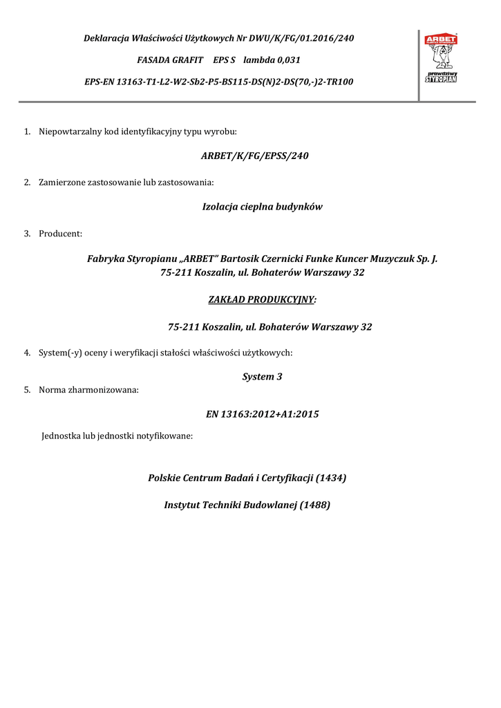 Deklaracja Właściwości Użytkowych Nr DWU/K/FG/01.2016/240 FASADA GRAFIT EPS S lambda 0,031 EPS-EN 13163-T1-L2-W2-Sb2-P5-BS115-DS(N)2-DS(70,-)2-TR100 1. Niepowtarzalny kod identyfikacyjny typu wyrobu: ARBET/K/FG/EPSS/240 2. Zamierzone zastosowanie lub zastosowania: Izolacja cieplna budynków 3. Producent: Fabryka Styropianu „ARBET” Bartosik Czernicki Funke Kuncer Muzyczuk Sp. J. 75-211 Koszalin, ul. Bohaterów Warszawy 32 ZAKŁAD PRODUKCYJNY: 75-211 Koszalin, ul. Bohaterów Warszawy 32 4. System(-y) oceny i weryfikacji stałości właściwości użytkowych: System 3 5. Norma zharmonizowana: EN 13163:2012+A1:2015 Jednostka lub jednostki notyfikowane: Polskie Centrum Badań i Certyfikacji (1434) Instytut Techniki Budowlanej (1488) Deklaracja Właściwości Użytkowych Nr DWU/K/FG/01.2016/240 FASADA GRAFIT EPS S lambda 0,031 EPS-EN 13163-T1-L2-W2-Sb2-P5-BS115-DS(N)2-DS(70,-)2-TR100 6. Deklarowane właściwości użytkowe: Opór cieplny Właściwości użytkowe Opór cieplny i współczynnik przewodzenia ciepła Grubość Reakcja na ogień Trwałość reakcji na ogień w funkcji ciepła, warunków atmosferycznych, starzenia/degradacji Trwałość oporu cieplnego w funkcji ciepła, warunków atmosferycznych , starzenia/degradacji Reakcja na ogień Trwałość właściwości b) Opór cieplny i współczynnik przewodzenia ciepła c) Deklarowana klasa/poziom /NPD a) RD = 7,70 m2K/W D = 0,031 W/mK T1 dN = 240 mm E Zharmonizowana specyfikacja techniczna E RD = 7,70 m2K/W D = 0,031 W/mK NPD EN 13163:2012+A1:2015 Zasadnicze charakterystyki Trwałość właściwości Naprężenie ściskające przy 10 % Wytrzymałość na ściskanie NPD odkształceniu Wytrzymałość na zginanie BS115 Wytrzymałość na rozciąganie/zginanie Wytrzymałość na rozciąganie TR100 prostopadle do powierzchni czołowych Pełzanie przy ściskaniu NPD Trwałość wytrzymałości na ściskanie w funkcji Odporność na zamrażanieNPD starzenia i degradacji odmrażanie Długotrwała redukcja grubości NPD Nasiąkliwość wodą przy NPD długotrwałym zanurzeniu Przepuszczalność wody Absorpcja wody przy długotrwałej NPD dyfuzji Przepuszczalność pary wodnej Przenikanie pary wodnej NPD Sztywność dynamiczna NPD Wskaźnik izolacyjności od dźwięków uderzeniowych Grubość, dL NPD (dla podłóg) Ściśliwość NPD d) Ciągłe spalanie w postaci żarzenia Ciągłe spalanie w postaci żarzenia Uwalnianie się substancji niebezpiecznych do Uwalnianie się substancji środowiska wewnętrznego niebezpiecznych d) a) NPD – właściwości użytkowe nieustalone; b) właściwości ogniowe EPS nie zmieniają się w czasie; c) współczynnik przewodzenia ciepła nie zmienia się w czasie; d) europejskie metody badań są w trakcie opracowania Właściwości użytkowe określonego wyżej wyrobu są zgodne z zestawem deklarowanych właściwości użytkowych. Niniejsza deklaracja właściwości użytkowych wydana zostaje zgodnie z rozporządzeniem (UE) nr 305/2011 na wyłączną odpowiedzialność producenta określonego powyżej. W imieniu producenta podpisał(-a): w Koszalinie dnia 02.01.2016 r.