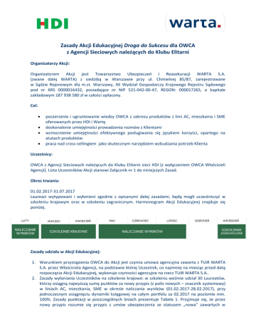 Zasady Akcji Edukacyjnej Droga do Sukcesu dla OWCA z Agencji Sieciowych należących do Klubu Elitarni Organizatorzy Akcji: Organizatorem Akcji jest Towarzystwo Ubezpieczeń i Reasekuracji WARTA S.A. (zwane dalej WARTA) z siedzibą w Warszawie przy ul. Chmielnej 85/87, zarejestrowane w Sądzie Rejonowym dla m.st. Warszawy, XII Wydział Gospodarczy Krajowego Rejestru Sądowego pod nr KRS 0000016432, posiadające nr NIP 521-042-00-47, REGON: 000017265, o kapitale zakładowym 187 938 580 zł w całości opłacony. Cel: poszerzenie i ugruntowanie wiedzy OWCA z zakresu produktów z linii AC, mieszkania i SME oferowanych przez HDI i Wartę doskonalenie umiejętności prowadzenia rozmów z Klientami wzmocnienie umiejętności efektywnego posługiwania się językiem korzyści, opartego na atutach produktów praca nad cross-sellingiem jako skutecznym narzędziem wzbudzania potrzeb Klienta Uczestnicy: OWCA z Agencji Sieciowych należących do Klubu Elitarni sieci HDI (z wyłączeniem OWCA Właścicieli Agencji). Lista Uczestników Akcji stanowi Załącznik nr 1 do niniejszych Zasad. Okres trwania: 01.02.2017-31.07.2017 Laureaci wytypowani i wyłonieni zgodnie z opisanymi dalej zasadami, będą mogli uczestniczyć w szkoleniu krajowym oraz w szkoleniu zagranicznym. Harmonogram Akcji Edukacyjnej znajduje się poniżej. Zasady udziału w Akcji Edukacyjnej: 1. Warunkiem przystąpienia OWCA do Akcji jest czynna umowa agencyjna zawarta z TUiR WARTA S.A. przez Właściciela Agencji, na podstawie której Uczestnik, co najmniej na miesiąc przed datą rozpoczęcia Akcji Edukacyjnej, wykonuje czynności agencyjne na rzecz TUiR WARTA S.A.. 2. Zasady wyłaniania Uczestników na szkolenie krajowe: w szkoleniu weźmie udział 30 Laureatów, którzy osiągną najwyższą sumę punktów za nowy przypis (z polis nowych – znacznik systemowy) w liniach AC, mieszkania, SME w okresie naliczania wyników (01.02.2017-28.02.2017), przy jednoczesnym osiągnięciu dynamiki księgowej na całym portfelu za 02.2017 na poziomie min. 100%. Zasady punktacji w poszczególnych liniach prezentuje Tabela 1. Przyjmuje się, że przez nowy przypis rozumie się przypis z umów ubezpieczenia ze statusem „nowa” zawartych w okresie naliczania wyników. Na podstawie wyników uzyskanych przez Uczestników utworzony zostanie Ranking 1. Tabela 1. Linia produktowa Punkty za 100 zł nowego przypisu AC 1 Mieszkania 3 SME 2 3. Warunkiem uczestnictwa Laureata w szkoleniu krajowym jest podpisanie przez Właściciela/Reprezentanta Agencji Oświadczenia o zapłacie kosztu szkolenia stanowiącego Załącznik nr 2 do niniejszych Zasad. W przypadku gdy Właściciel Agencji nie podpisze wskazanego Oświadczenia (informacja przesłana drogą elektroniczną przez odpowiedniego Regionalnego Menadżera Sprzedaży w ciągu 7 dni od ogłoszenia Laureatów), miejsce Laureata zajmuje kolejny Laureat z Rankingu 1. 4. Ogłoszenie Laureatów, którzy będą mogli uczestniczyć w szkoleniu krajowym nastąpi do dnia 25.03.2017 drogą elektroniczną. 5. Zasady wyłaniania Uczestników na szkolenie zagraniczne: w szkoleniu weźmie udział 5 Laureatów ujętych w Rankingu 2, którzy osiągną najlepszy wynik pod względem największej liczby nowych umów ubezpieczenia (polisy nowe – znacznik systemowy) w liniach AC, mieszkania, SME zawartych w okresie naliczania wyników (01.05.2017-31.07.2017), o składce minimalnej w wysokości jak w Tabeli 2. Tabela 2. Linia produktowa Składka minimalna (zł) AC 200 Mieszkania 100 SME 200 6. Warunkiem uczestnictwa w szkoleniu zagranicznym jest udział w szkoleniu krajowym. W przypadku gdy Laureat zrezygnuje z uczestnictwa w szkoleniu zagranicznym (informacja przesłana drogą elektroniczną przez odpowiedniego Regionalnego Menadżera Sprzedaży w ciągu 7 dni od ogłoszenia Laureatów), jego miejsce zajmuje kolejny Laureat z Rankingu 2. 7. Ogłoszenie Laureatów, którzy będą mogli uczestniczyć w szkoleniu zagranicznym nastąpi do dnia 25.08.2017 drogą elektroniczną. 8. TUiR Warta S.A. jako administrator danych osobowych informuje, że będą one przetwarzane w zakresie i celu niezbędnym do realizacji Akcji Edukacyjnej. Podanie danych (tj. uczestnictwo w Akcji) jest dobrowolne. Uczestnikowi Akcji przysługuje prawo dostępu do treści danych oraz prawo ich poprawiania. Dane Laureatów Akcji niezbędne do realizacji nagrody zostaną udostępnione organizatorowi wyjazdu, którego dane zostaną udostępnione w późniejszym czasie.