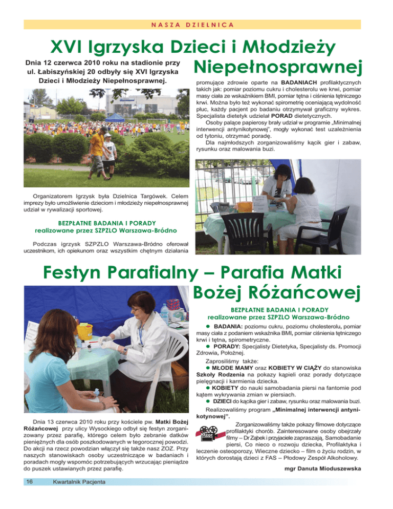 NASZA DZIELNICA XVI Igrzyska Dzieci i Młodzieży Niepełnosprawnej Dnia 12 czerwca 2010 roku na stadionie przy ul. Łabiszyńskiej 20 odbyły się XVI Igrzyska Dzieci i Młodzieży Niepełnosprawnej. promujące zdrowie oparte na BADANIACH profilaktycznych takich jak: pomiar poziomu cukru i cholesterolu we krwi, pomiar masy ciała ze wskaźnikiem BMI, pomiar tętna i ciśnienia tętniczego krwi. Można było też wykonać spirometrię oceniającą wydolność płuc, każdy pacjent po badaniu otrzymywał graficzny wykres. Specjalista dietetyk udzielał PORAD dietetycznych. Osoby palące papierosy brały udział w programie „Minimalnej interwencji antynikotynowej”, mogły wykonać test uzależnienia od tytoniu, otrzymać poradę. Dla najmłodszych zorganizowaliśmy kącik gier i zabaw, rysunku oraz malowania buzi. Organizatorem Igrzysk była Dzielnica Targówek. Celem imprezy było umożliwienie dzieciom i młodzieży niepełnosprawnej udział w rywalizacji sportowej. BEZPŁATNE BADANIA I PORADY realizowane przez SZPZLO Warszawa-Bródno Podczas igrzysk SZPZLO Warszawa-Bródno oferował uczestnikom, ich opiekunom oraz wszystkim chętnym działania Festyn Parafialny – Parafia Matki Bożej Różańcowej BEZPŁATNE BADANIA I PORADY realizowane przez SZPZLO Warszawa-Bródno BADANIA: poziomu cukru, poziomu cholesterolu, pomiar masy ciała z podaniem wskaźnika BMI, pomiar ciśnienia tętniczego krwi i tętna, spirometryczne. PORADY: Specjalisty Dietetyka, Specjalisty ds. Promocji Zdrowia, Położnej. Zaprosiliśmy także: MŁODE MAMY oraz KOBIETY W CIĄŻY do stanowiska Szkoły Rodzenia na pokazy kąpieli oraz porady dotyczące pielęgnacji i karmienia dziecka. KOBIETY do nauki samobadania piersi na fantomie pod kątem wykrywania zmian w piersiach. DZIECI do kącika gier i zabaw, rysunku oraz malowania buzi. Realizowaliśmy program „Minimalnej interwencji antynikotynowej”. Dnia 13 czerwca 2010 roku przy kościele pw. Matki Bożej Różańcowej przy ulicy Wysockiego odbył się festyn zorganizowany przez parafię, którego celem było zebranie datków pieniężnych dla osób poszkodowanych w tegorocznej powodzi. Do akcji na rzecz powodzian włączył się także nasz ZOZ. Przy naszych stanowiskach osoby uczestniczące w badaniach i poradach mogły wspomóc potrzebujących wrzucając pieniądze do puszek ustawianych przez parafię. 16 Kwartalnik Pacjenta Zorganizowaliśmy także pokazy filmowe dotyczące profilaktyki chorób. Zainteresowane osoby obejrzały filmy – Dr Ząbek i przyjaciele zapraszają, Samobadanie piersi, Co nieco o rozwoju dziecka, Profilaktyka i leczenie osteoporozy, Wieczne dziecko – film o życiu rodzin, w których dorostają dzieci z FAS – Płodowy Zespół Alkoholowy. mgr Danuta Mioduszewska