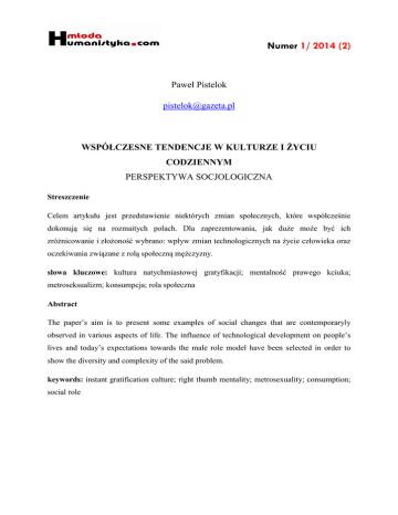 Numer 1/ 2014 (2) Paweł Pistelok [email protected] WSPÓŁCZESNE TENDENCJE W KULTURZE I ŻYCIU CODZIENNYM PERSPEKTYWA SOCJOLOGICZNA Streszczenie Celem artykułu jest przedstawienie niektórych zmian społecznych, które współcześnie dokonują się na rozmaitych polach. Dla zaprezentowania, jak duże może być ich zróżnicowanie i złożoność wybrano: wpływ zmian technologicznych na życie człowieka oraz oczekiwania związane z rolą społeczną mężczyzny. słowa kluczowe: kultura natychmiastowej gratyfikacji; mentalność prawego kciuka; metroseksualizm; konsumpcja; rola społeczna Abstract The paper’s aim is to present some examples of social changes that are contemporaryly observed in various aspects of life. The influence of technological development on people’s lives and today’s expectations towards the male role model have been selected in order to show the diversity and complexity of the said problem. keywords: instant gratification culture; right thumb mentality; metrosexuality; consumption; social role WSPÓŁCZESNE TENDENCJE W KULTURZE I ŻYCIU CODZIENNYM WSTĘP. Uwarunkowania zmian Trywialnie brzmi już powiedzenie, że świat wokół nas się zmienia. Zmienia się nie tylko morfologicznie i technologicznie, w miarę jak kolejne zdobycze techniki kształtują i przeobrażają przestrzeń wokół nas, ale zmienia się też struktura motywów i wartości, które kierują naszymi aspiracjami i dążeniami – co zresztą w pewnym stopniu odbija się w technologiach, jakimi się posługujemy. Stwierdzenie to zakłada wzajemne warunkowanie się zjawisk, co jest konstytuujące dla zachowań społecznych i kulturowych. Chcemy zaproponować namysł nad dwoma wymiarami naszego życia, które pozornie nie mają wspólnego mianownika, ale są w swej zmienności warunkowane przez wspólną grupę procesów. Te sfery to praca i technologia, ujmowane w kategoriach rentowności i natychmiastowości oraz emancypacja konsumpcyjna, którą postaramy się zaproponować jako odpowiedź wobec konstruowania i redefiniowania wyobrażeń dotyczących płci. Obie te sfery można rozpatrywać w perspektywie czterech procesów (ujmowanych zazwyczaj w pejoratywnym sensie, co nie zawsze jest zasadne): makdonaldyzacji, sekularyzacji, konsumpcjonizmu (konsumeryzmu) i tabloidyzacji. Każdy z nich można odnieść do innego wymiaru ludzkiego bytowania, ale trzeba pamiętać, że w pewnym stopniu przenikają się wzajemnie. Makdonaldyzacja (Ritzer: 1997) wiąże się z Weberowską koncepcją „żelaznej klatki” (za: ibidiem), która symbolizuje ugrzęźnięcie w zasadach wymuszających efektywność, racjonalność i kalkulacyjność. W bezpośredniej analogii oznacza przenoszenie zasad działania barów szybkiej obsługi na inne dziedziny życia społecznego i jednostkowego. Pojęcie sięga korzeniami do epoki fordyzmu, gdzie przyjęty był ujednolicony model produkcji – zarówno po stronie nakładów jak i efektów. Dziś takie zasady spotykamy nie tylko w produkcji technologii i żywności, ale także w przemyśle odzieżowym, gdzie sklepy sieciowe oferują, w podobnie zaprojektowanych butikach, identyczny zazwyczaj asortyment. Gwarantuje to przewidywalność, tutaj w sensie pozytywnym, bo klient wie co znajdzie w sklepie określonej sieci. Kolejne cechy to sprawność, rozumiana jako efektywność, a będąca ilościową miarą załatwianych spraw oraz sterowanie, które wyraża się na przykład w scenariuszach podejścia do klienta i odgórnie narzuconych zasadach układu towarów na terenie sklepu. Niektóre z wymienionych cech przenikają do jeszcze nie tak dawno niedostępnej dla wszelkich zmian sfery, jaką jest życie religijne. W społeczeństwie o 2 WSPÓŁCZESNE TENDENCJE W KULTURZE I ŻYCIU CODZIENNYM rosnącym pierwiastku informatyzacji pojawiają się pomysły na spowiedź przez internet czy aplikacje na smartfona zawierające w sobie cały brewiarz. Skoro jesteśmy przy sferze sacrum, to można tutaj mówić o postępującej laicyzacji, już nawet nie w zachodnim, ale również w polskim społeczeństwie. Coraz wyraźniej słyszane są opinie środowisk sceptycznie odnoszących się do obecności w życiu publicznym Kościoła Katolickiego, zasadności jego założeń doktrynalnych i sposobów ich komunikowania. Sympotmatyczne jest, że po wyborach w 2011 roku w polskim parlamencie znalazła się partia, której program jest otwarcie antyklerykalny. Hasła, na jakich wcześniej nie weszło do parlamentu żadne ugrupowanie, każą zauważyć istotną zmianę – rosnącą grupę obywateli, a więc i wyborców, którzy kontestują tradycyjne wartości i popierają m. in. związki homoseksualne, liberalizację prawa kobiet do aborcji, in vitro czy też usunięcie symboli religijnych ze sfery publicznej. Są to kwestie, które w naszym społeczeństwie są najbardziej delikatne i jako takie zapewne długo jeszcze nie znajdą rozstrzygnięcia. Wynikają bowiem z konfliktu pomiędzy światopoglądową emancypacją jednostek i grup, a wartościami tradycyjnymi, które jeszcze nigdy nie były tak szeroko podważane. Obecnie daje się zauważyć zupełne nieprzygotowanie aktorów życia publicznego do tego rodzaju debaty. Kolejnym zjawiskiem współczesności, choć o długiej historii, jest konsumpcjonizm, który Krystyna Romaniszyn ujmuje w ten sposób: Konsumpcjonizm to, po stronie systemu, (…) utowarowienie wszystkiego, co się da, i po stronie konsumenta, rozkręcona spirala nigdy niekończących się pragnień, powodująca zaabsorbowanie nabywaniem i konsumpcją wciąż nowych towarów i usług (Romaniszyn 2011: 34) To chyba najbardziej zwięzły sposób opisania prawidłowości, która w dużym stopniu kształtuje nasze dzisiejsze podejście – zarówno pod względem ekonomicznym jak i kulturowym. Bazą światopoglądu konsumpcyjnego jest bowiem kultura masowa, której wytwory są bardziej produktami, niż tekstami kultury. Charakteryzują się zdolnością do reproduko