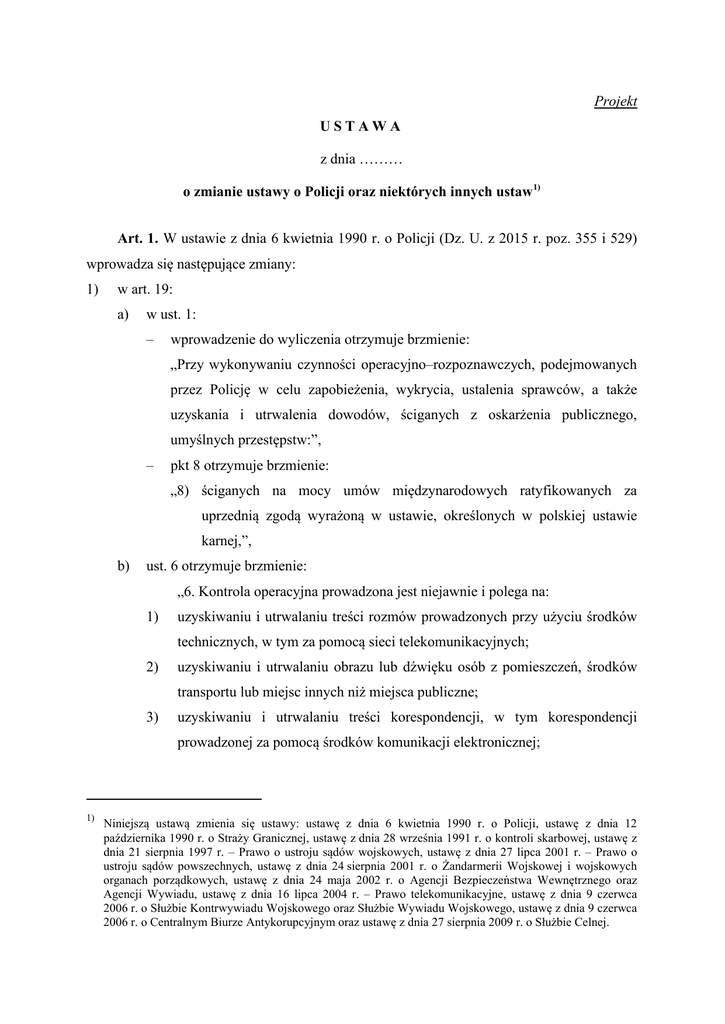 Projekt USTAWA z dnia ……… o zmianie ustawy o Policji oraz niektórych innych ustaw 1) Art. 1. W ustawie z dnia 6 kwietnia 1990 r. o Policji (Dz. U. z 2015 r. poz. 355 i 529) wprowadza się następujące zmiany: 1) w art. 19: a) w ust. 1: – wprowadzenie do wyliczenia otrzymuje brzmienie: „Przy wykonywaniu czynności operacyjno–rozpoznawczych, podejmowanych przez Policję w celu zapobieżenia, wykrycia, ustalenia sprawców, a także uzyskania i utrwalenia dowodów, ściganych z oskarżenia publicznego, umyślnych przestępstw:”, – pkt 8 otrzymuje brzmienie: „8) ściganych na mocy umów międzynarodowych ratyfikowanych za uprzednią zgodą wyrażoną w ustawie, określonych w polskiej ustawie karnej,”, b) ust. 6 otrzymuje brzmienie: „6. Kontrola operacyjna prowadzona jest niejawnie i polega na: 1) uzyskiwaniu i utrwalaniu treści rozmów prowadzonych przy użyciu środków technicznych, w tym za pomocą sieci telekomunikacyjnych; 2) uzyskiwaniu i utrwalaniu obrazu lub dźwięku osób z pomieszczeń, środków transportu lub miejsc innych niż miejsca publiczne; 3) uzyskiwaniu i utrwalaniu treści korespondencji, w tym korespondencji prowadzonej za pomocą środków komunikacji elektronicznej; 1) Niniejszą ustawą zmienia się ustawy: ustawę z dnia 6 kwietnia 1990 r. o Policji, ustawę z dnia 12 października 1990 r. o Straży Granicznej, ustawę z dnia 28 września 1991 r. o kontroli skarbowej, ustawę z dnia 21 sierpnia 1997 r. – Prawo o ustroju sądów wojskowych, ustawę z dnia 27 lipca 2001 r. – Prawo o ustroju sądów powszechnych, ustawę z dnia 24 sierpnia 2001 r. o Żandarmerii Wojskowej i wojskowych organach porządkowych, ustawę z dnia 24 maja 2002 r. o Agencji Bezpieczeństwa Wewnętrznego oraz Agencji Wywiadu, ustawę z dnia 16 lipca 2004 r. – Prawo telekomunikacyjne, ustawę z dnia 9 czerwca 2006 r. o Służbie Kontrwywiadu Wojskowego oraz Służbie Wywiadu Wojskowego, ustawę z dnia 9 czerwca 2006 r. o Centralnym Biurze Antykorupcyjnym oraz ustawę z dnia 27 sierpnia 2009 r. o Służbie Celnej. –2– 4) uzyskiwaniu i utrwalaniu danych zawartych w informatycznych nośnikach danych, telekomunikacyjnych urządzeniach końcowych, systemach informatycznych i teleinformatycznych ; 5) c) uzyskiwaniu dostępu i kontroli zawartości przesyłek.”, po ust. 6 dodaje się ust. 6a i 6b w brzmieniu: „6a. Kontroli operacyjnej nie stanowią czynności, o których mowa w ust. 6, polegające na: 1) uzyskiwaniu i utrwalaniu obrazu w pomieszczeniach, o których mowa w art. 15 ust. 1 pkt 4a; 2) uzyskiwaniu danych w trybie art. 20c. 6b. Realizacja czynności, o których mowa w ust. 6a nie wymaga zgody sądu.”, d) ust. 9 otrzymuje brzmienie: „9. W uzasadnionych przypadkach, gdy podczas stosowania kontroli operacyjnej pojawią się nowe okoliczności istotne dla zapobieżenia lub wykrycia przestępstwa albo ustalenia sprawców i uzyskania dowodów przestępstwa, sąd okręgowy, na pisemny wniosek Komendanta Głównego Policji, złożony po uzyskaniu pisemnej zgody Prokuratora Generalnego, może, również po upływie okresów, o których mowa w ust. 8, wydawać kolejne postanowienie o przedłużeniu kontroli operacyjnej na następujące po sobie okresy, których łączna długość nie może przekraczać 12 miesięcy.”, e) po ust. 9 dodaje się ust. 9a w brzmieniu: „9a. Komendant Główny Policji albo Komendant CBŚP może upoważnić swojego zastępcę do składania wniosków, o których mowa w ust. 1, 3, 8 i 9 lub do zarządzania kontroli operacyjnej w trybie ust. 3.”, f) ust. 12 otrzymuje brzmienie: „12. Przedsiębiorca telekomunikacyjny, operator pocztowy oraz usługodawca świadczący usługi drogą elektroniczną jest obowiązany do zapewnienia na własny koszt warunków technicznych i organizacyjnych umożliwiających prowadzenie przez Policję kontroli operacyjnej.”, –3– g) po ust. 15e dodaje się ust. 15f–15j w brzmieniu: „15f. W przypadku, gdy zachodzi przypuszczenie, że materiały, o których mowa w ust. 15 mogą zawierać informacje: 1) o których mowa w art. 178 Kodeksu postępowania karnego; 2) o których mowa w art. 178a i art. 180 § 3 Kodeksu postępowania karnego, z wyłączeniem informacji o przestępstwach, o których mowa w art. 240 § 1 Kodeksu karnego; 3) stanowiące tajemnice związane z wykonywaniem zawodu lub funkcji, o których mowa w art. 180 § 2 Kodeksu postępowania karnego — Komendant Główny Policji, Komendant CBŚP albo komendant wojewódzki Policji przekazuje prokuratorowi te materiały. 15g. W przypadku, o którym mowa w ust. 15f, prokurator niezwłocznie po otrzymaniu materiałów, kieruje je do sądu, który zarządził kontrolę operacyjną albo wyraził na nią zgodę w trybie określonym w ust. 3, wraz z wnioskiem o: 1) stwierdzenie, które z przekazanych materiałów zawierają informacje, o których mowa w ust. 15f, 2) dopuszczenie do wykorzystania w postępowaniu karnym materiałów zawierających informacje stanowiące tajemnice związane z wykonywaniem zawodu lub funkcji, o których mowa w art. 180 § 2 Kodeksu postępowania karnego nieobjęte zakazami, określonymi w art. 178, art. 178a i art. 180 § 3 Kodeksu postępowania karnego, z wyłączeniem informacji o przestępstwach, o których mowa w art. 240 § 1 Kodeksu karnego. 15h. Sąd, niezwłocznie po złożeniu wniosku przez prokuratora, wydaje postanowienie o dopuszczalności wykorzystania w postępowaniu karnym materiałów mogących zawierać informacje stanowiące tajemnice związane z wykonywaniem zawodu lub funkcji, o których mowa w art. 180 § 2 Kodeksu postępowania karnego, gdy jest to niezbędne dla dobra wymiaru sprawiedliwości, a okoliczność nie może być ustalona na podstawie innego dowodu, , a także zarządza niezwłoczne zniszczenie materiałów, których wykorzystanie w postępowaniu karnym jest niedopuszczalne. 15i. Na postanowienie sądu w przedmiocie dopuszczalności wykorzystania w postępowaniu karnym materiałów