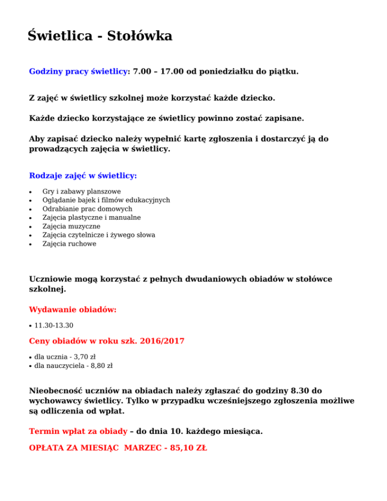 Świetlica - Stołówka Godziny pracy świetlicy: 7.00 – 17.00 od poniedziałku do piątku. Z zajęć w świetlicy szkolnej może korzystać każde dziecko. Każde dziecko korzystające ze świetlicy powinno zostać zapisane. Aby zapisać dziecko należy wypełnić kartę zgłoszenia i dostarczyć ją do prowadzących zajęcia w świetlicy. Rodzaje zajęć w świetlicy: ● ● ● ● ● ● ● Gry i zabawy planszowe Oglądanie bajek i filmów edukacyjnych Odrabianie prac domowych Zajęcia plastyczne i manualne Zajęcia muzyczne Zajęcia czytelnicze i żywego słowa Zajęcia ruchowe Uczniowie mogą korzystać z pełnych dwudaniowych obiadów w stołówce szkolnej. Wydawanie obiadów: ● 11.30-13.30 Ceny obiadów w roku szk. 2016/2017 ● ● dla ucznia - 3,70 zł dla nauczyciela - 8,80 zł Nieobecność uczniów na obiadach należy zgłaszać do godziny 8.30 do wychowawcy świetlicy. Tylko w przypadku wcześniejszego zgłoszenia możliwe są odliczenia od wpłat. Termin wpłat za obiady – do dnia 10. każdego miesiąca. OPŁATA ZA MIESIĄC MARZEC - 85,10 ZŁ Numer konta wpłat za obiady 7615 6000 1323 2715 6040 000001 z dopiskiem, nazwisko i imię dziecka, klasa, za obiady w m-cu