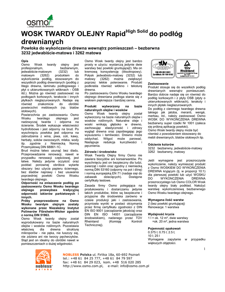WOSK TWARDY OLEJNY RapidHigh Solid do podłóg drewnianych Powłoka do wykończenia drewna wewnątrz pomieszczeń – bezbarwna 3232 jedwabiście-matowa i 3262 matowa Opis Osmo Wosk twardy olejny jest profesjonalnym, bezbarwnym, jedwabiście-matowym (3232) lub matowym (3262) produktem do wykończenia podłóg, stosowanym do wszystkich podłóg drewnianych (podłóg z litego drewna, laminatu podłogowego i płyt o ukierunkowanych włóknach - OSB itd.). MoŜna go równieŜ zastosować na podłogach korkowych, terakocie i innych płytkach nieglazurowanych. Nadaje się równieŜ znakomicie do obróbki powierzchni meblowych (np. blatów stołowych). Powierzchnia po zastosowaniu Osmo Wosku twardego olejnego jest nadzwyczaj twarda i odporna na ścieranie. Środek wykazuje właściwości hydrofobowe i jest odporny na brud. Po wyschnięciu powłoka jest odporna na zabrudzenia z wina, piwa, coli, kawy, herbaty, soków owocowych, mleka, wody itp. zgodnie z Niemiecką Normą Przemysłową DIN 68861-1C. Brud moŜna łatwo usunąć bez śladu. Przeprowadzanie renowacji, nawet w przypadku renowacji częściowej, jest łatwe. NaleŜy jedynie oczyścić oraz poddać ponownej obróbce wytarte obszary: bez uŜycia papieru ściernego, bez śladów naprawy i bez usuwania poprzedniej powłoki Osmo Wosku twardego olejnego. Odporność na zniszczenie podłóg po zastosowaniu Osmo Wosku twardego olejnego przewyŜsza tradycyjną odporność lakierów parkietowych i innych. Próby przeprowadzone na Osmo Wosku twardym olejnym zostały wykonane przez NiezaleŜny Instytut Polimerów Flörsheim-Wicker zgodnie z normą DIN 51963. Osmo Wosk twardy olejny został wyprodukowany na bazie naturalnych olejów i wosków roślinnych. Pozostawia właściwą dla drewna strukturę mikroporów - nie pęka, nie łuszczy się, nie zdziera ani nie tworzy pęcherzyków. Stąd jest on idealny do obróbki nawet w pomieszczeniach o duŜej wilgotności. Osmo Wosk twardy olejny jest bardzo prosty w uŜyciu: wystarczą jedynie dwie warstwy bez powłoki gruntującej!). Ma on kremową konsystencję (tiksotropowy). Połysk jedwabisto-matowy (3232) lub matowy (3262) moŜna zwiększyć poprzez lekkie polerowanie. Produkt podkreśla równieŜ włókno i teksturę drewna. Po zastosowaniu Osmo Wosku twardego olejnego drewniana podłoga stanie się z wiekiem piękniejsza i bardziej cenna. Produkt wytworzony na bazie naturalnych olejów i wosków Osmo Wosk twardy olejny został wytworzony na bazie naturalnych olejów i wosków roślinnych. Naturalne oleje i woski wnikają głęboko w drewno, zachowując elastyczność i zdrowy wygląd drewna oraz zapobiegając jego wysuszeniu i łamliwości. Drewno moŜe oddychać. Wilgoć moŜe parować. Następuje redukcja kurczliwości i pęcznienia. Zdrowie i środowisko Wosk Twardy Olejny firmy Osmo nie zawiera biocydów ani konserwantów. Po wyschnięciu jest on bezpieczny dla ludzi, zwierząt i roślin oraz zgodny z niemiecką normą DIN 53160 (odporny na pot i ślinę) i normą europejską EN 71 (nadaje sięi do zabawek dziecięcych). Dostępne certyfikaty testowe. Zasada firmy Osmo polegająca na produkowaniu i dostarczaniu jedynie takich produktów, które są bezpieczne i przyjazne dla środowiska zarówno w czasie produkcji jaki i zastosowania, przyniosła wyniki w postaci otrzymania przez firmę certyfikatu zgodności z DIN EN ISO 9001 (zarządzanie jakością) oraz DIN EN ISO 14001 (zarządzanie środowiskiem), nadanego przez TÜV Rheinland (Komisję Kontroli Technicznej). Zastosowanie Produkt stosuje się do wszelkich podłóg drewnianych wewnątrz pomieszczeń. Bardzo dobrze nadaje się on równieŜ do podłóg korkowych i z płyty OSB (płyty o ukierunkowanych włóknach), terakoty i innych płytek nieglazurowanych. Do podłóg z ciemnego twardego drewna takiego jak jatoba, meranti, wengé, merbau, itd., naleŜy zastosować Osmo WOSK DO WYKOŃCZENIA DREWNA bezbarwny super rzadki Nr 1001 (zaleca się próbną aplikację powłoki). Osmo Wosk twardy olejny moŜe być równieŜ z powodzeniem stosowany do mebli drewnianych, blatów stołowych itp. Odcienie kolorów 3232 bezbarwny, jedwabiście-matowy 3262 bezbarwny, matowy Jeśli wymagane jest przezroczyste wykończenie, naleŜy wymieszać produkt z Osmo WOSKIEM DO WYKOŃCZENIA DREWNA kryjącym (tj. w proporcji 10:1) dla pierwszej powłoki lub uŜyć WOSKU DO WYKONCZENIA DREWNA przezroczystego lub Osmo COLOR Wosk twardy olejny biały podkład. NałoŜyć warstwę wykończeniową bezbarwnego Osmo Wosku twardego olejnego. Wymagana ilość warstw 2 (bez powłoki gruntującej) Renowacja: 1 warstwa Wydajność krycia 1 l = ok. 12 m², dwie warstwy =ok. 20 m², jedna warstwa Pojemność opakowań 0.375 l; 0.75 l; 2.5 l; 10 l; 25 l Wymagane zapytanie większych objętości. w przypadku 1 NOBLESS Polska ul. Firlika 18a, 60-692 Poznań tel.: +48 61 84 25 777, +48 61 84 79 597 fax: +48 61 84 29 023, kom. +48 516 020 285 http://www.osmo.com.pl, e-mail: [email protected] WOSK TWARDY OLEJNY RapidHigh Solid do podłóg drewnianych Powłoka do wykończenia drewna wewnątrz pomieszczeń – bezbarwna 3232 jedwabiście-matowa i 3262 matowa Przygotowanie Powierzchnia drewna, korka lub płyty OSB musi być czysta i sucha (o maksymalnej zawartości wilgoci 20%). Niewielkie wgniecenia i otwory w drewnie moŜna wypełnić produktem Osmo Pastą do drewna. Produkt nakładać jedynie na powierzchnię pozbawioną śladów zmroŜenia. Starsze powłoki nie zatykające porów naleŜy oczyścić lub delikatnie wyrównać papierem ściernym. Usunąć stare lakiery (przy uŜyciu produktu Osmo Środka do usuwania starych farb i lakierów lub papieru ściernego). W razie potrzeby wyrównać powierzchnię przed aplikacją drobnoziarnistym papierem ściernym (maksymalna ziarnistość: 150) i dokładnie usunąć kurz. W przypadku drewna naraŜonego na siniznę w wilgotnym otoczeniu (np. drewna sosnowego) zaleca się wykonanie obróbki wstępnej (moŜliwie na wszystkich stronach drewna) przy